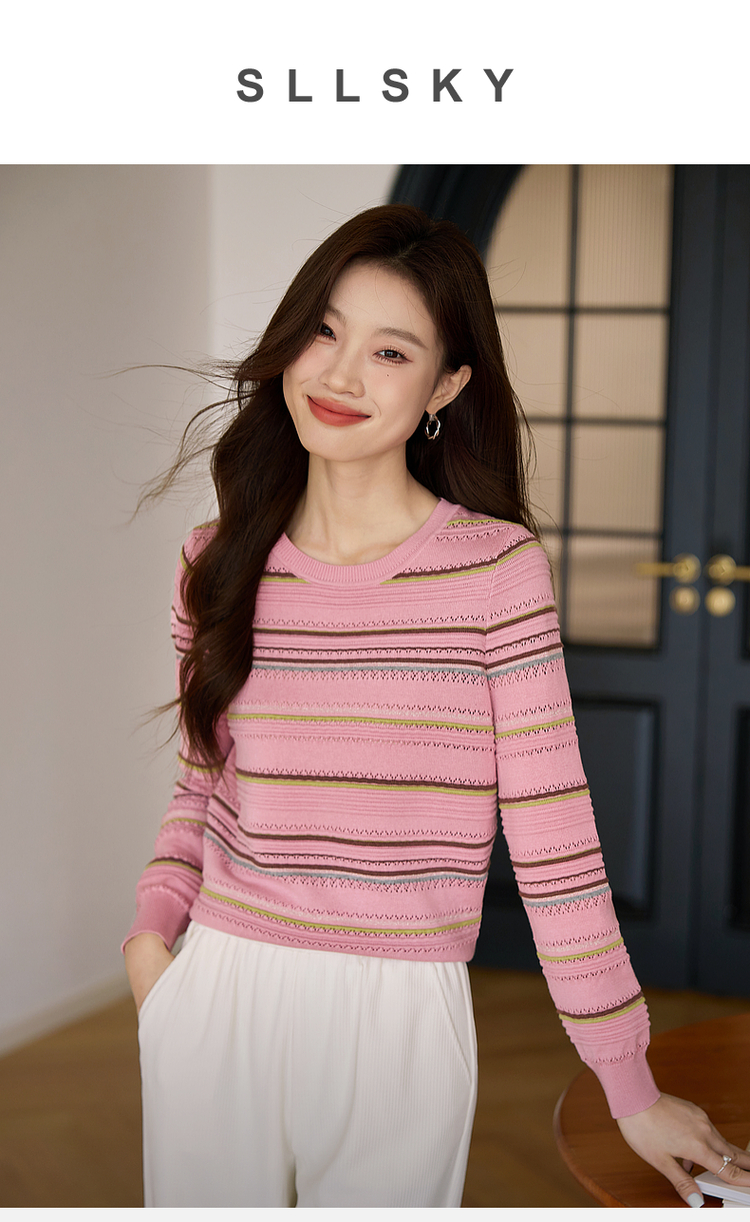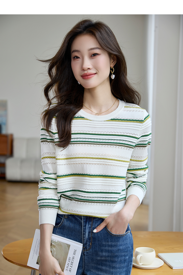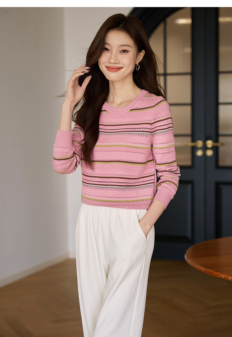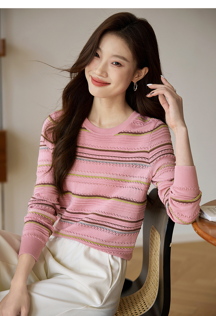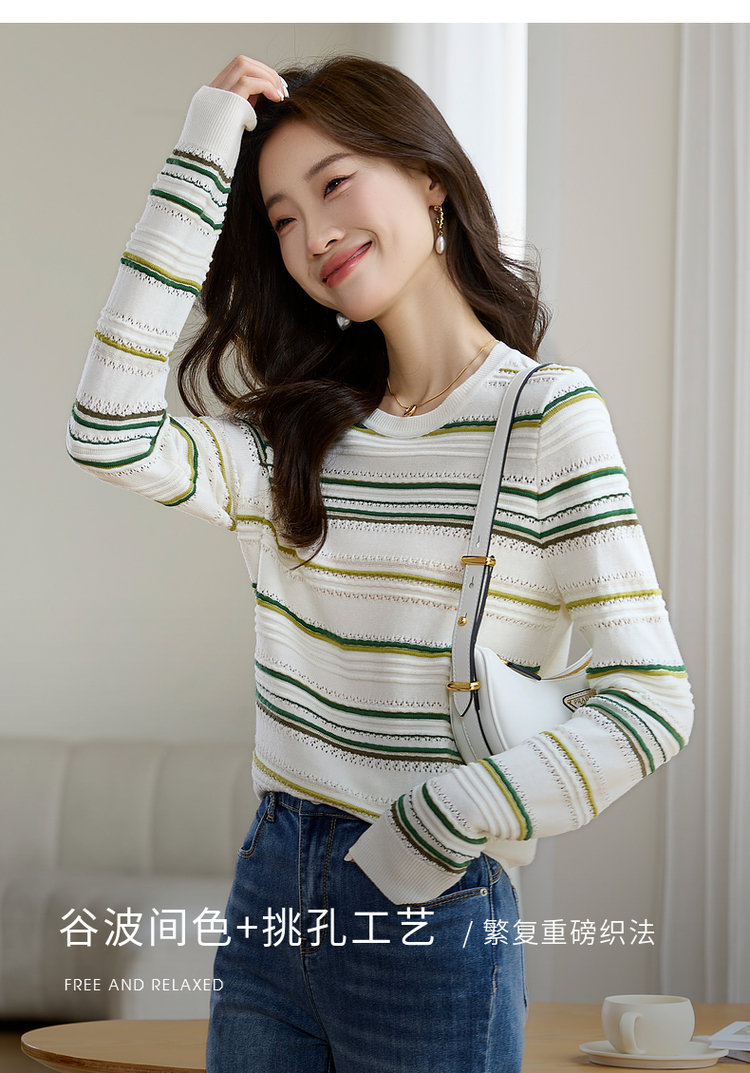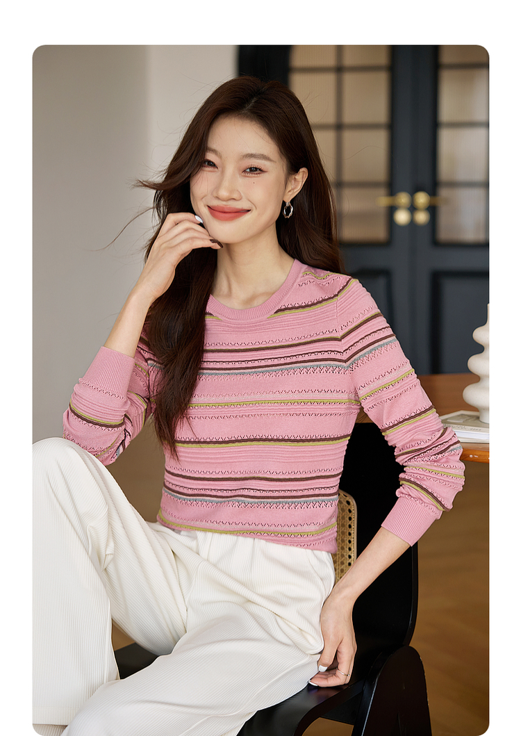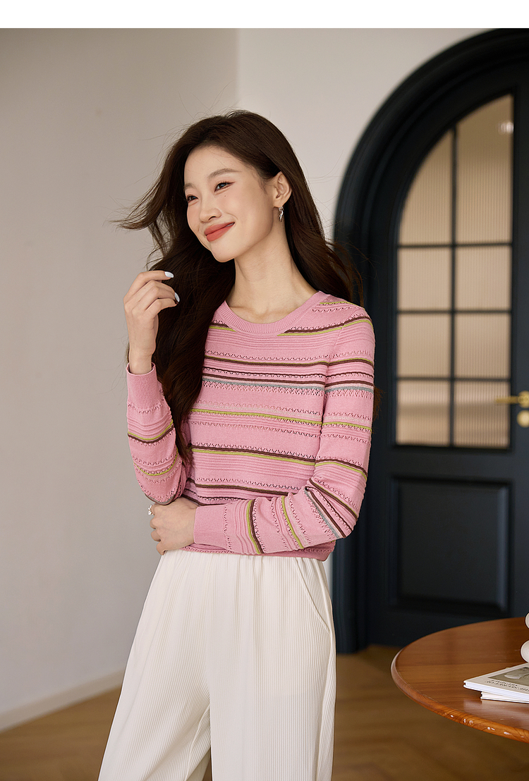 【年终特卖】熙世界多巴胺条纹打底针织衫秋季新款宽松圆领长袖法式撞色上衣