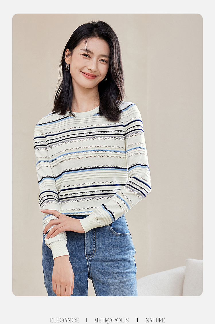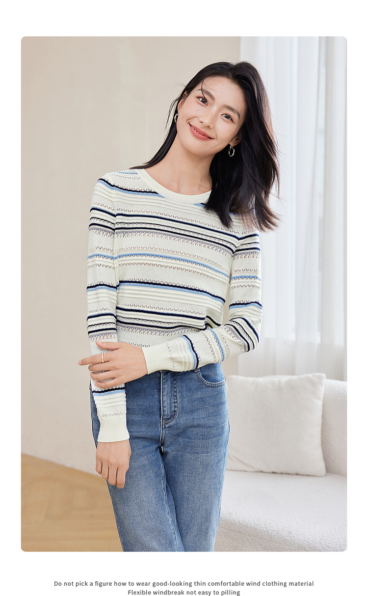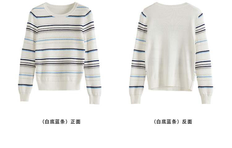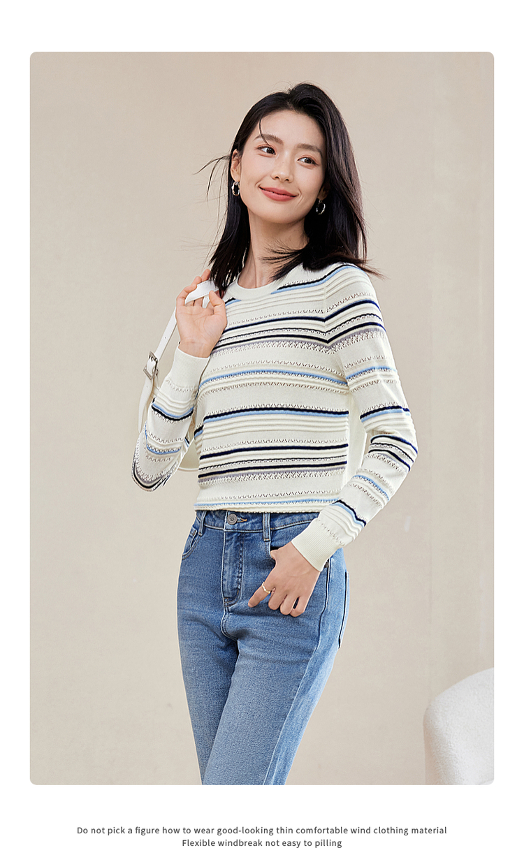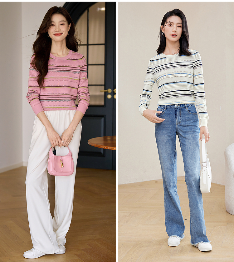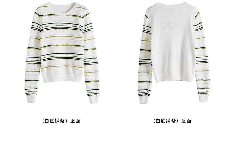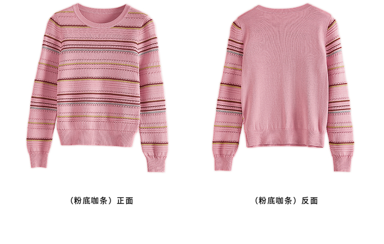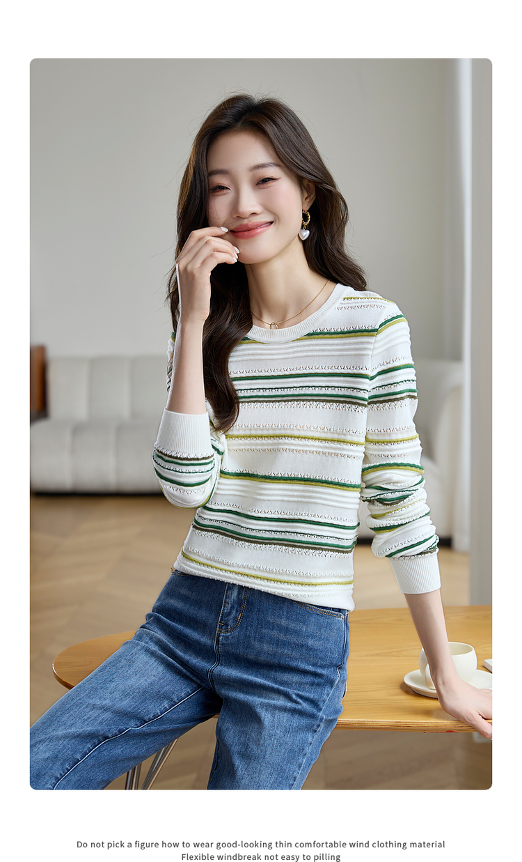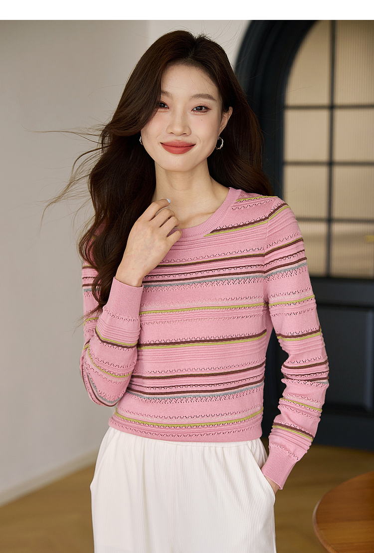 【年终特卖】熙世界多巴胺条纹打底针织衫秋季新款宽松圆领长袖法式撞色上衣