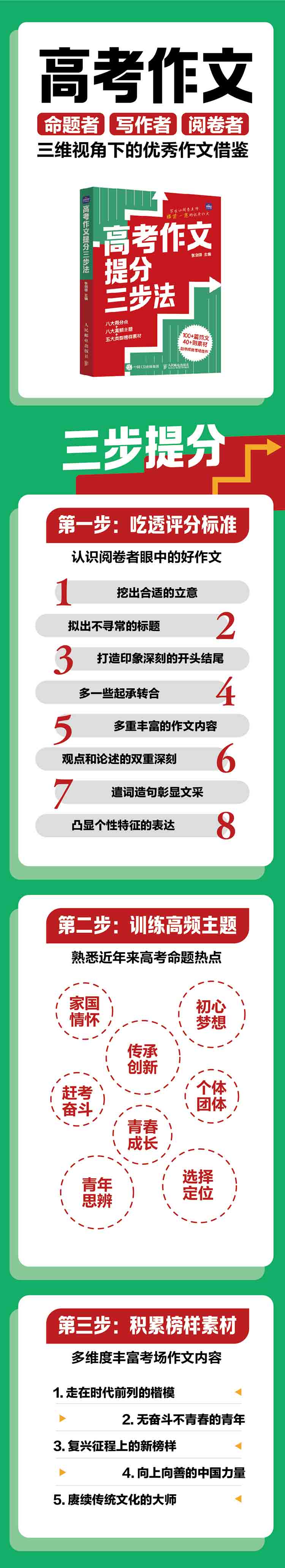 本书整合高考作文备考的不同维度,将命题者、写作者、阅卷者放在一个视角——作文范本下,给考生以*借鉴。 提分*步:八大得分点凸显阅卷者眼中的好作文流程。 提分*步:八大高频主题见证高考命题热点下的好作文范本。 提分第三步:五大类型榜样素材多维度助力考生积累借鉴。 书中有考场范文、高考好题和高考作文*榜样素材,可以帮助考生摆脱固定模式,因题而设,拟定写作提纲,在考场上写出好作文。 本书适合高中学生及其家长,以及中学语文教师阅读。