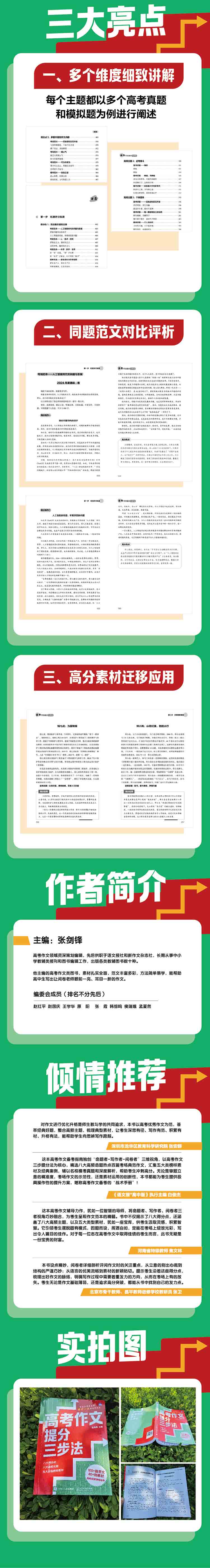 主编:张剑锋 高考作文领域策划编辑,先后供职于语文报社和新作文杂志社,长期从事中小学教辅类报刊和图书编辑工作,出版各类教辅图书数十种。 他主编的高考作文类图书,素材扎实*,范文丰富多彩,方法简单易学,能帮助高中生写出让阅卷老师眼前一亮、耳目一新的作文。