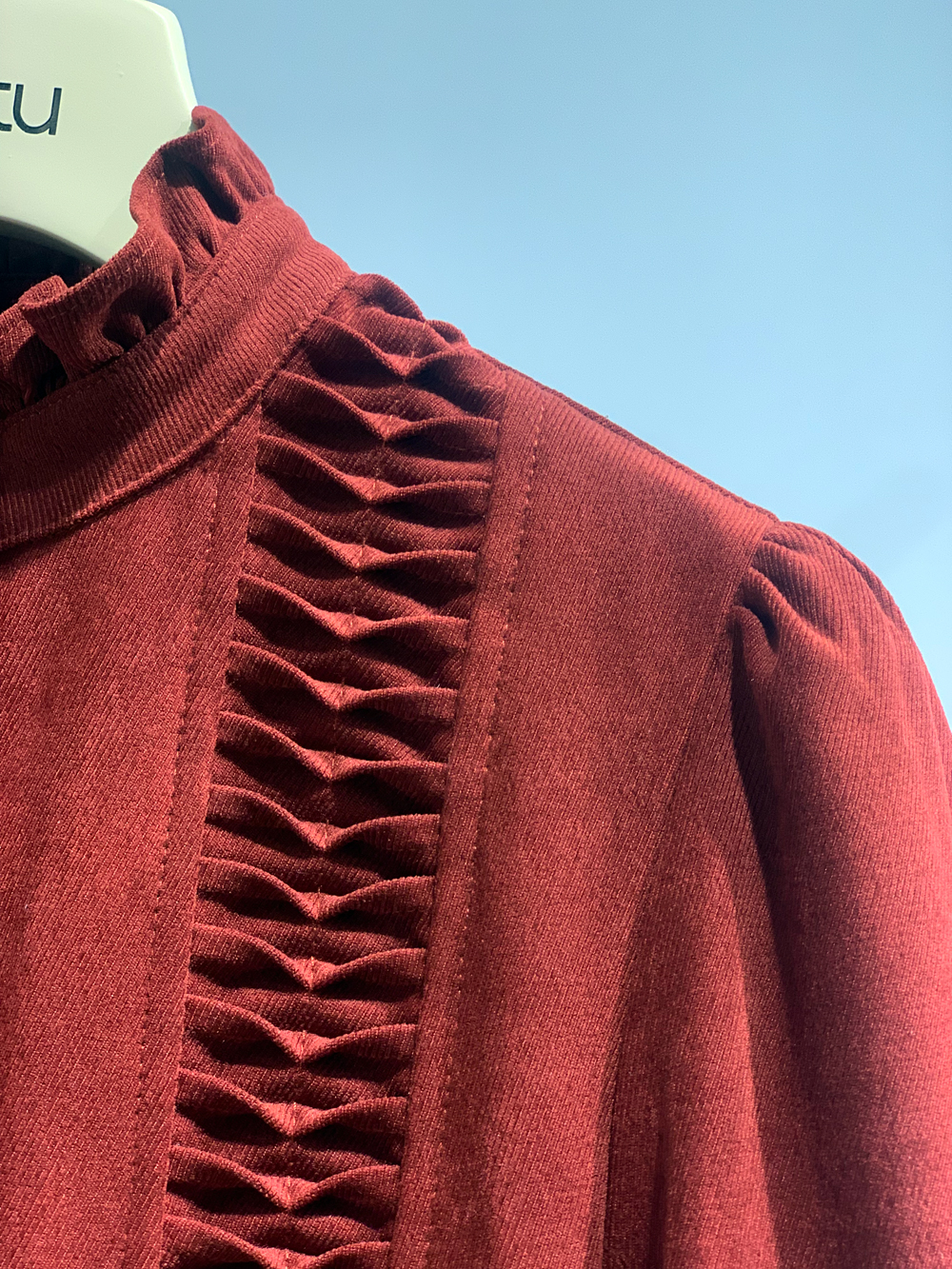 勃艮第红是秋冬经典色,它比较耐看、带点女人味,量感和成熟感也偏重,很适合和复古的面料相结合