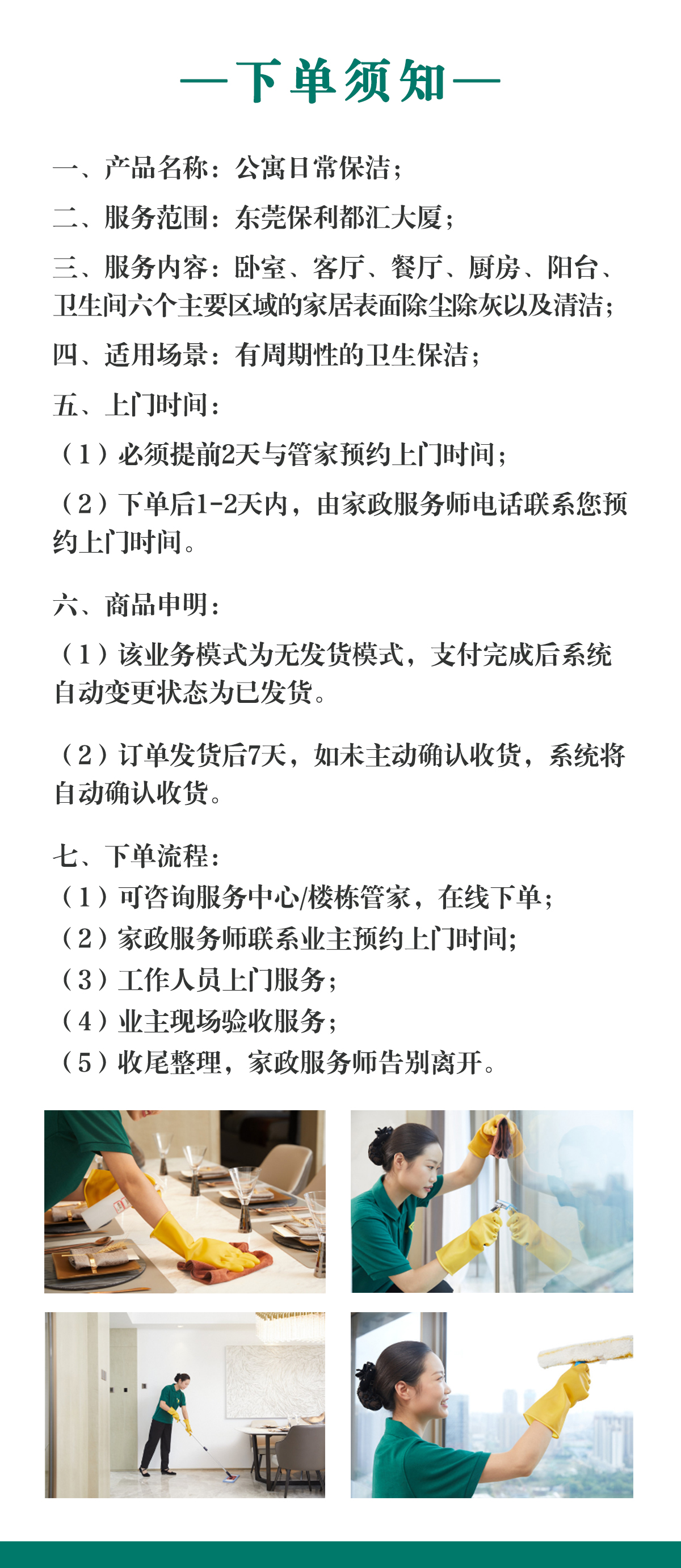 1、仅适用于日常公寓保洁,新房开荒保洁不在服务范围。不可用于学校、办公室、商铺、出(群)租房、新装修房等房子类型保洁。