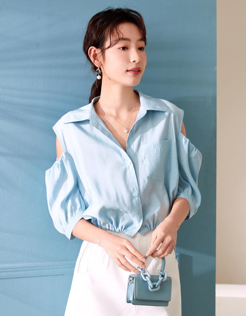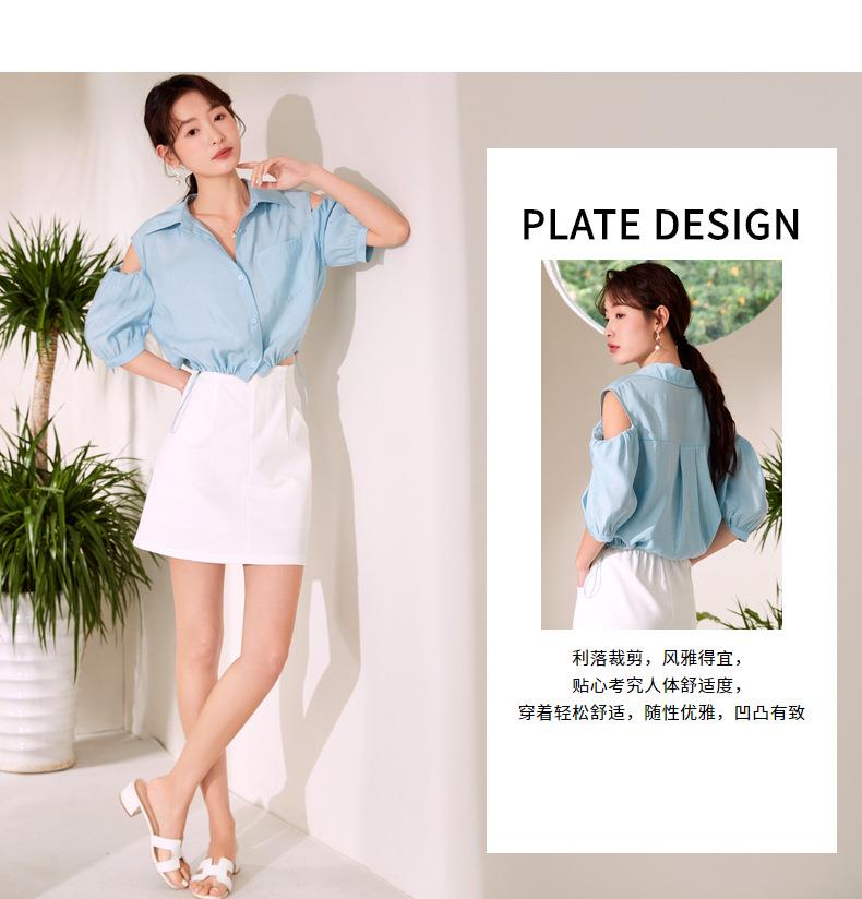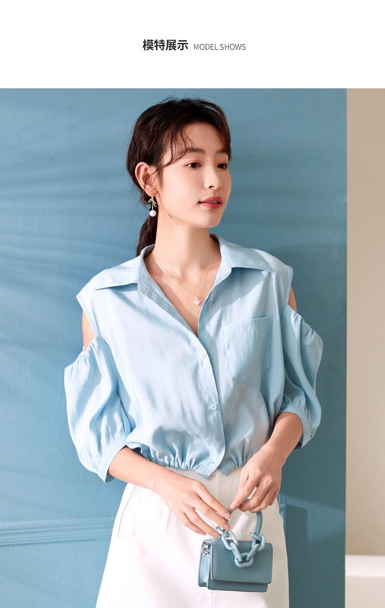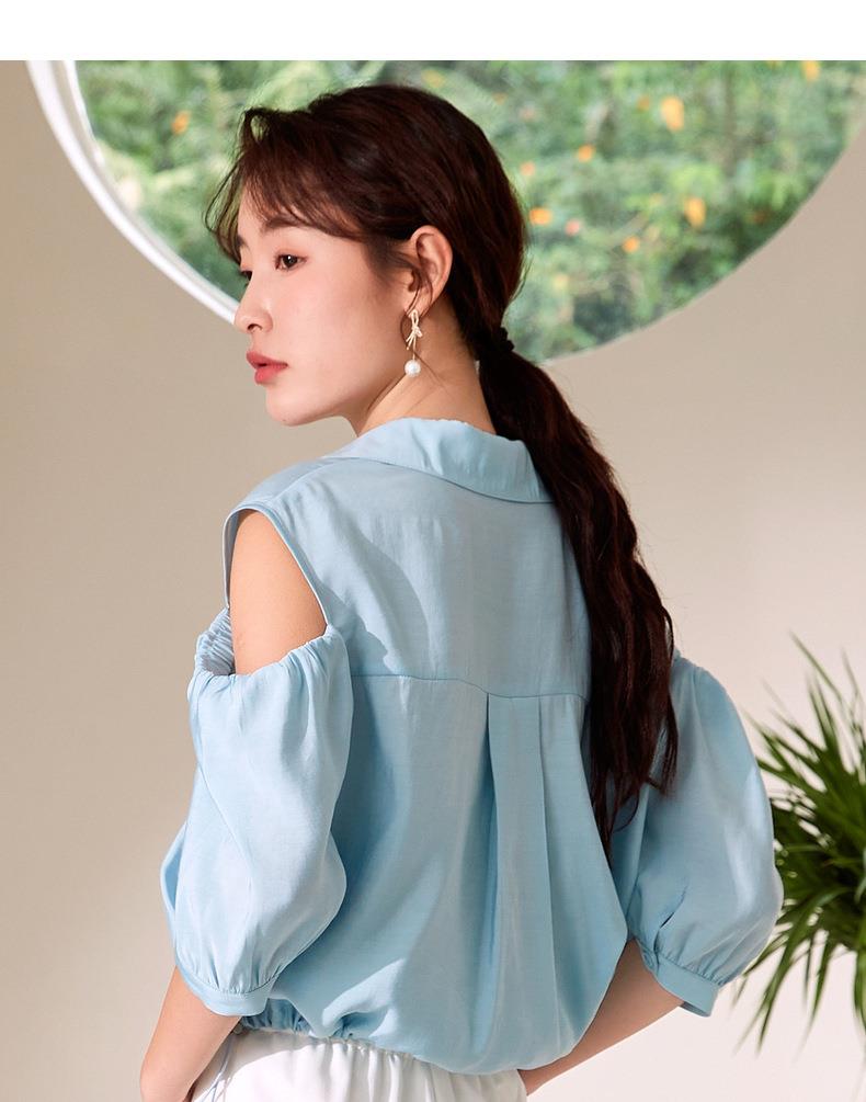 百姿 新款露肩灯笼袖衬衫翻领小众设计感短袖衬衣女装
