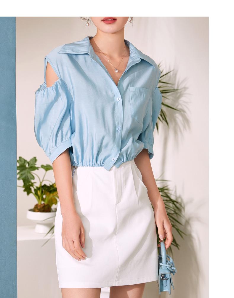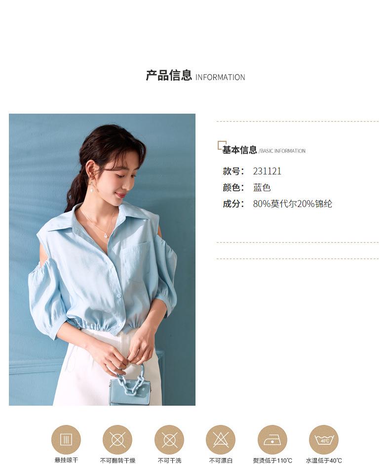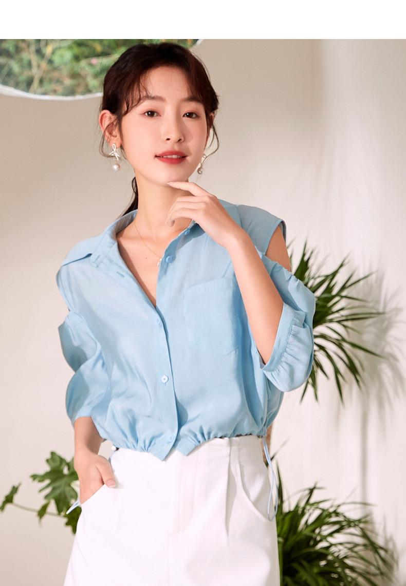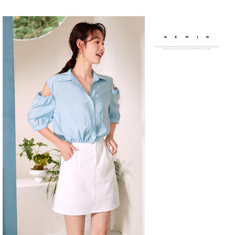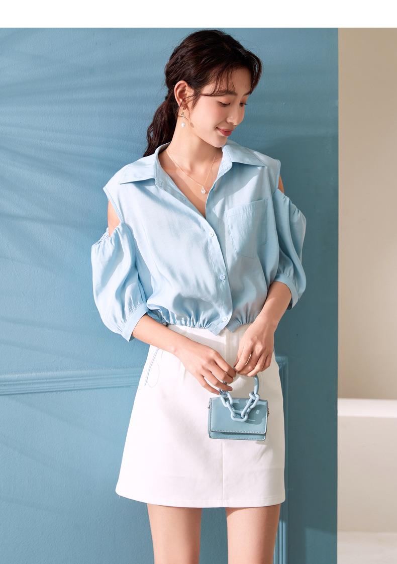 百姿 新款露肩灯笼袖衬衫翻领小众设计感短袖衬衣女装