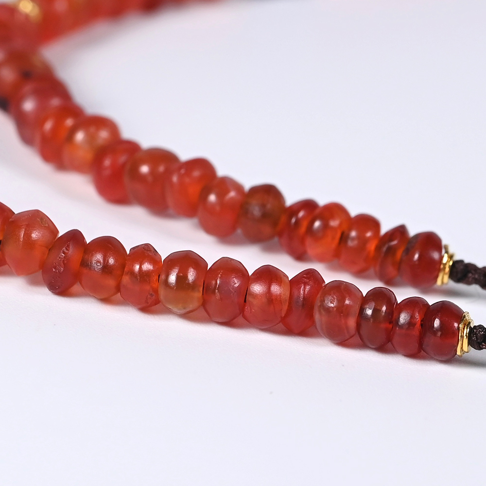 入选的玛瑙珠密度紧实,赤红浓艳,色调正而暖,饱和度高。质地通透莹亮,颗粒饱满,像熟透即将爆浆的果实,阳光下神采飞扬。