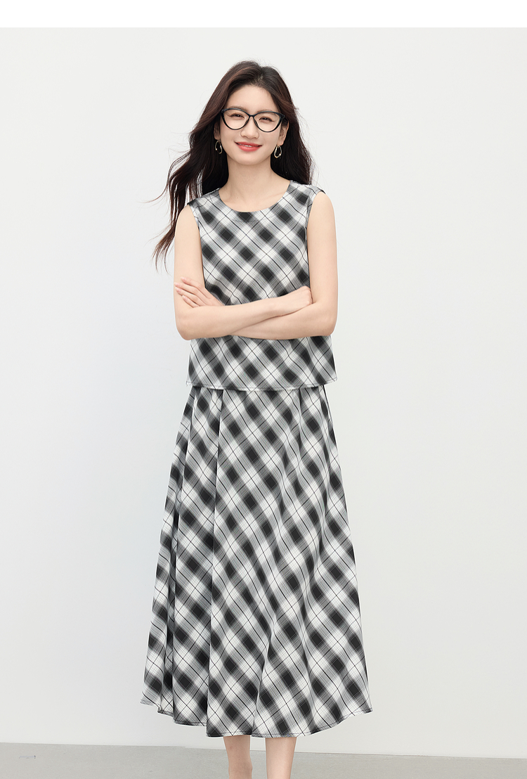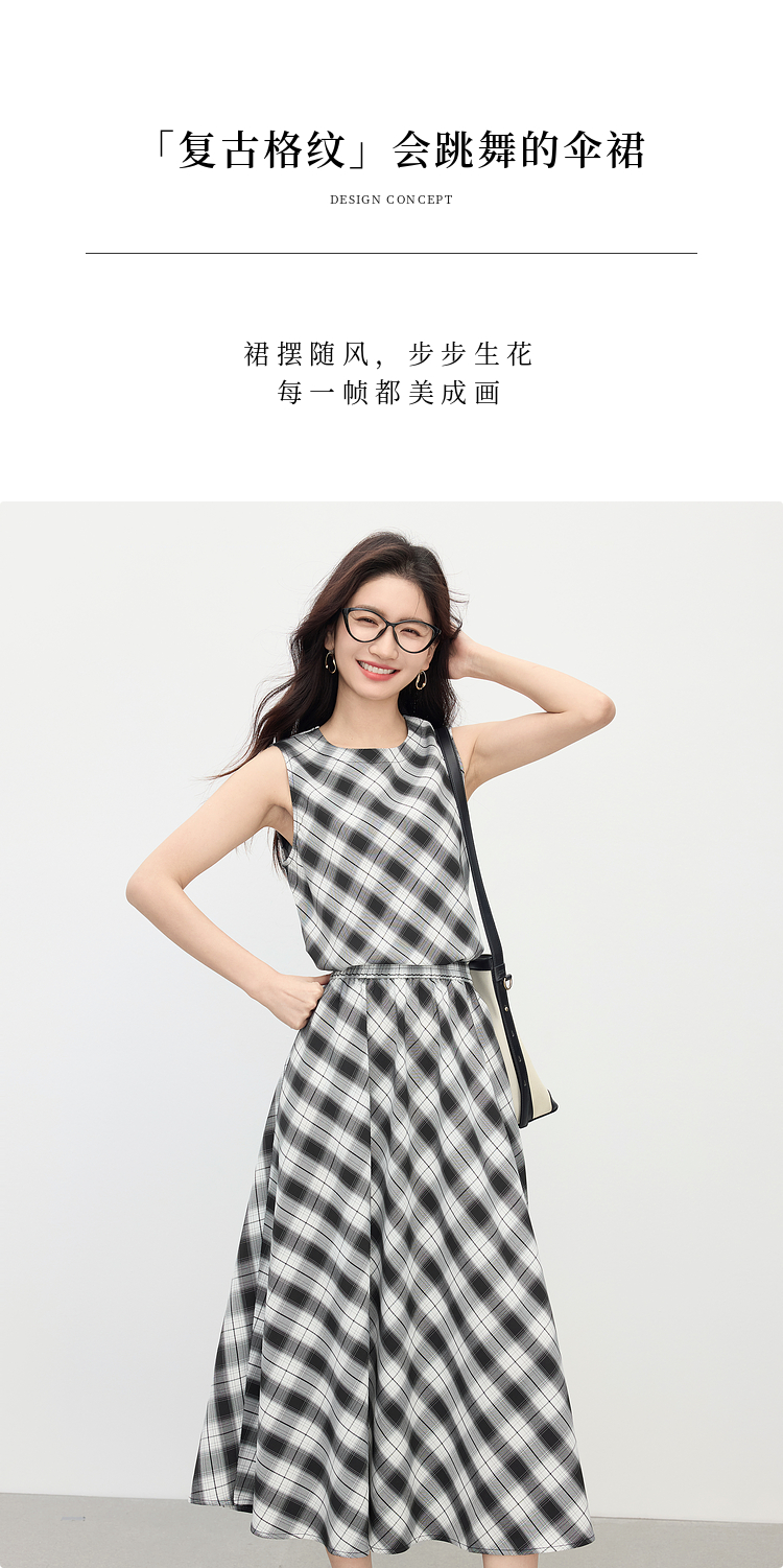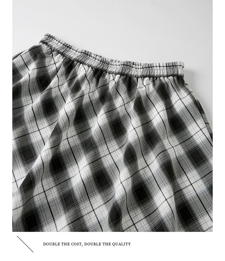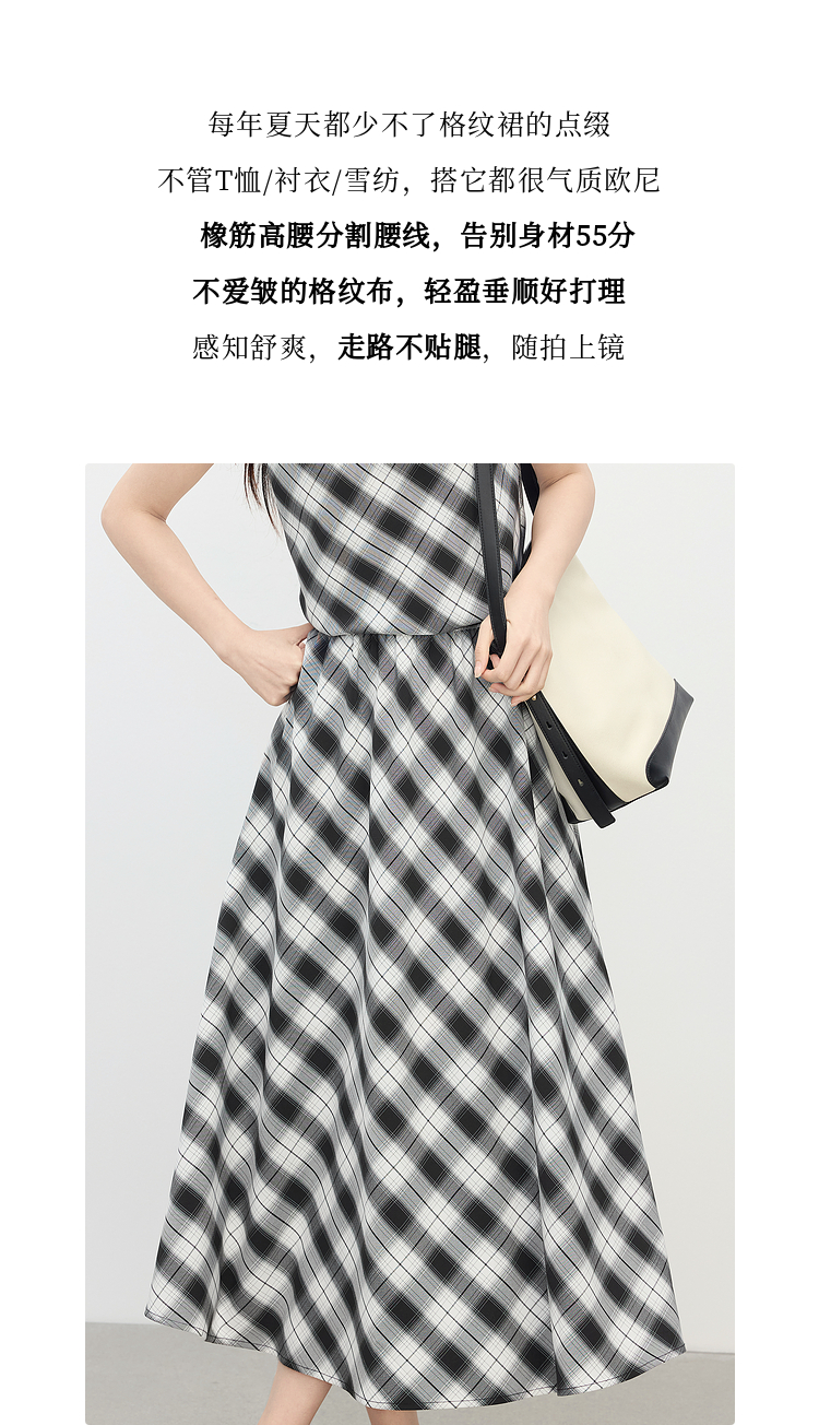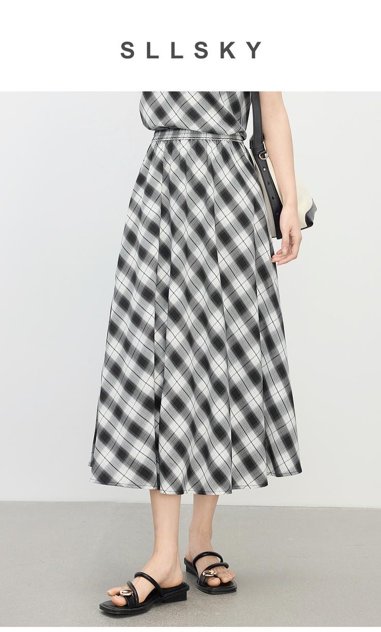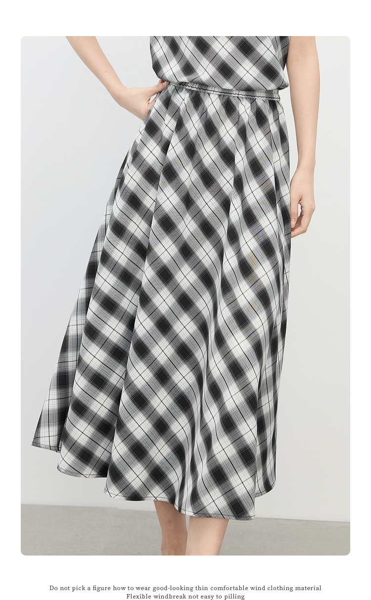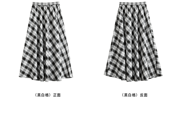 【专属特价】熙世界复古黑白格子半身裙女夏季新款高腰休闲中长款百褶A字伞裙