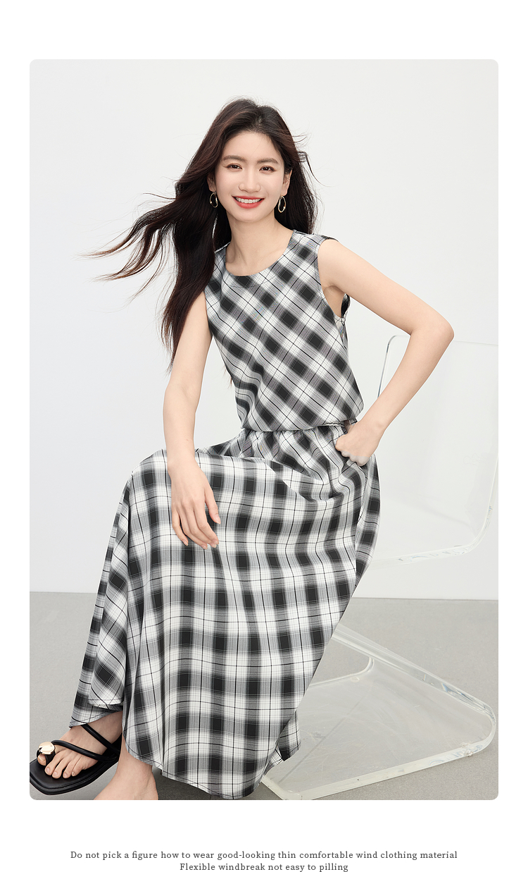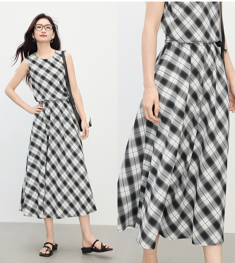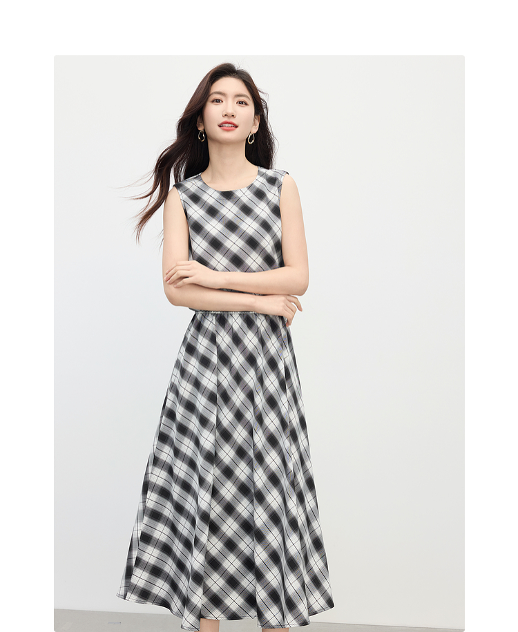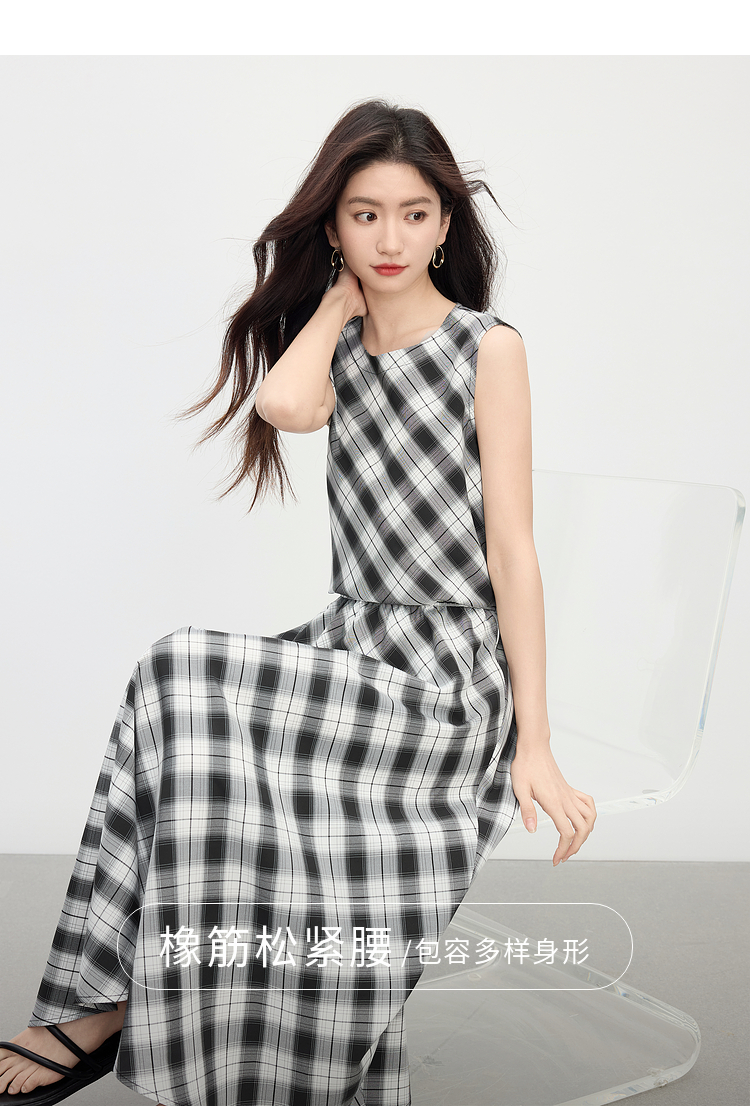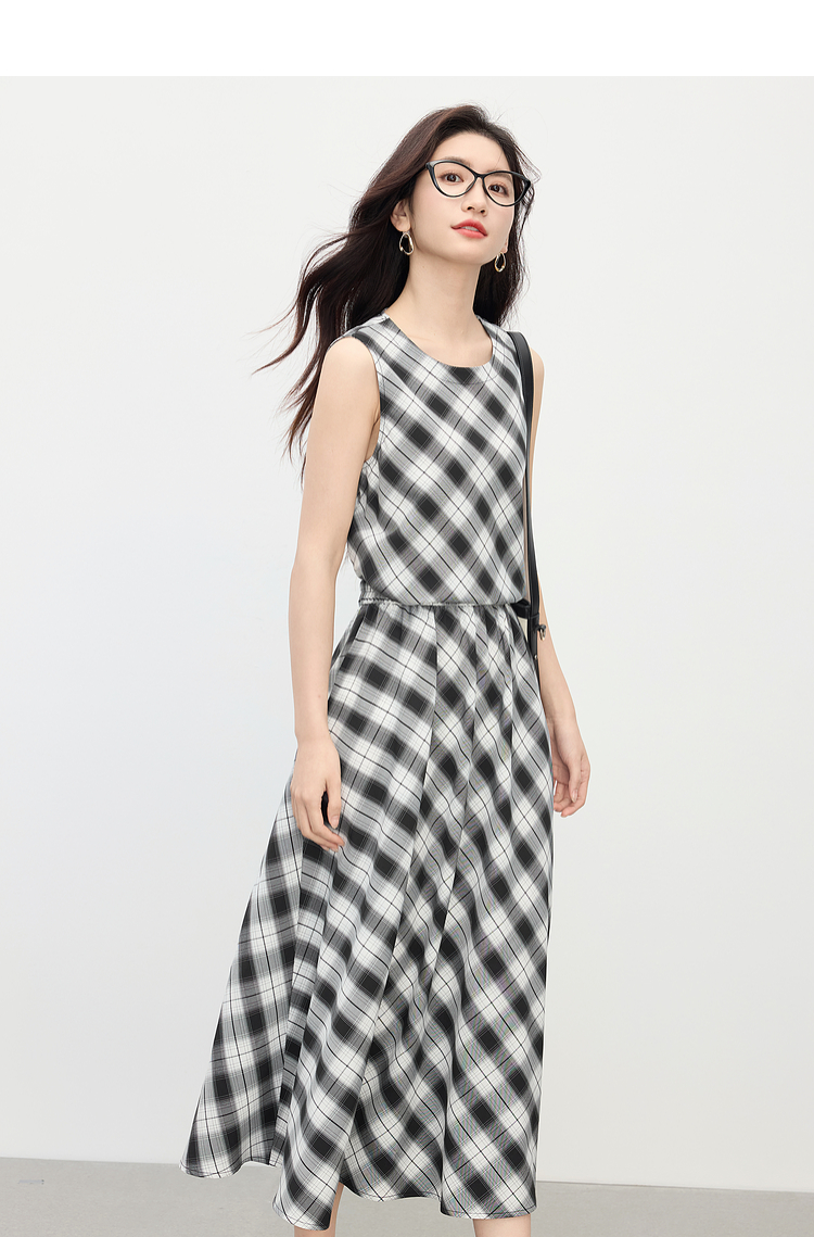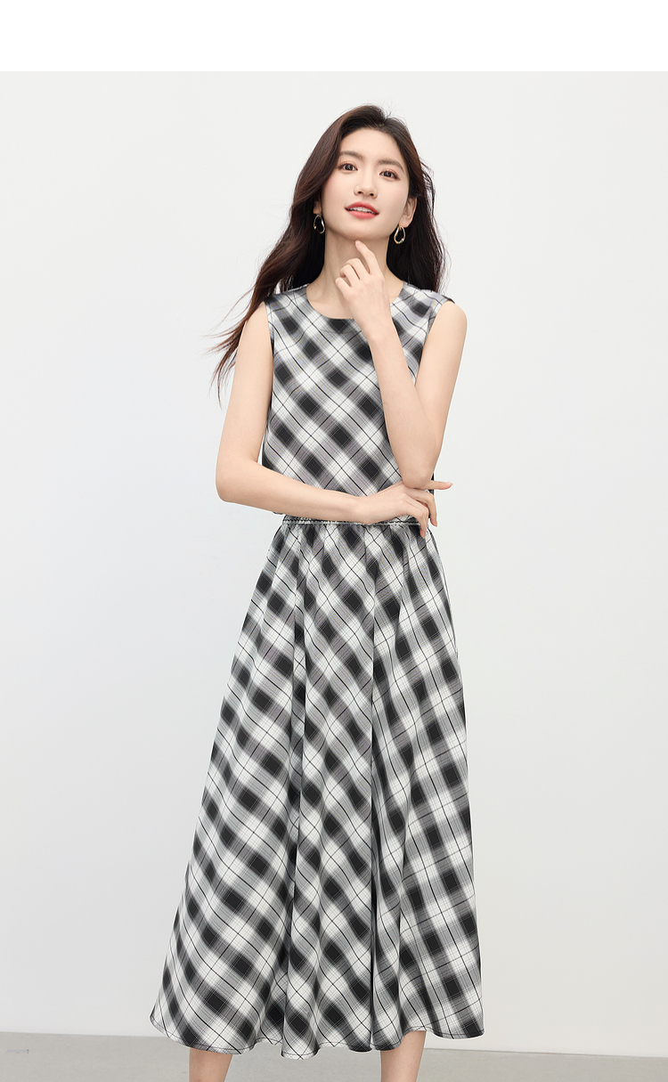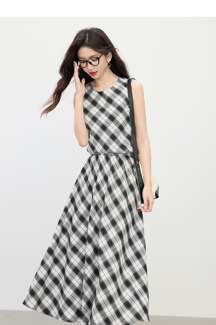 【专属特价】熙世界复古黑白格子半身裙女夏季新款高腰休闲中长款百褶A字伞裙