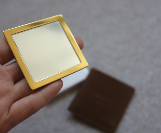 款二 小方形的单面镜 边框和背面 是非常有质感的金色钢质 丝绒的小卡套