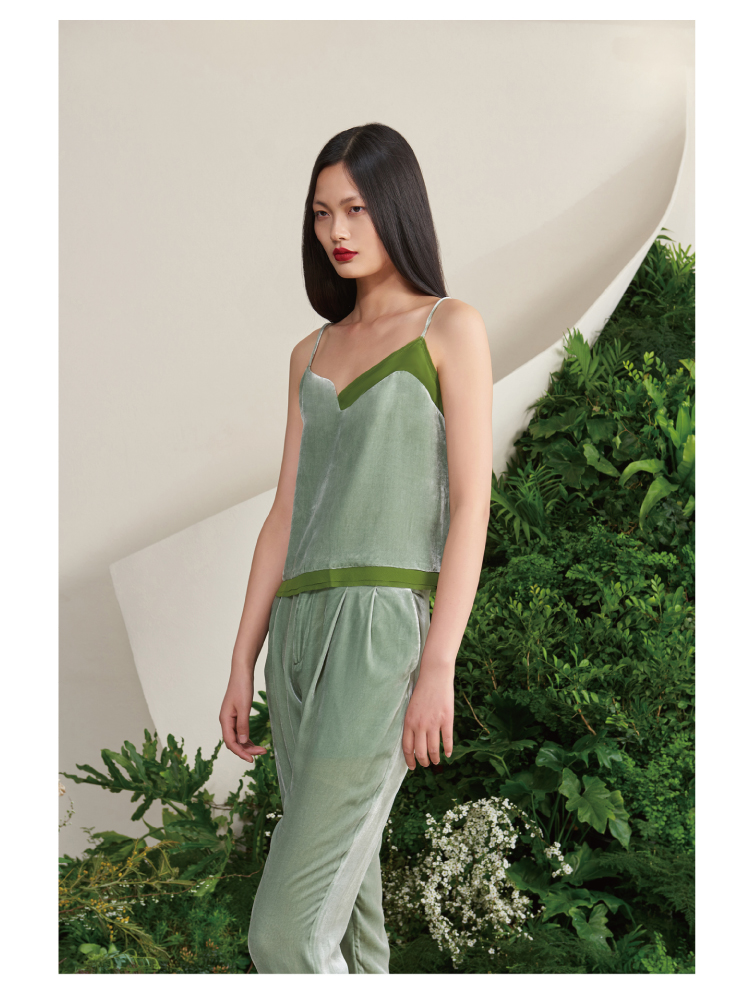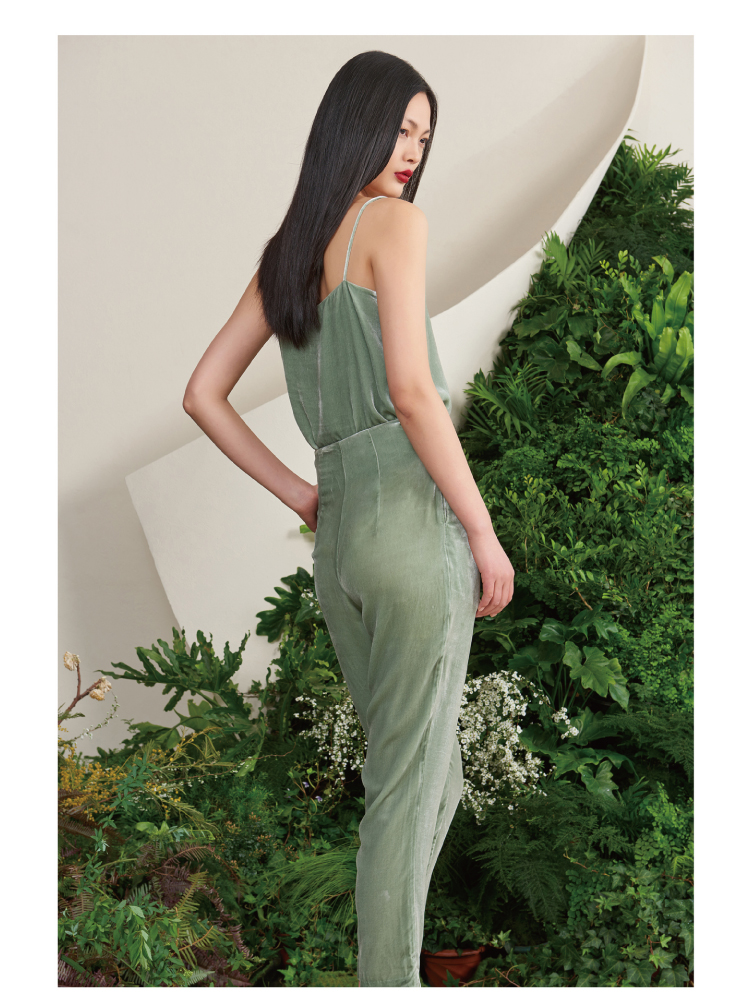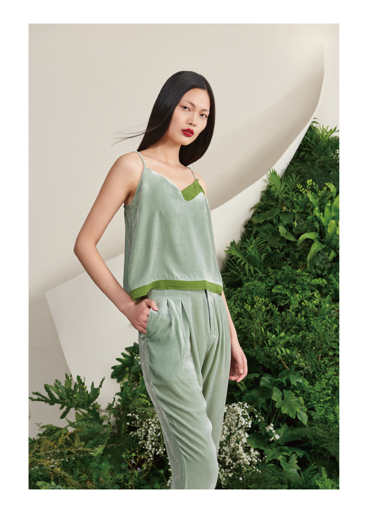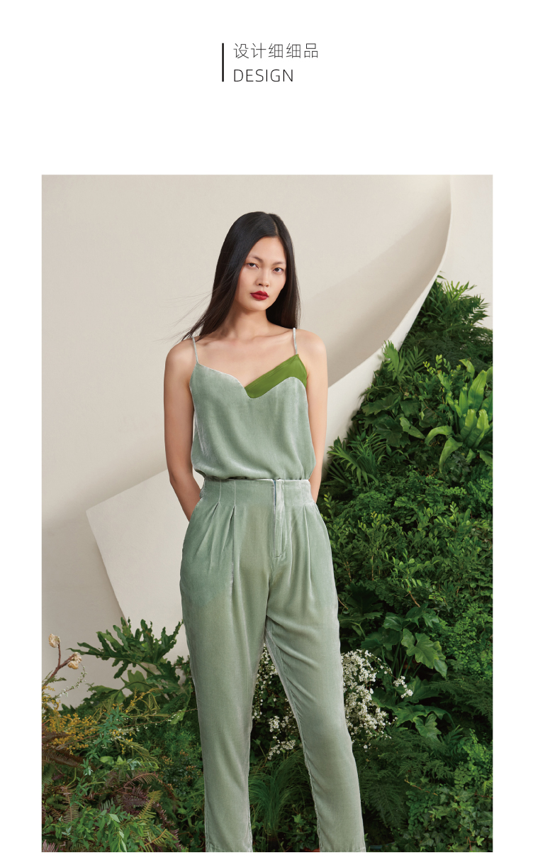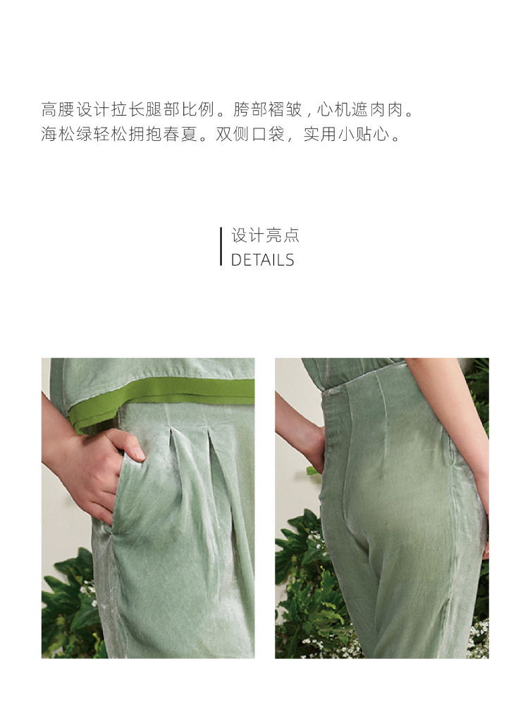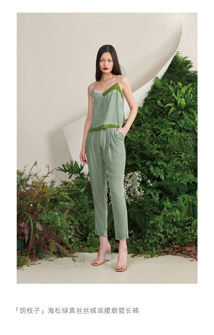 【胡枝子】海松绿真丝丝绒高腰烟管长裤/00094