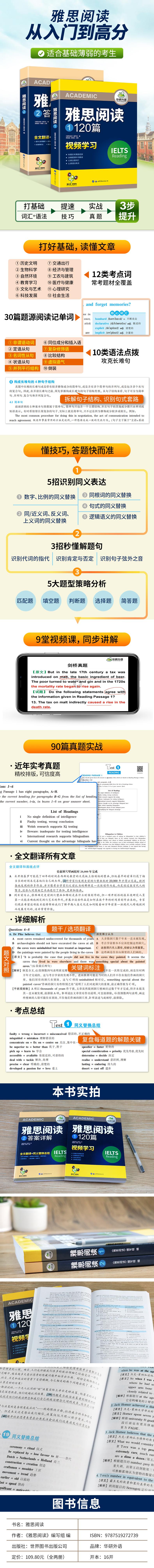 《雅思阅读》适用对象: 初次接触剑桥雅思考试(学术类,A类)的考生;IELTS英语阅读基础薄弱的考生;不熟悉IELTS雅思阅读题型、缺乏阅读训练的考生;想要提高雅思阅读分数的考生;需要进行课堂教学或自测的雅思培训班师生。 推荐理由: 1. 雅思阅读基础入门,夯实词汇与语法两大基础,90篇机经真题阅读大题量训练; 2. 通过分析剑桥雅思真题题库以及机经阅读真题,总结出雅思阅读12类常考主题词汇,快速熟悉常考话题; 3. 精选30篇与真题同源的阅读文章,并提供核心词汇注释和全文翻译,进一步强化雅思阅读高频词汇,了解雅思阅读真题的行文逻辑; 4. 雅思阅读解题句常见的11类句法难点,结合真题实例逐个讲解,教你分析解题句的结构,了解句式转换的原理,识别同义替换; 5. 三大实战应试技巧和5种题型的解题策略,实战应对,冲刺高分; 6. 收集了90篇近年来的实考雅思阅读机经真题,进行精心校对,还原程度几乎与真题一样,配有全文翻译和详细解析,拆解至少1200个考点、精读了1200个解题句; 7. 书内扫码,即可观看知识点同步讲解课程,线上线下学习、随时随地随意切换。