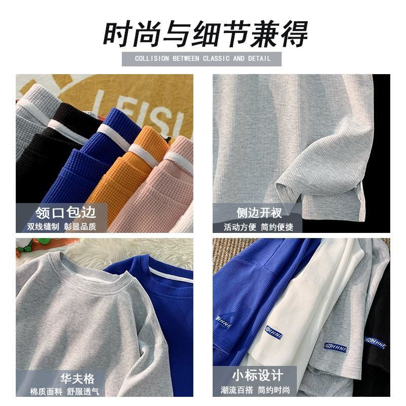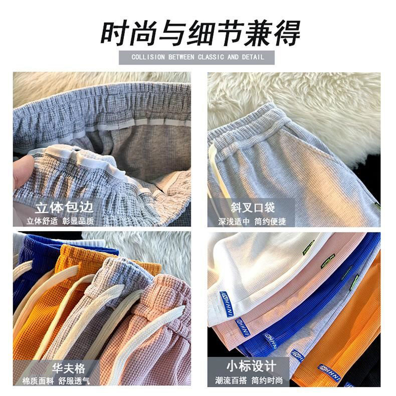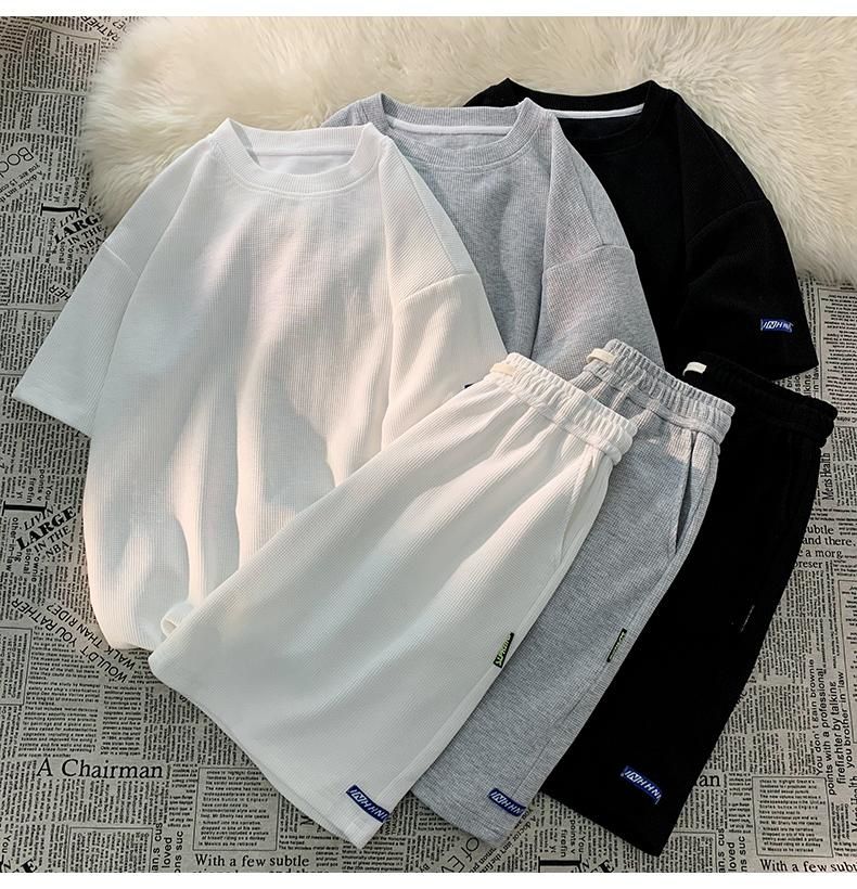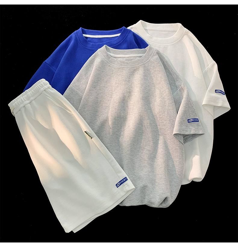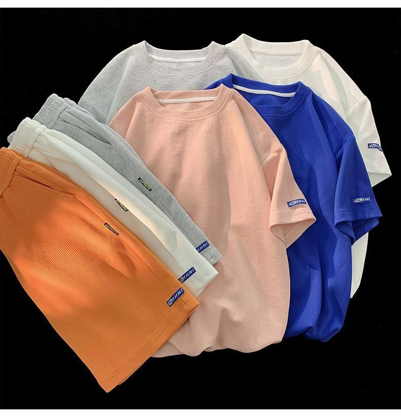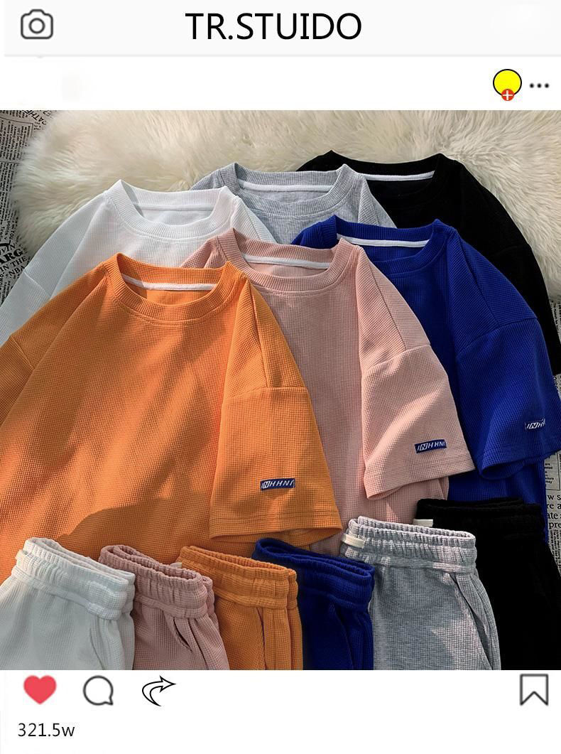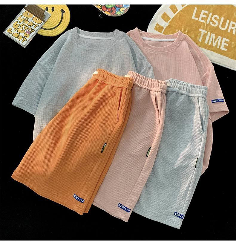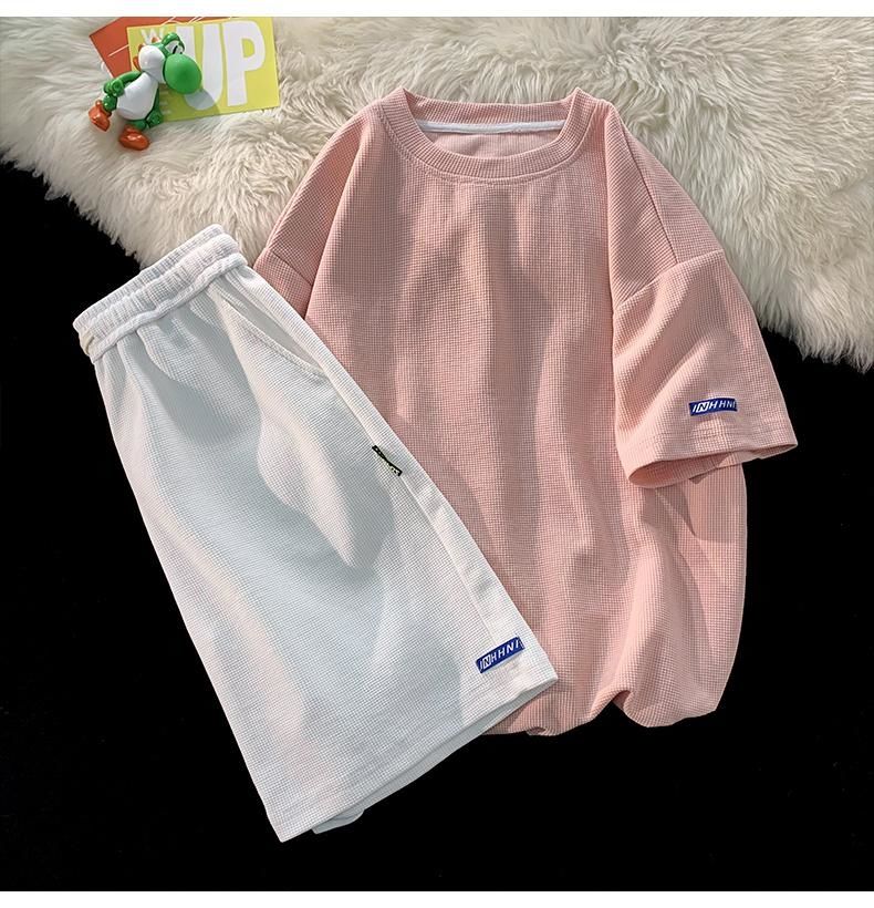 黛唯梵 粉色华夫格运动套装女跑步夏炸街网红短袖短裤两件套2022新款休闲