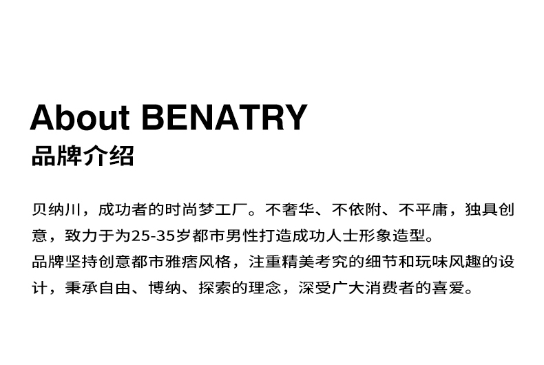 - 贝纳川男装致力于为不盲目追随潮流,坚持自己风格,注重细节与配饰搭配的而立之年轻熟男打造时髦、简约、轻松、真实的着衣风格。