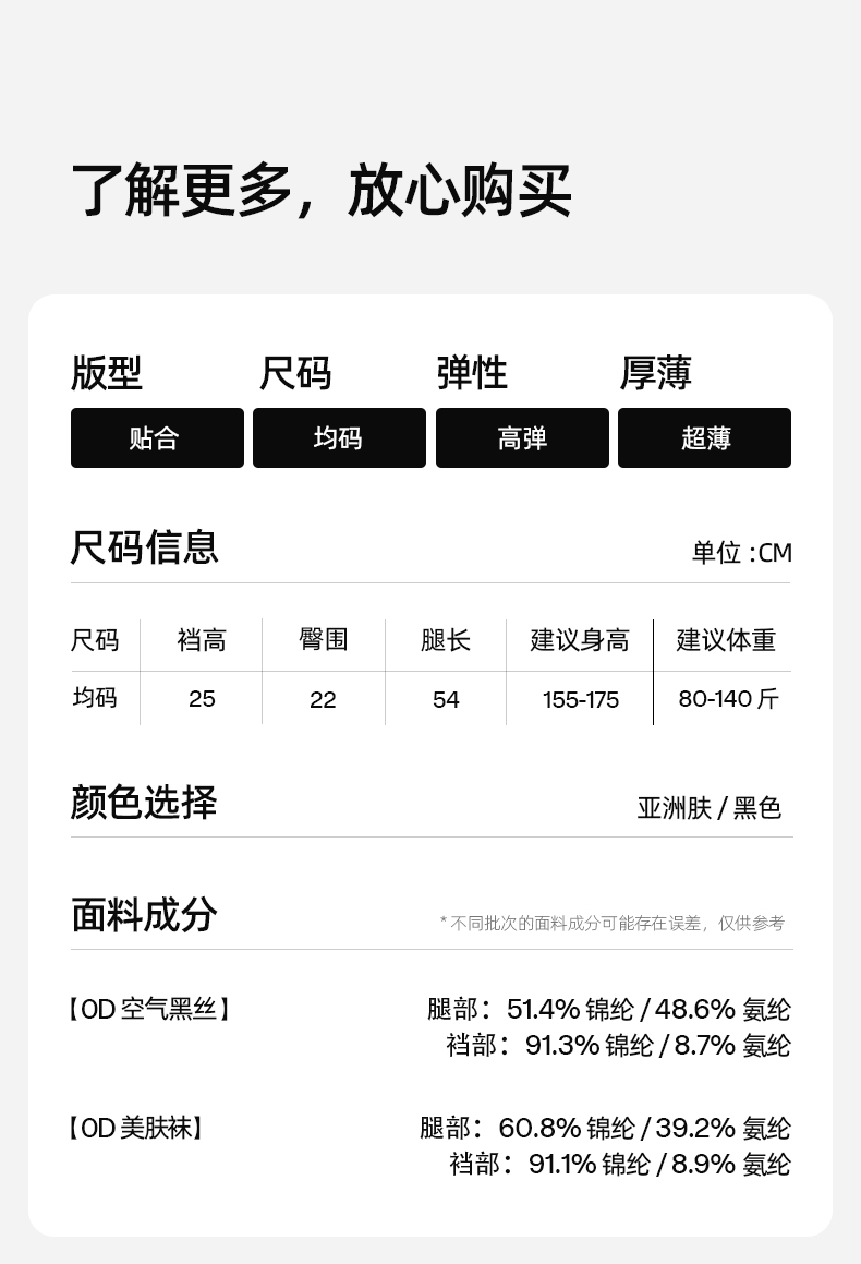 【美腿神器!小野和子美肤袜】0D美肤袜,防磨耐勾 隐形贴肤 肤色/黑色 透气防勾弹力大