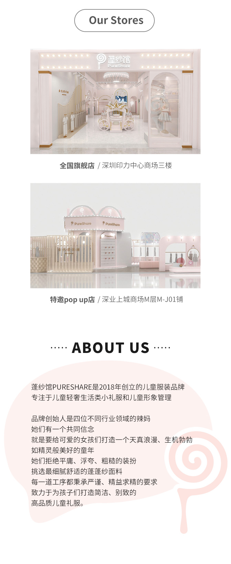 - PureShare蓬纱馆,2018年创立的儿童服装品牌,专注于儿童轻奢生活类小礼服,主张“让孩子做最独特的自己”的品牌理念,为孩子们提供时尚简洁、优雅而又不失童真的生活类礼服。
