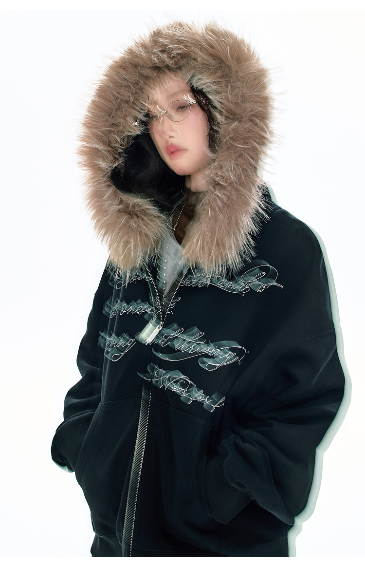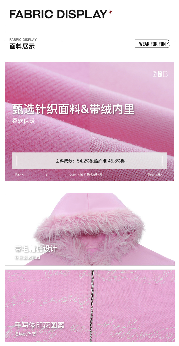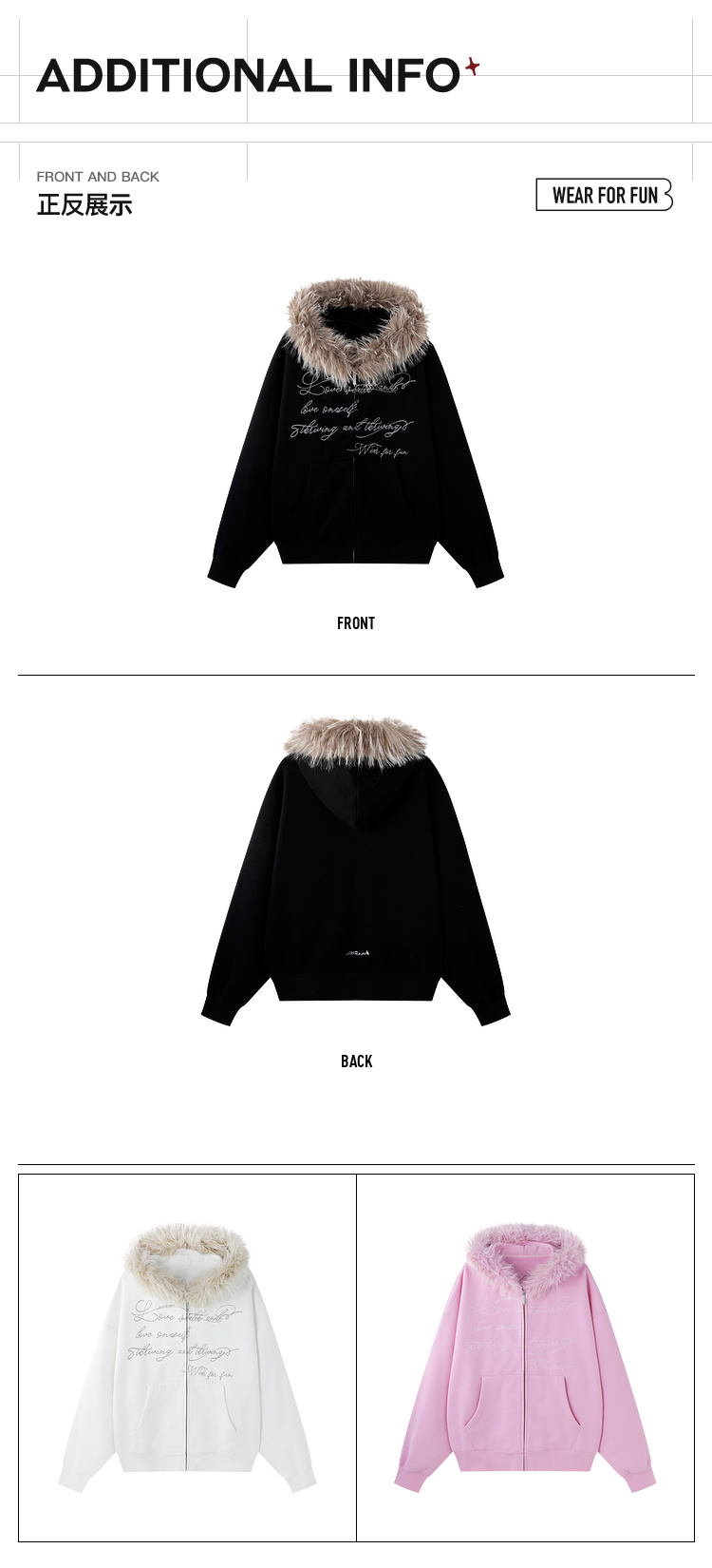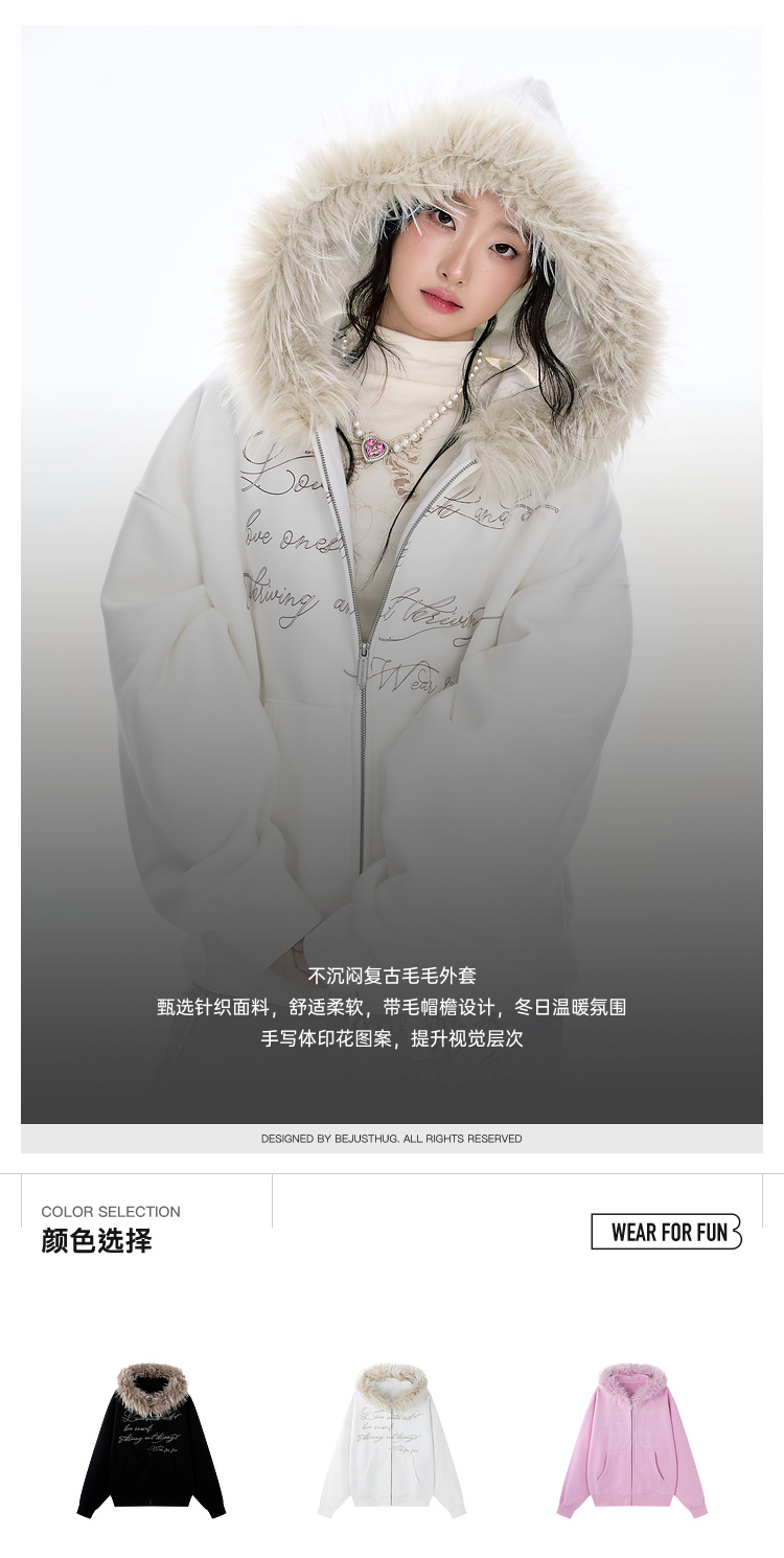 BJHG不计后果毛领连帽卫衣女秋冬新款潮牌复古加绒开衫休闲外套男