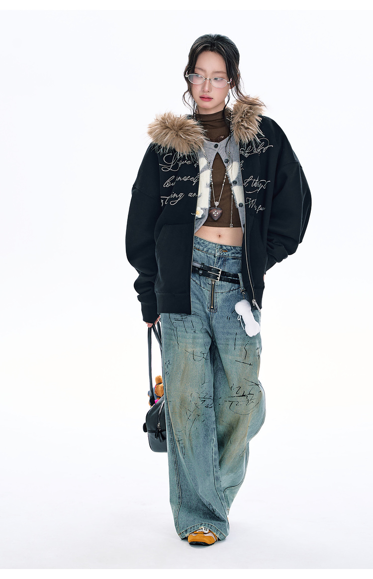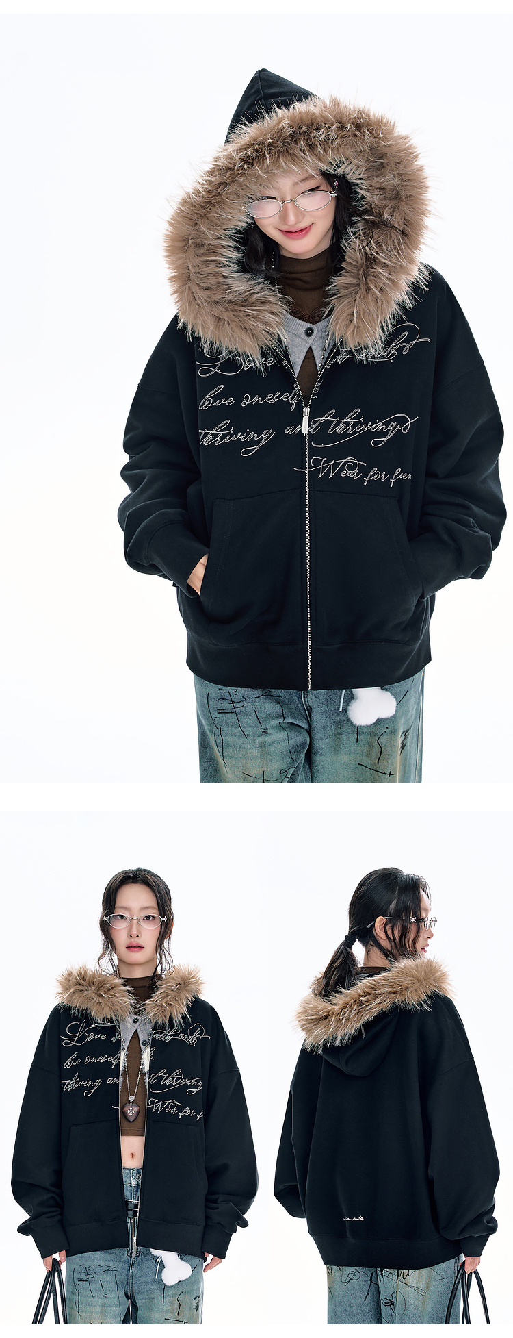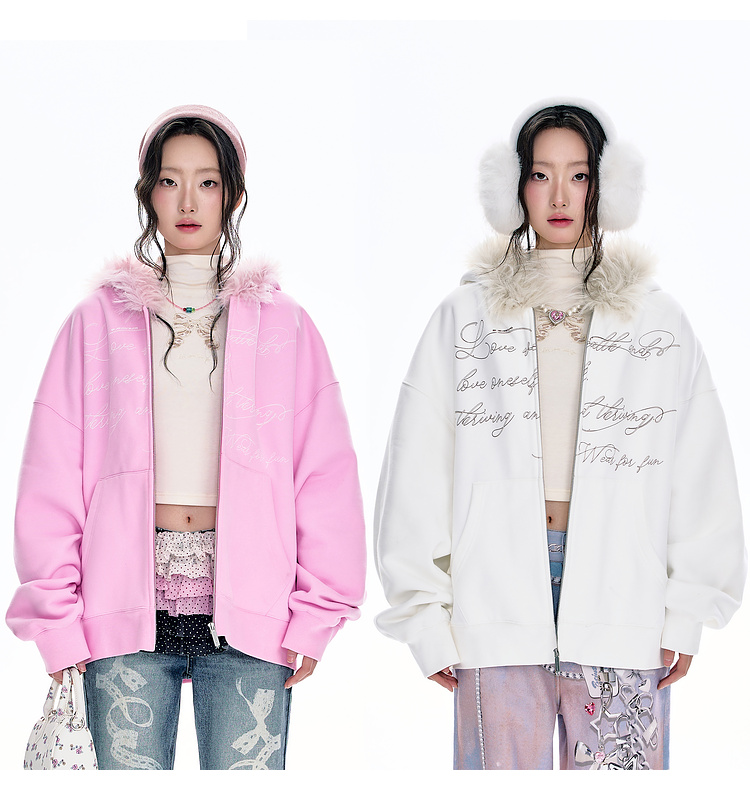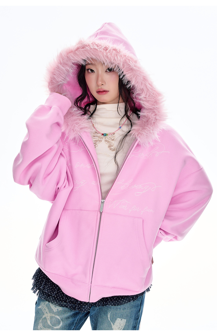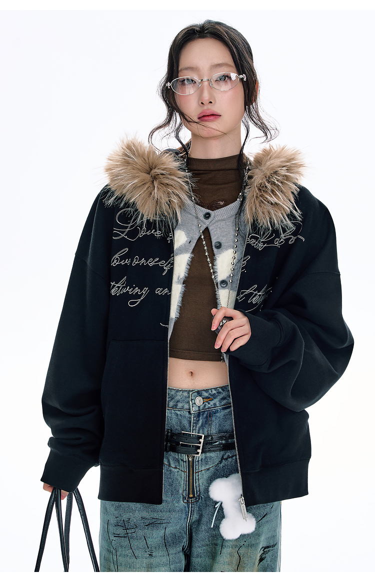 BJHG不计后果毛领连帽卫衣女秋冬新款潮牌复古加绒开衫休闲外套男