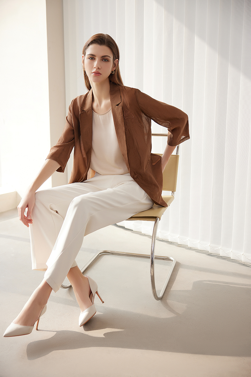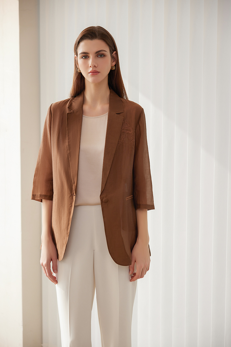 【棉+桑蚕丝一粒扣外套】24年春夏新品女士时尚刺绣七分袖西装小外套