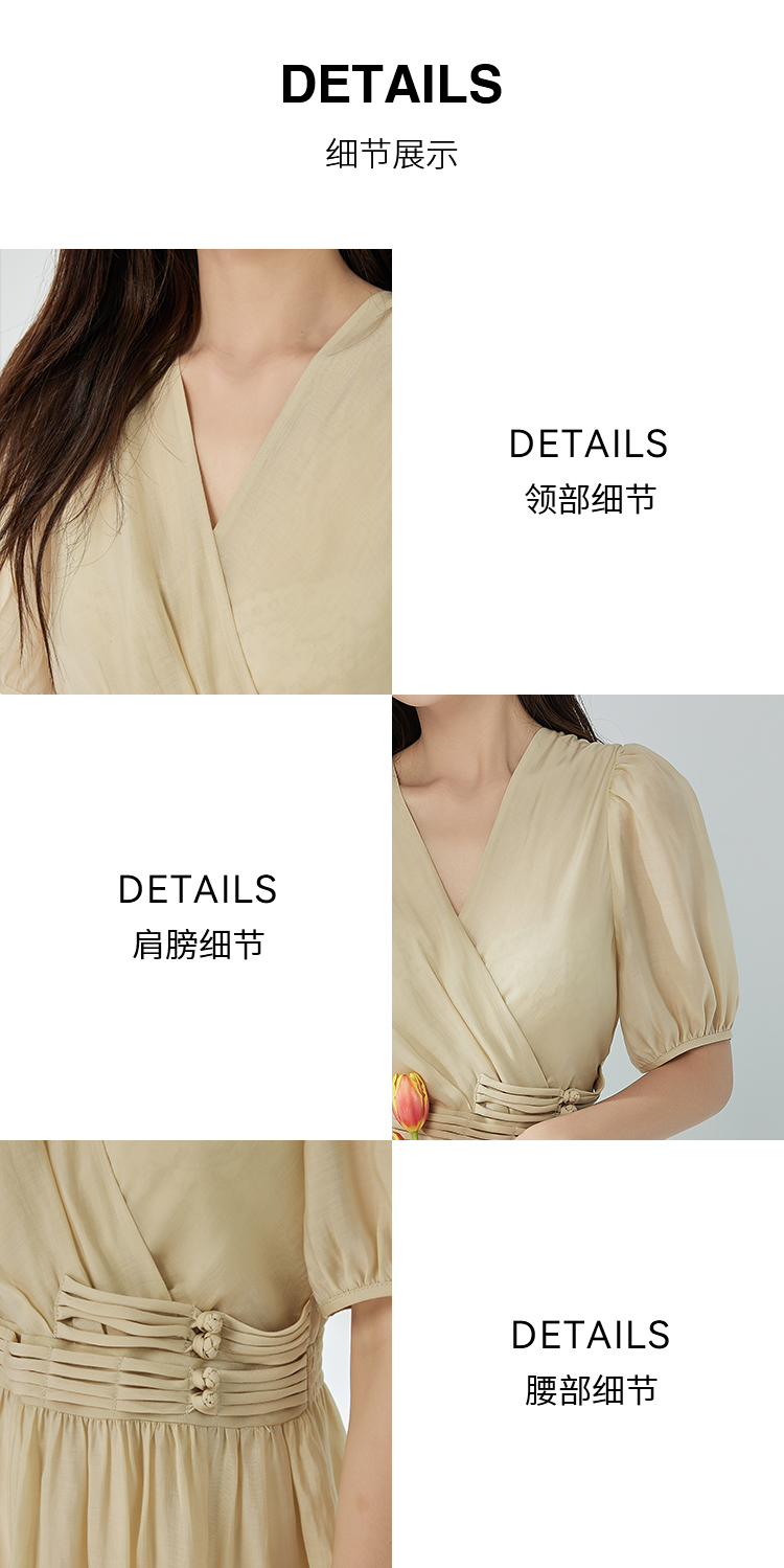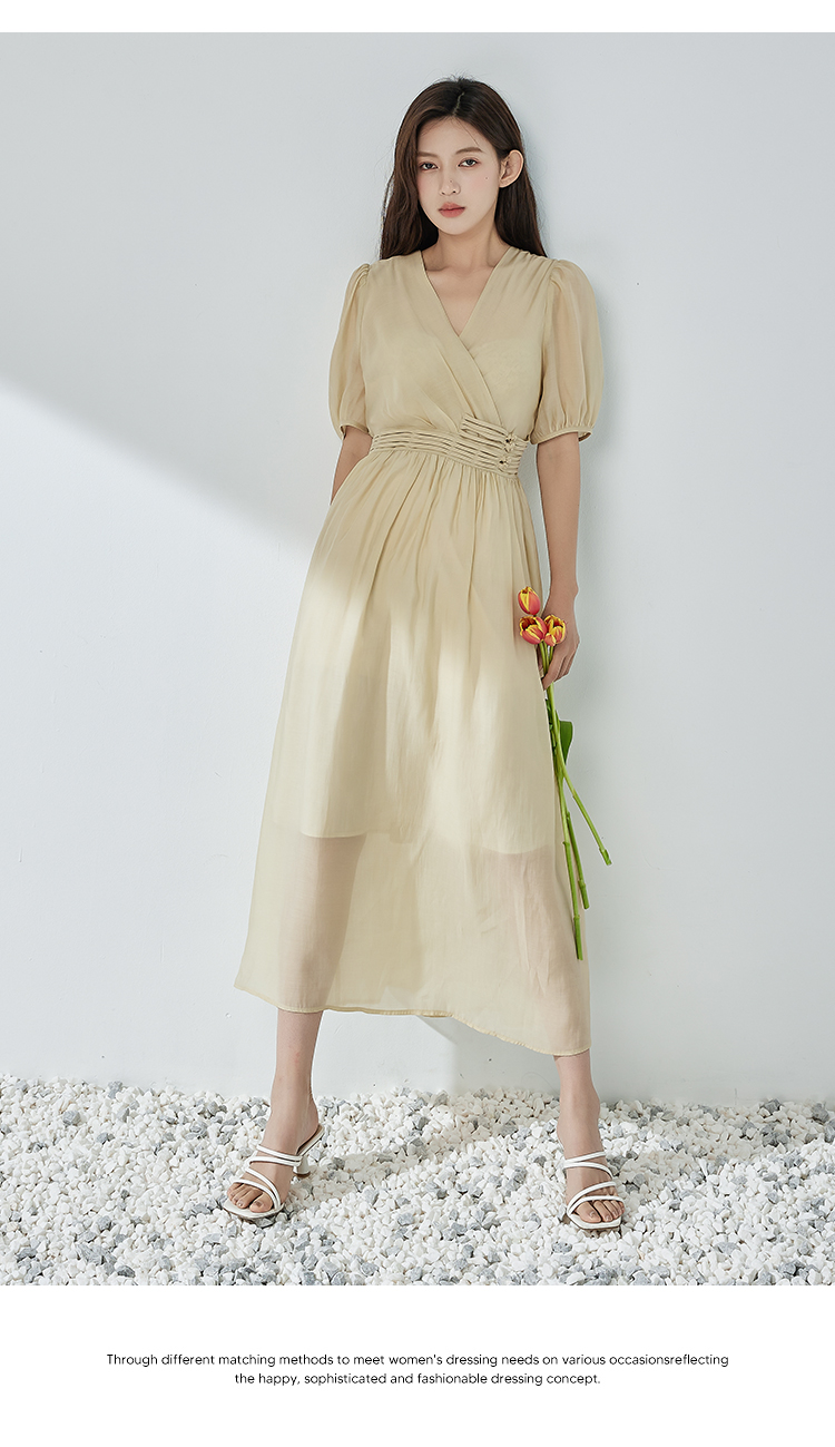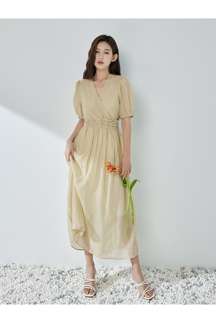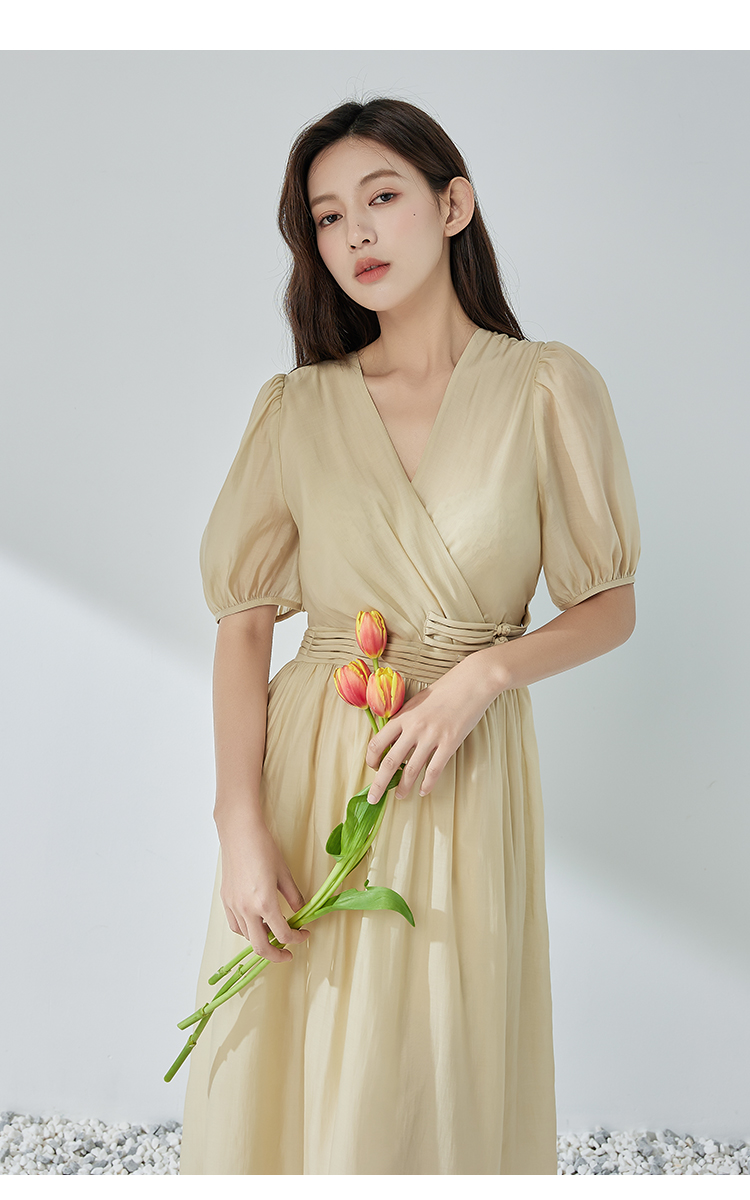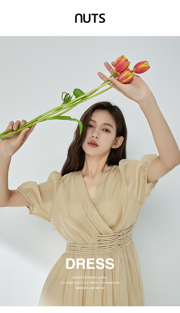 NUTS夏季新品V领纯色时尚优雅气质长款短袖连衣裙325101309