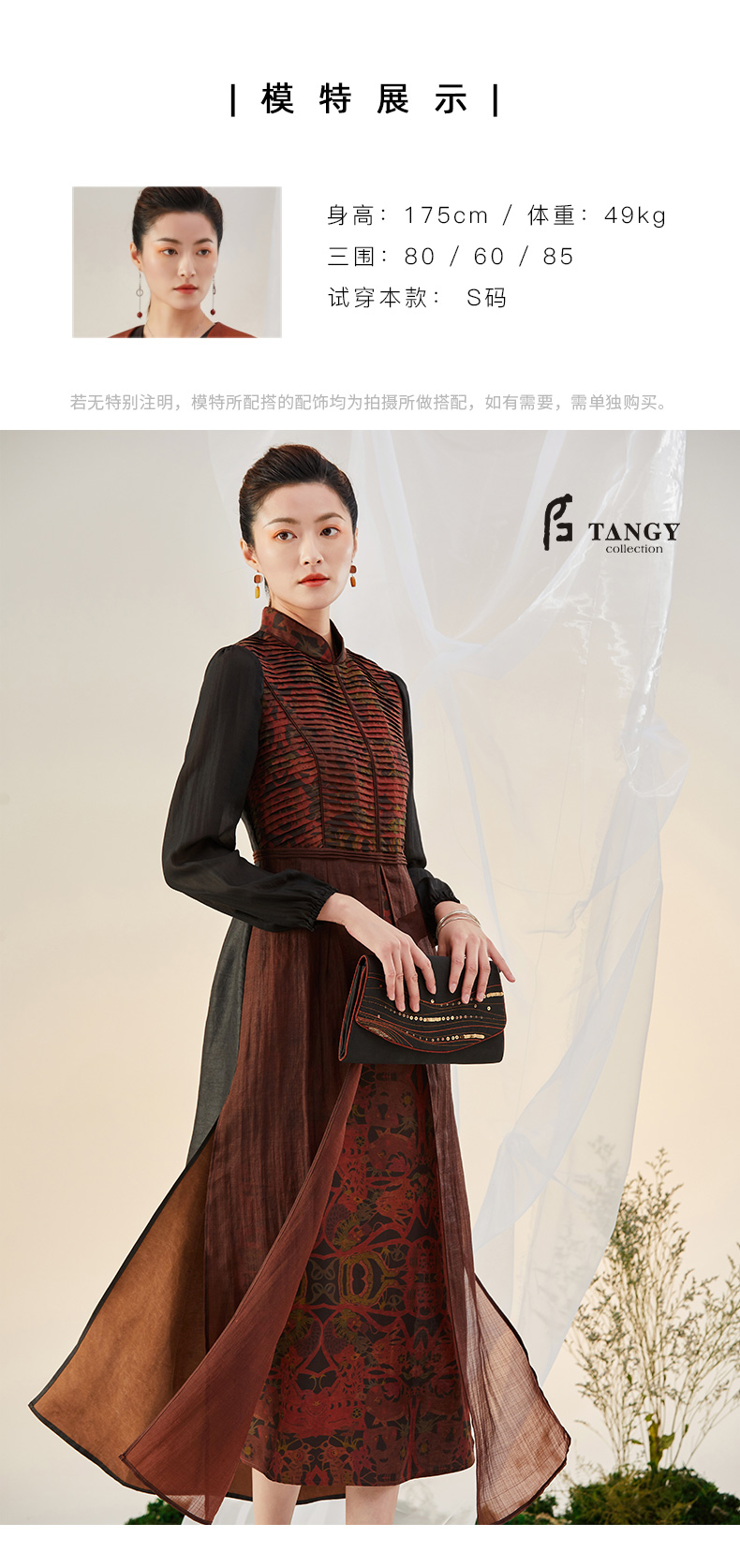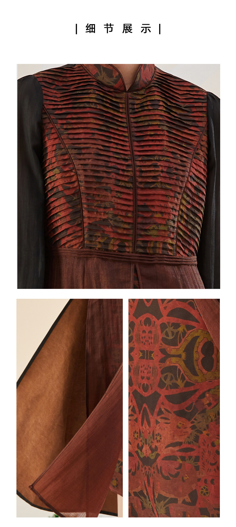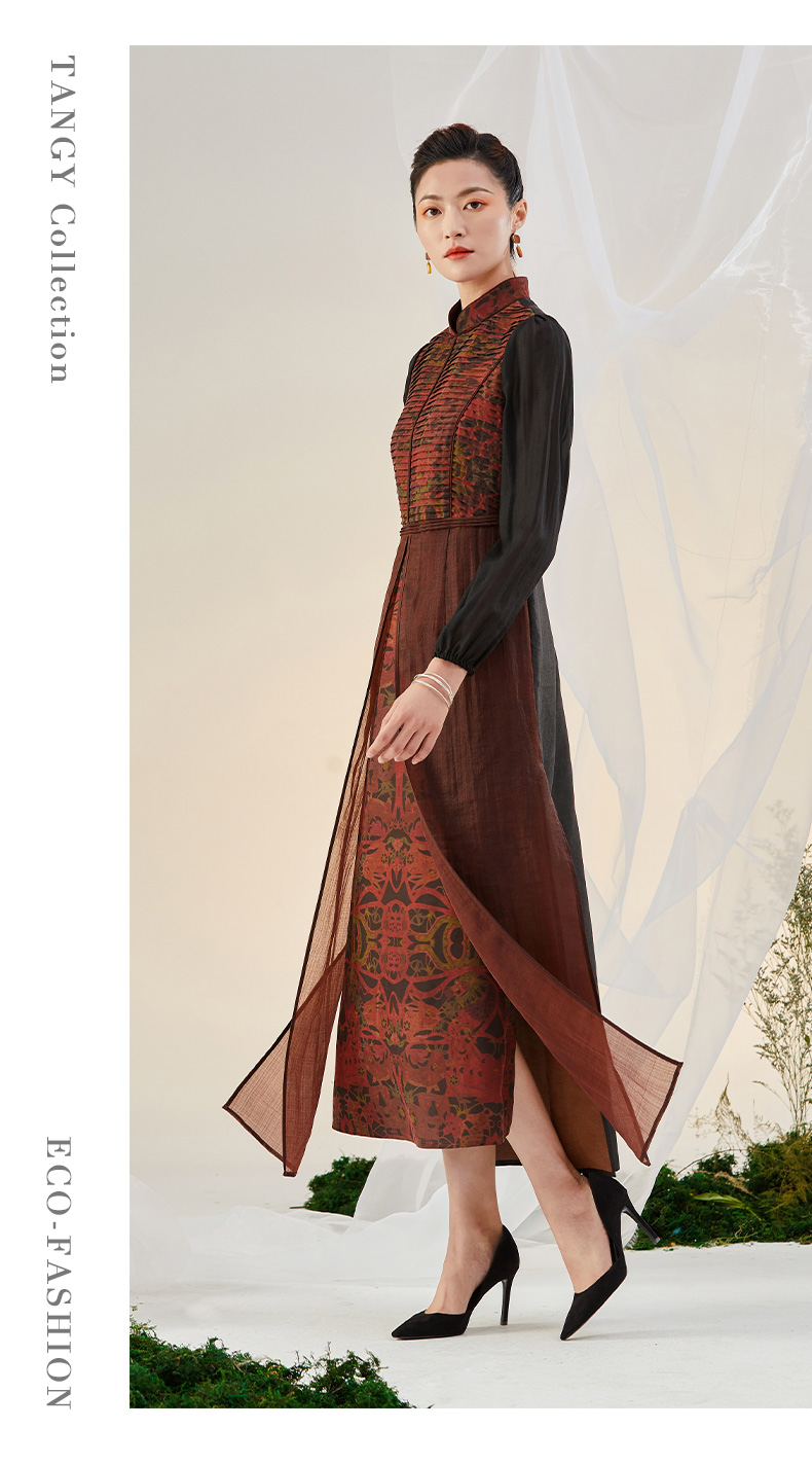 TANGY Collection/天意精品2021年秋季新品真丝印花捏褶莨绸连衣裙