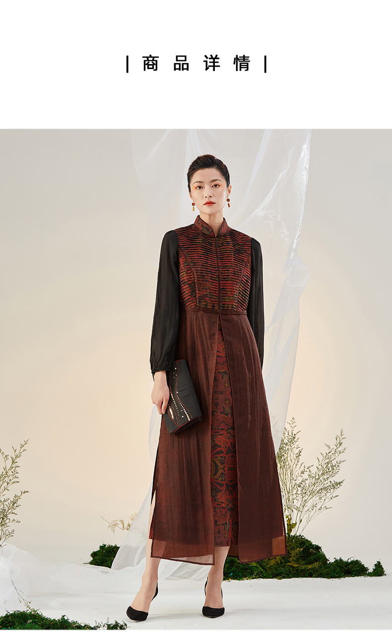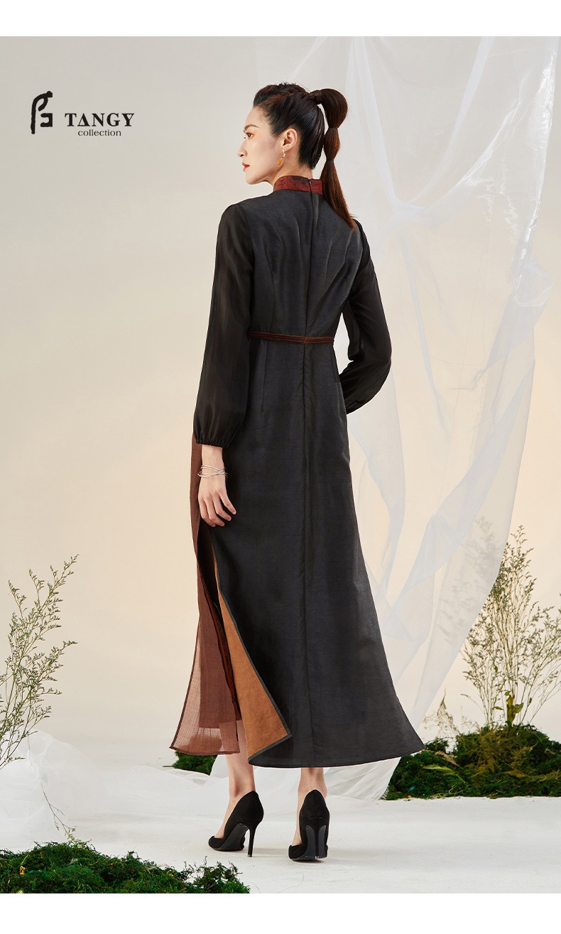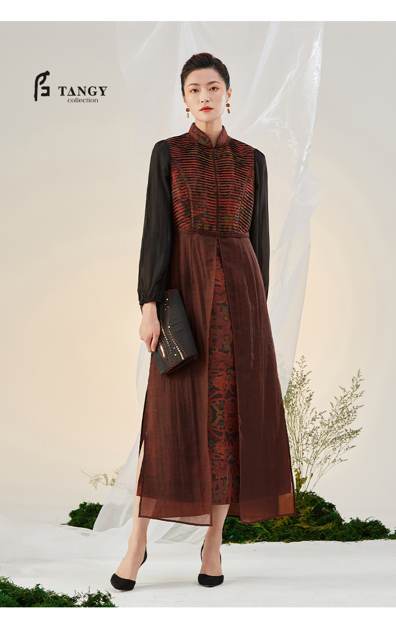 TANGY Collection/天意精品2021年秋季新品真丝印花捏褶莨绸连衣裙