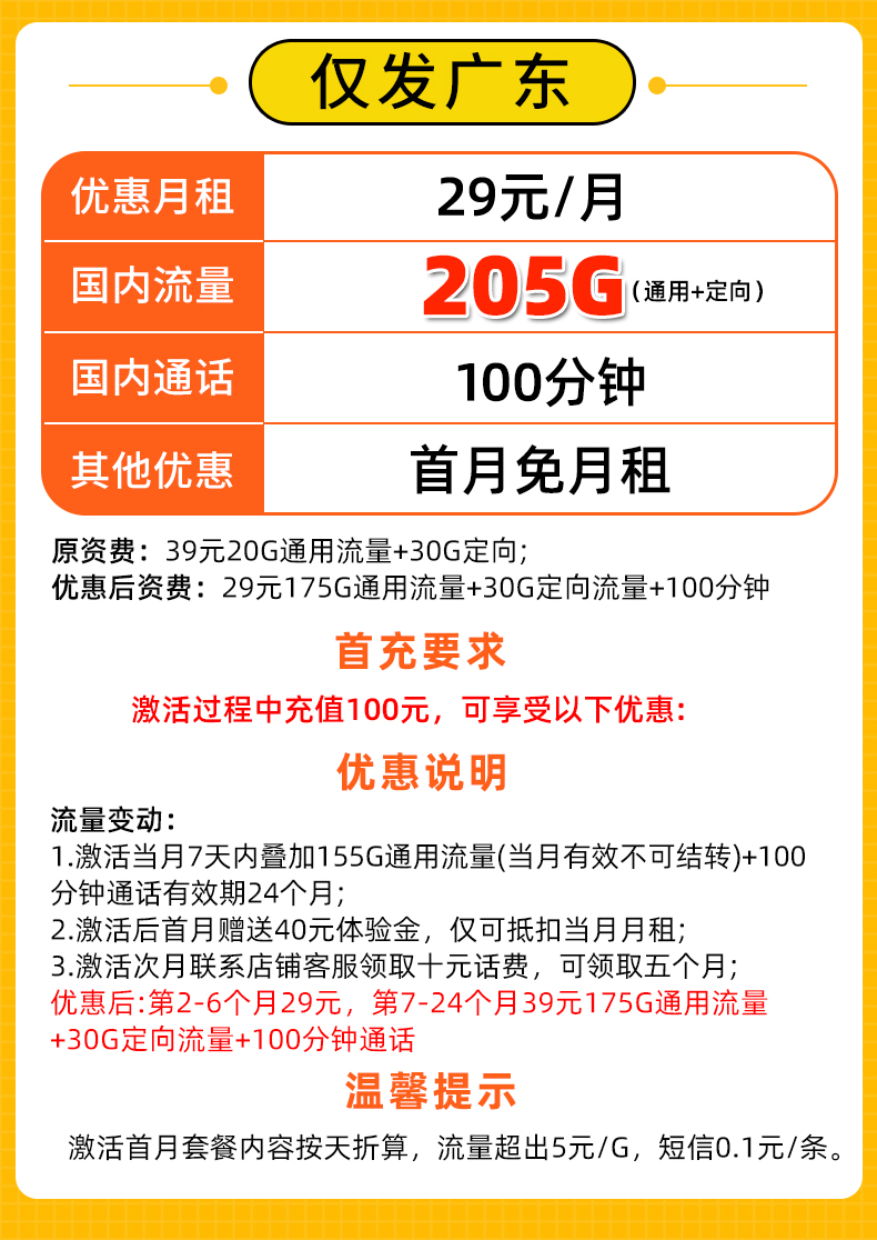 【仅发广东】电信29元205G全国流量100分钟 首月免月租