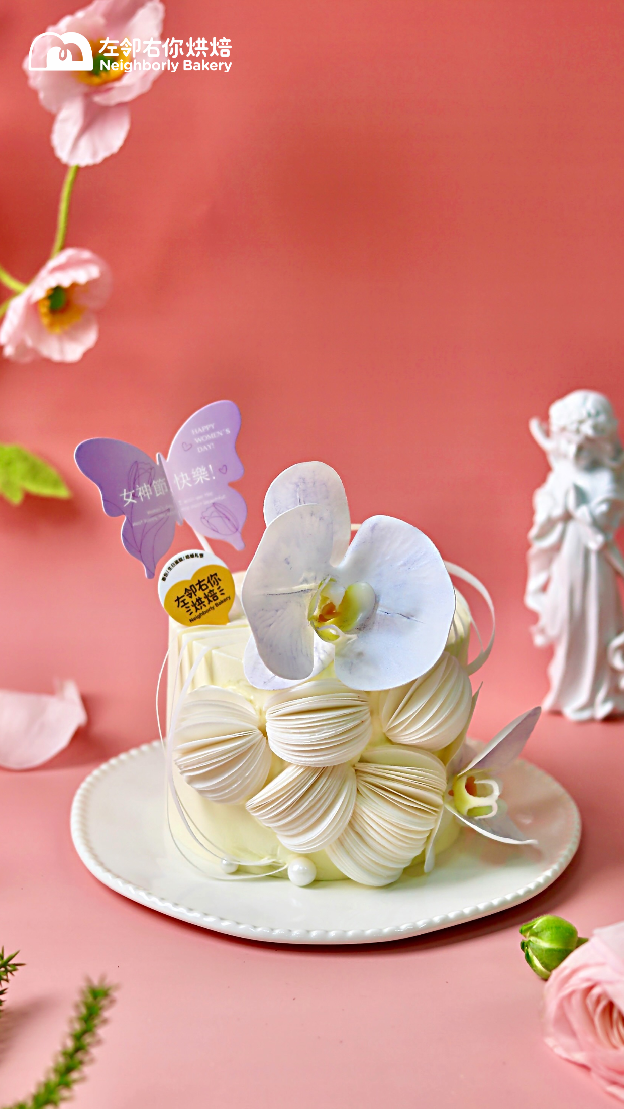 威化纸手工花朵+蝴蝶插牌,象征女性的优雅与自由。