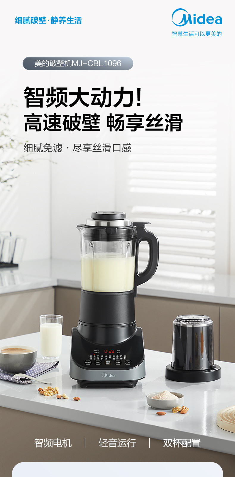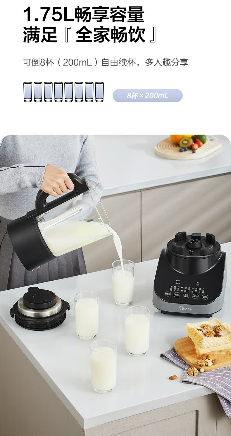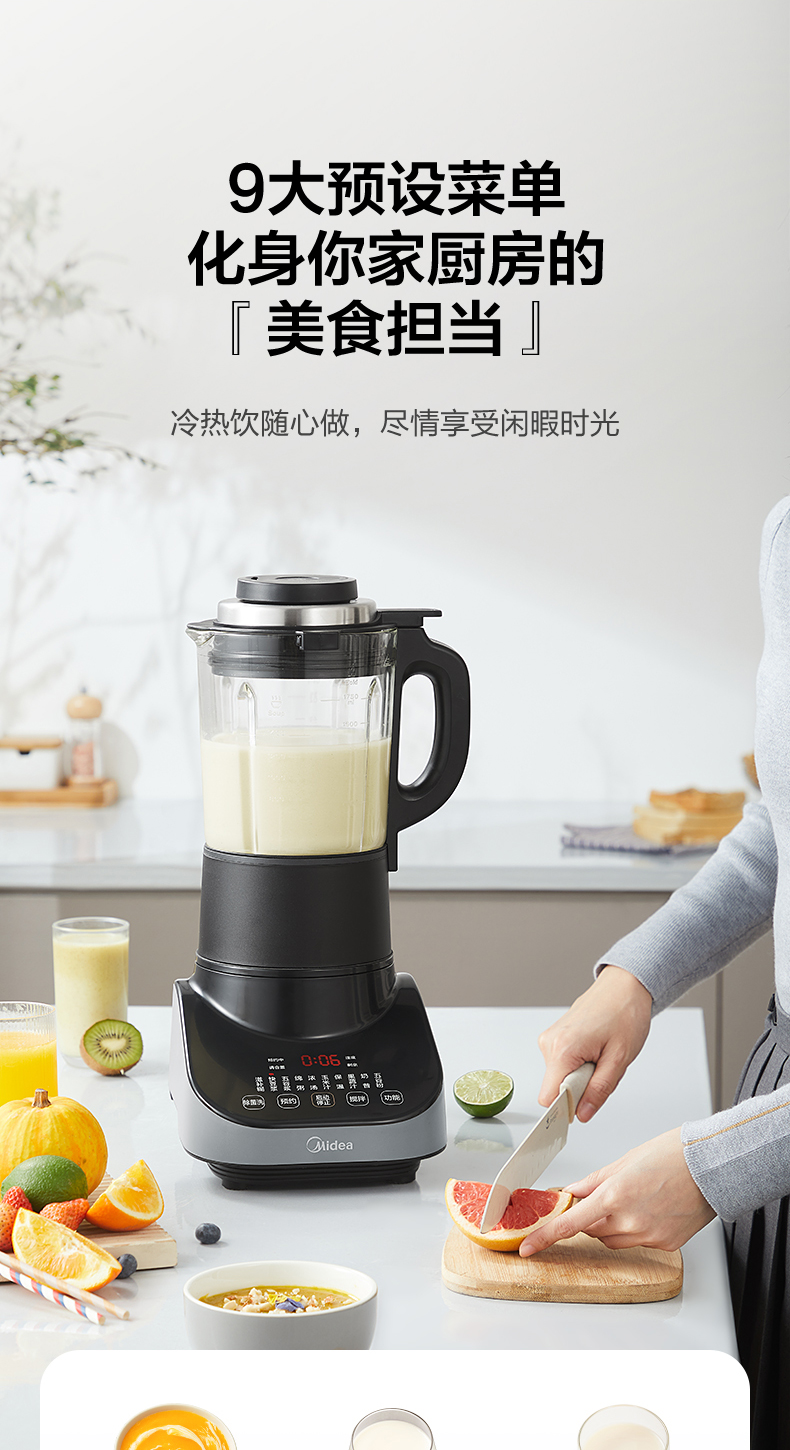 美的(Midea) 安睡破壁机家用轻音榨汁机绞肉馅机婴儿辅食机智能预约豆浆机MJ-CBL1096 轻音低噪