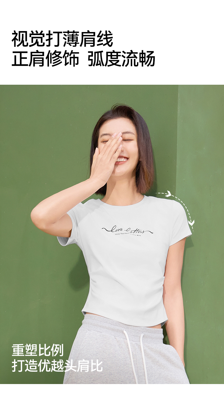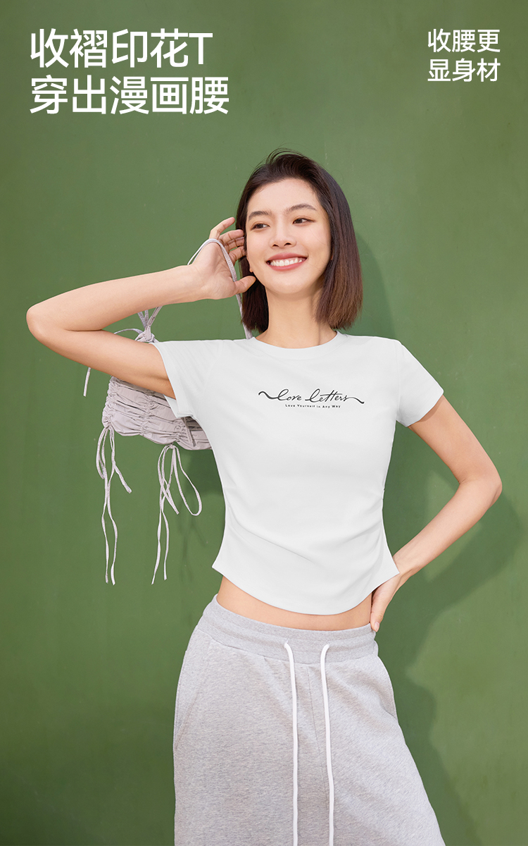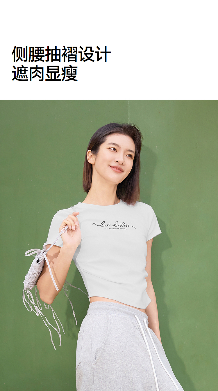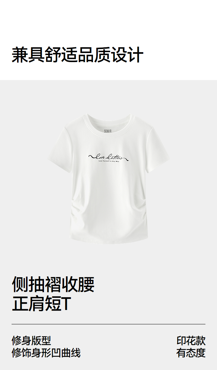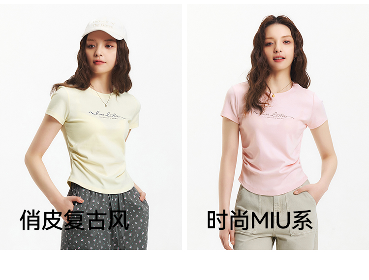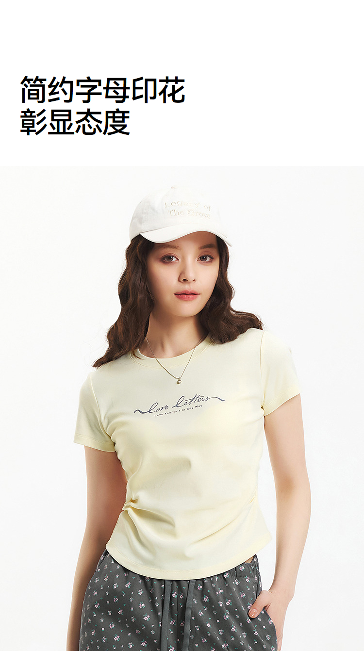 【99元任选2件】森马短袖T恤女夏季短款修身正肩字母印花衣服褶皱收腰小心机上衣