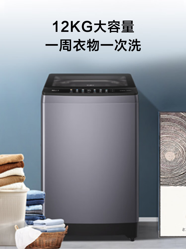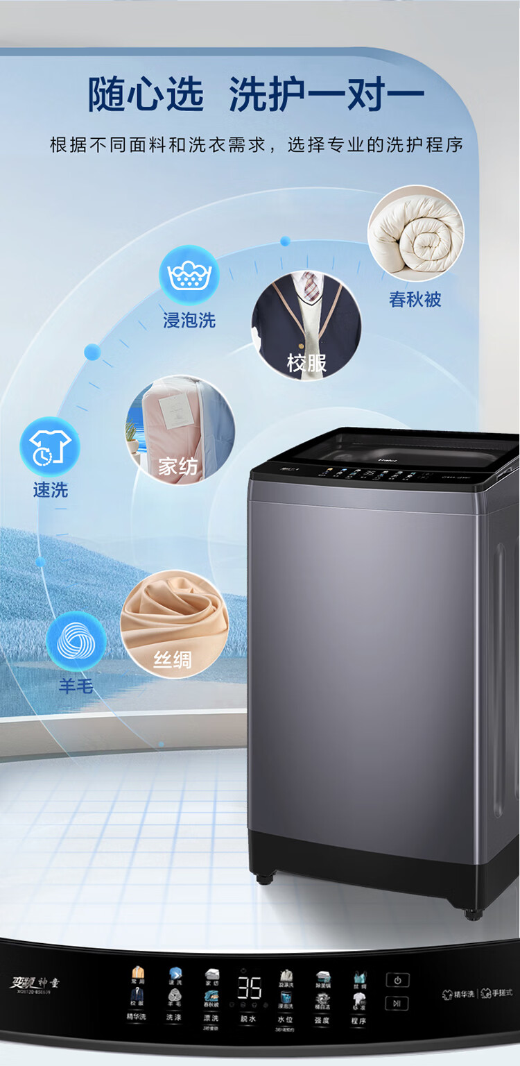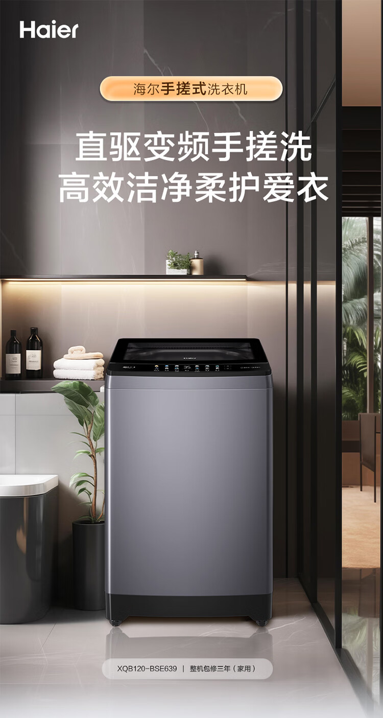 海尔(Haier)12KG大容量 直驱变频波轮 手搓洗 洁净匀洗防缠绕 精华洗 桶自洁 一体玻璃上盖 晶彩显示XQB120-BSE639