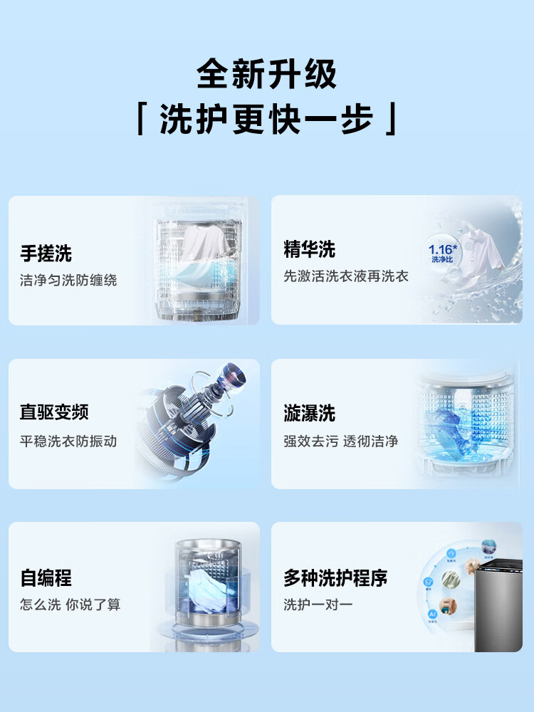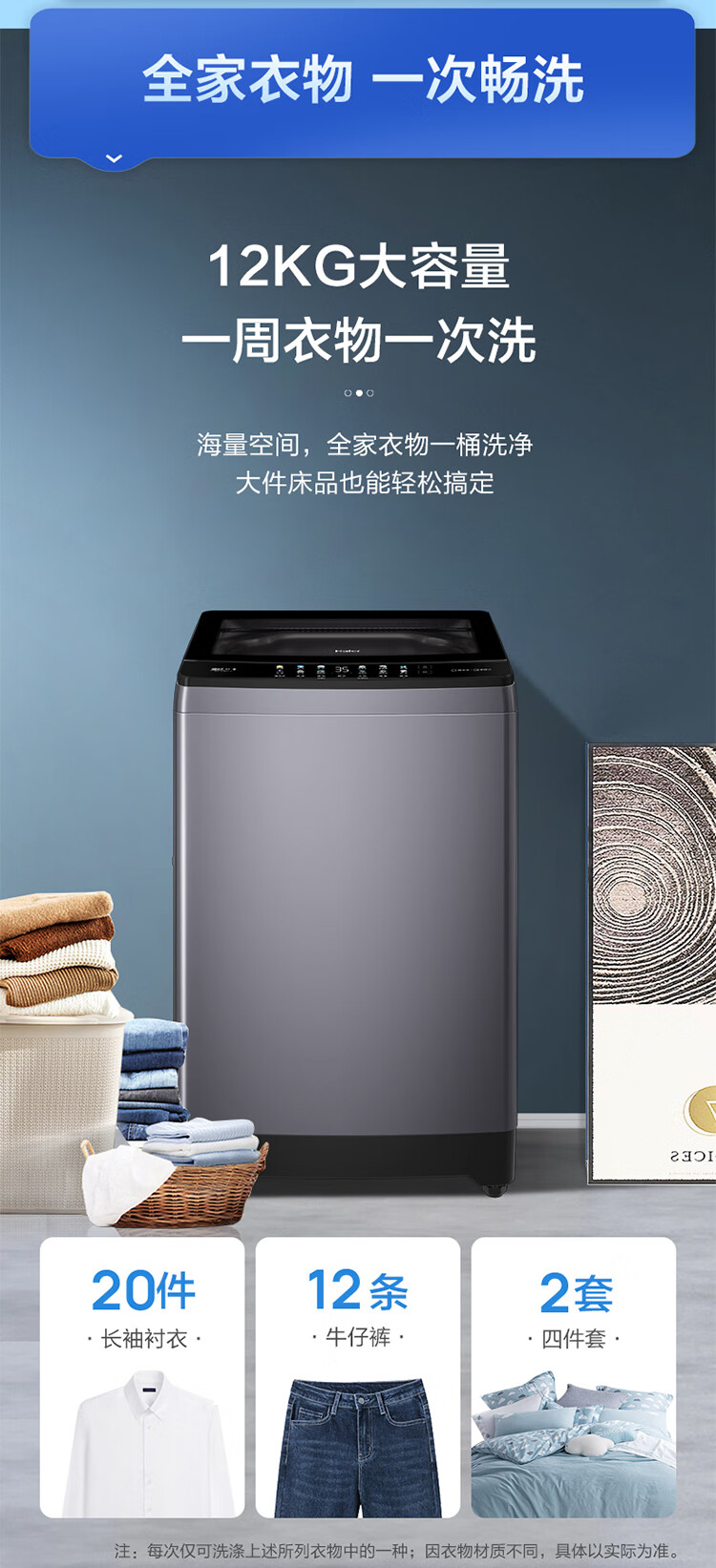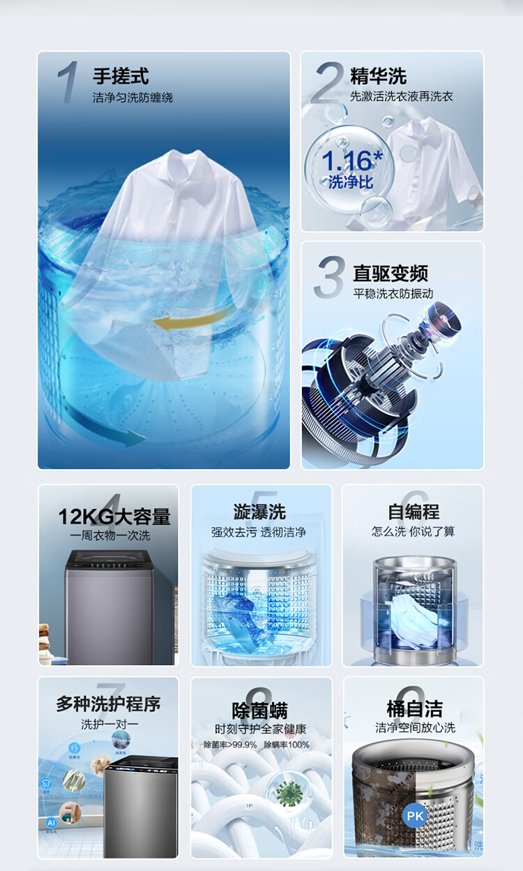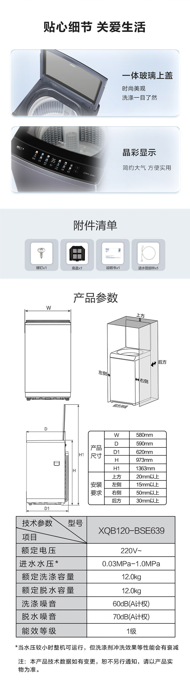 海尔(Haier)12KG大容量 直驱变频波轮 手搓洗 洁净匀洗防缠绕 精华洗 桶自洁 一体玻璃上盖 晶彩显示XQB120-BSE639