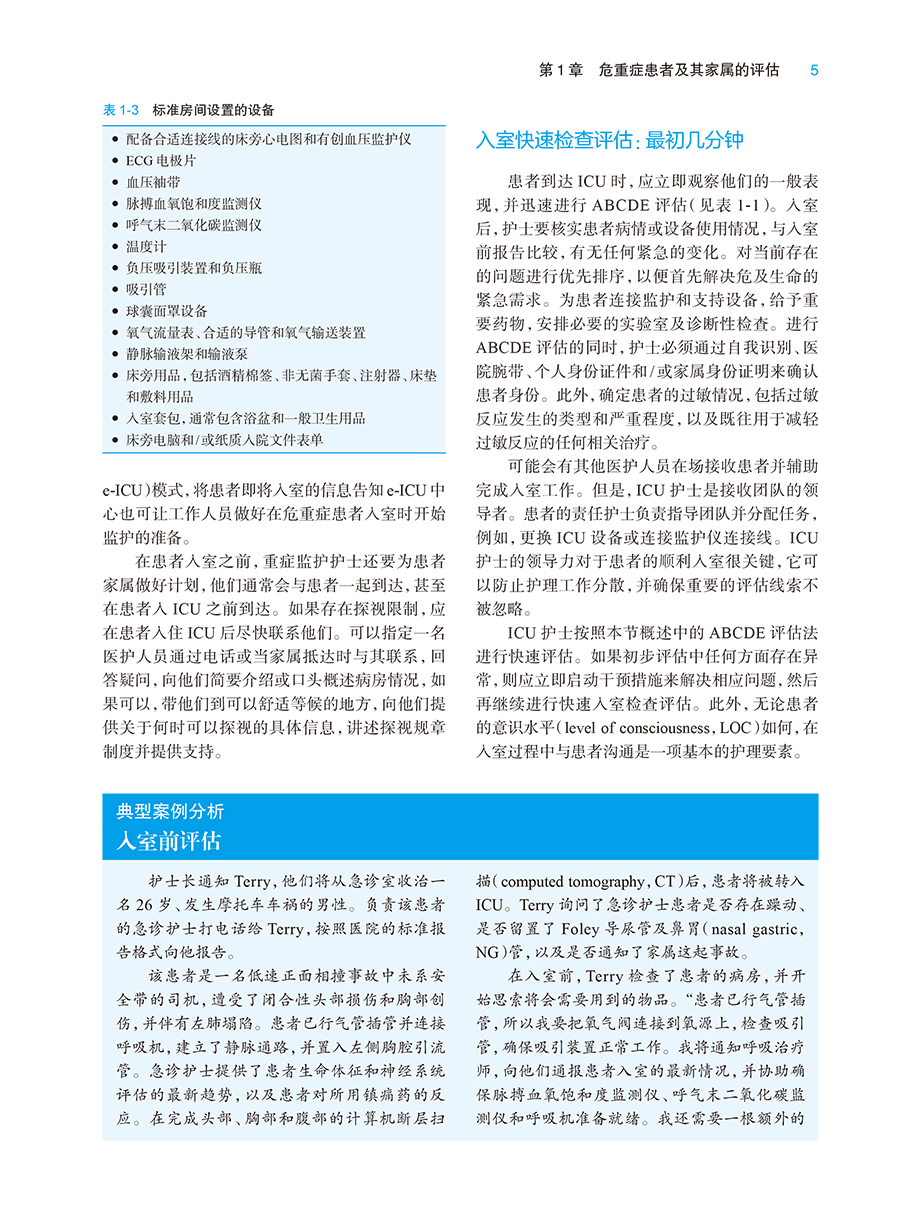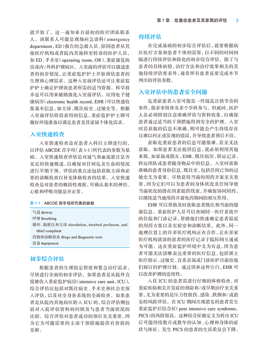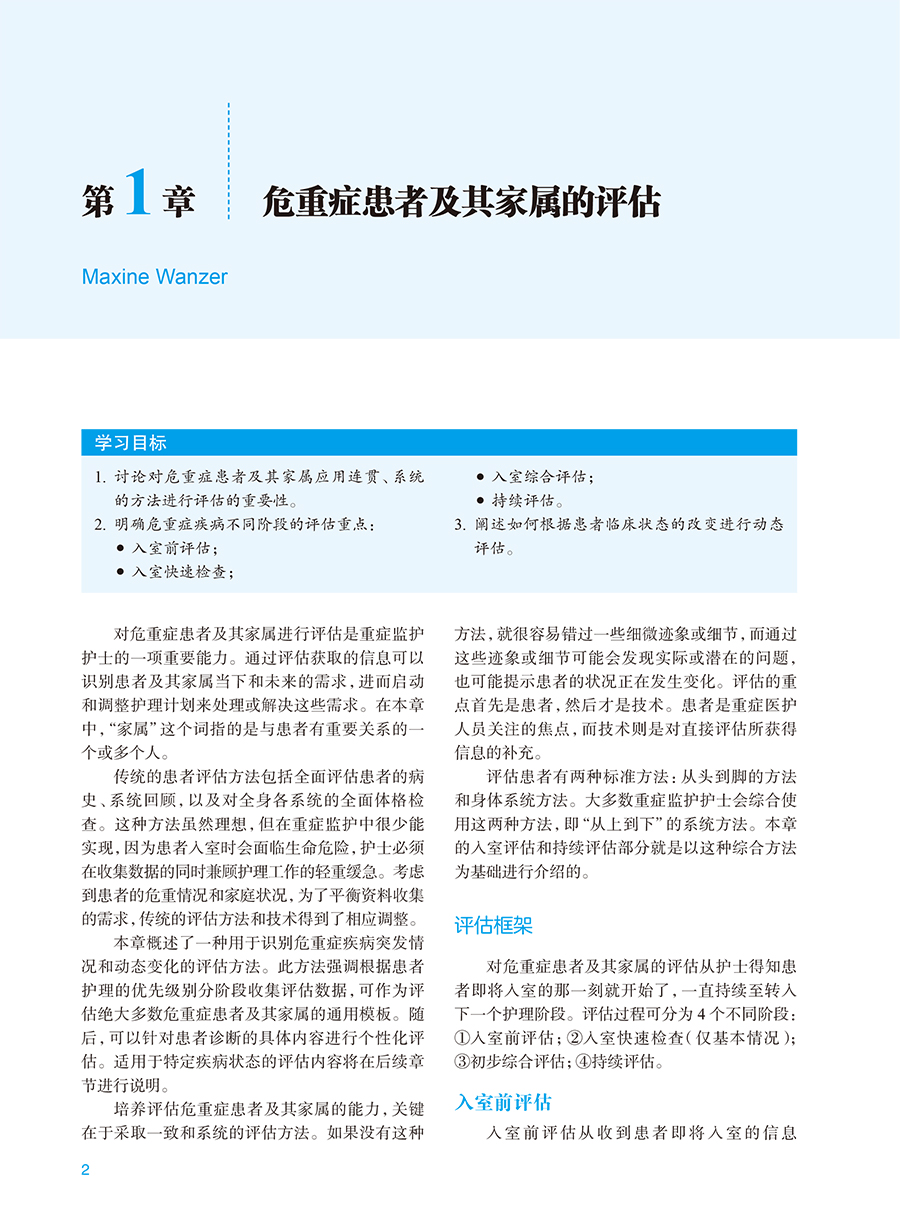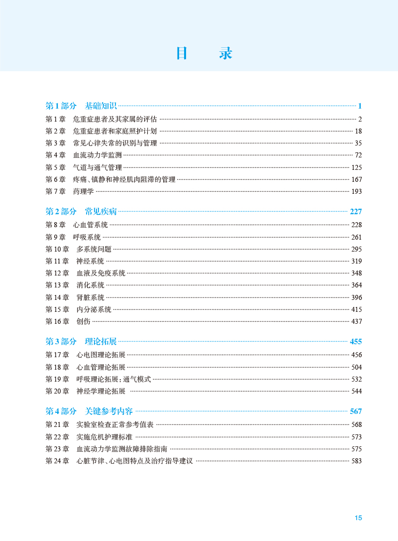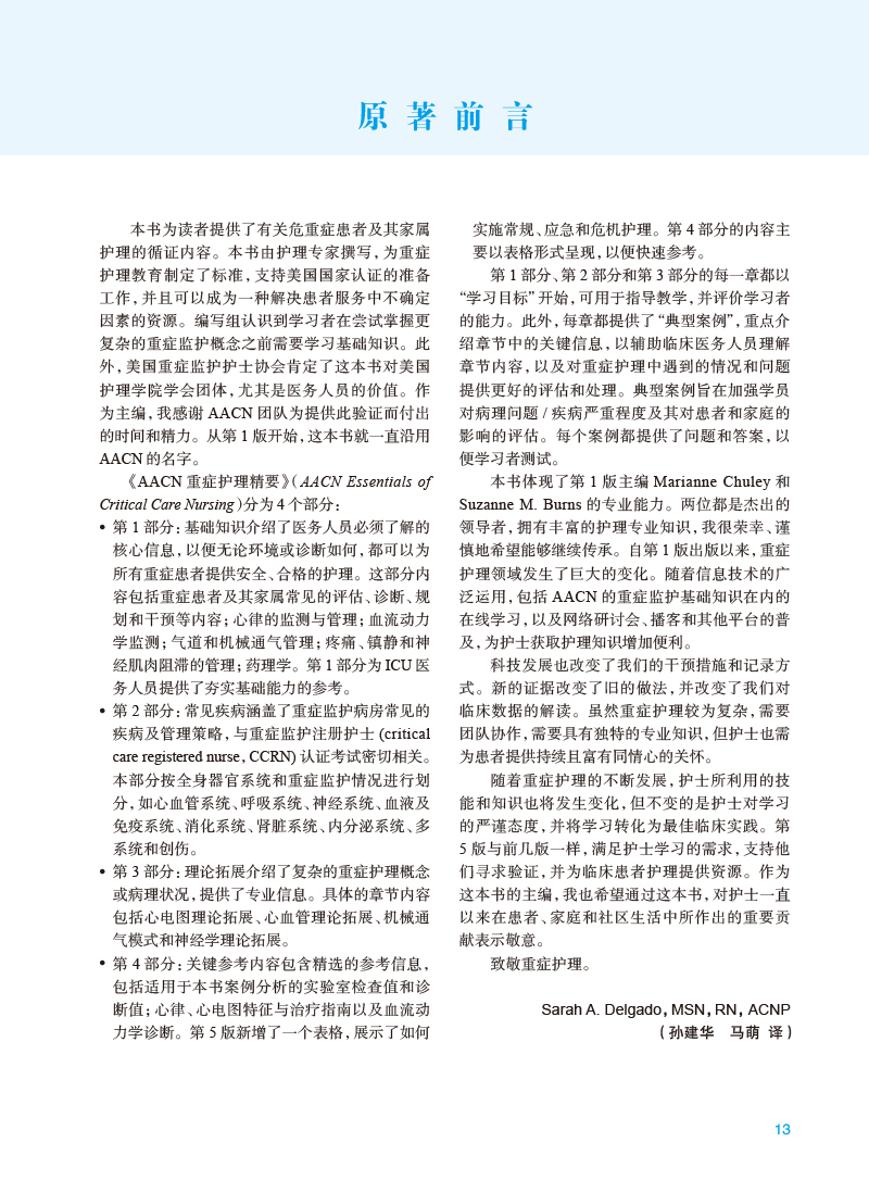 《AACN重症护理精要》(第5版)分为四个部分: **部分:基础知识。介绍了临床护士必须了解的核心信息,以便为所有重症患者提供安全、有效的护理服务,无论其所处环境和诊断如何。这部分内容包括重症患者及其家属常见的评估、诊断、计划和干预措施;心律异常的概念和管理;血流动力学监测;气道和通气管理;疼痛、镇静和神经肌肉阻断管理;药理学。**部分的章节为重症临床医护提供了培养基础能力的信息。 **部分:常见疾病。涵盖了ICU常见的病理情况和管理策略,与CCRN认证考试的规划密切相关。本部分的章节按身体系统和选定的重症监护条件进行编排,如心血管、呼吸、多系统、神经、血液和免疫、消化道、肾脏、内分泌和创伤。 第三部分:理论拓展。介绍了重症护理理论拓展或病理状况,这些概念或状况更为复杂,代表了专家级的需要掌握的内容。具体的章节内容包括心电图、心血管、通气模式和神经系统的理论拓展。 第四部分:关键参考内容。包含精选的参考信息,包括适用于文中病例内容的实验室诊断值、心律、心电图特征和治疗指南以及血流动力学诊断。本版新增了一个表格,展示如何实施常规、应急和危机护理标准。第四部分的内容主要以表格形式呈现,以便快速参考。