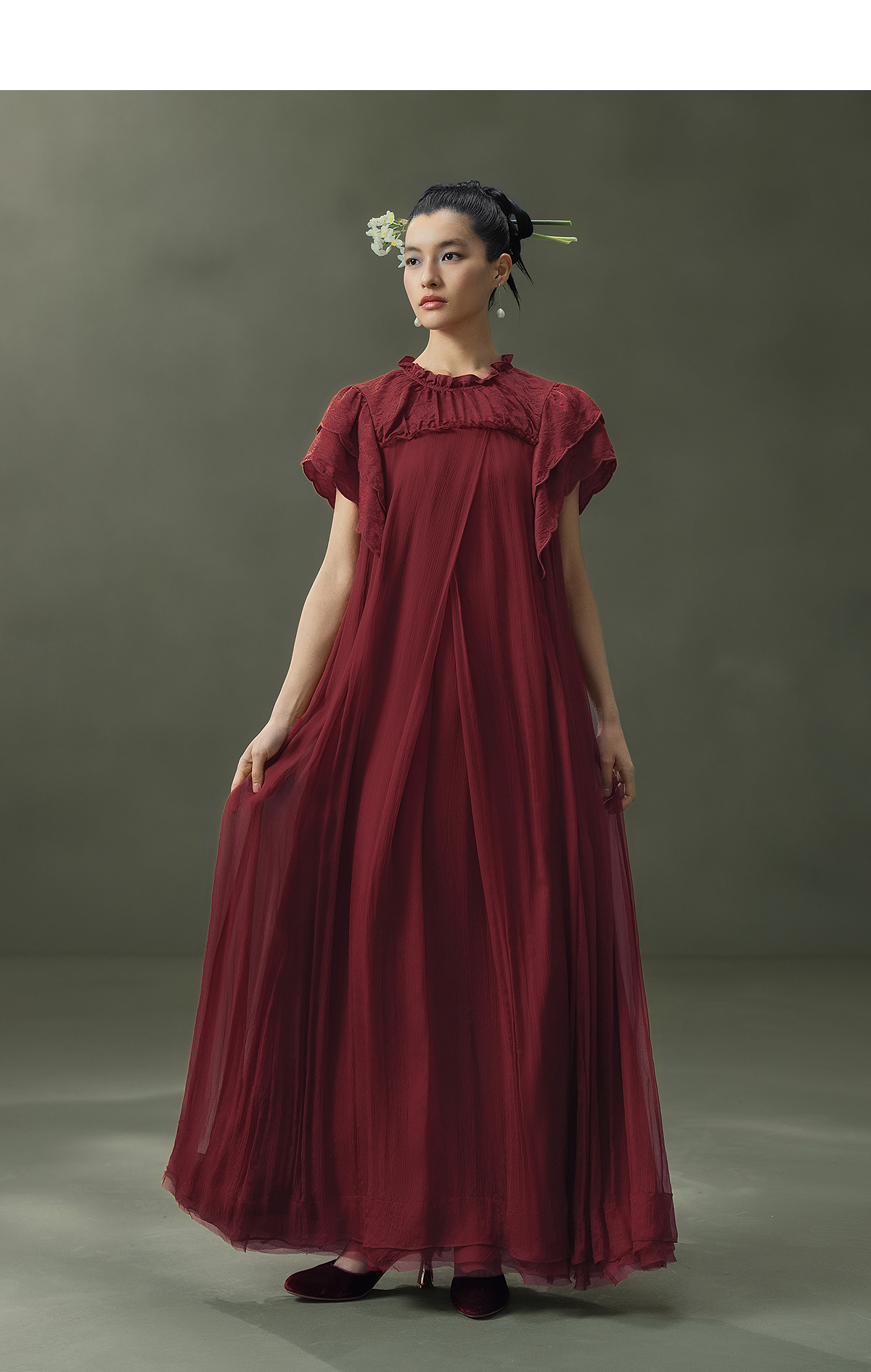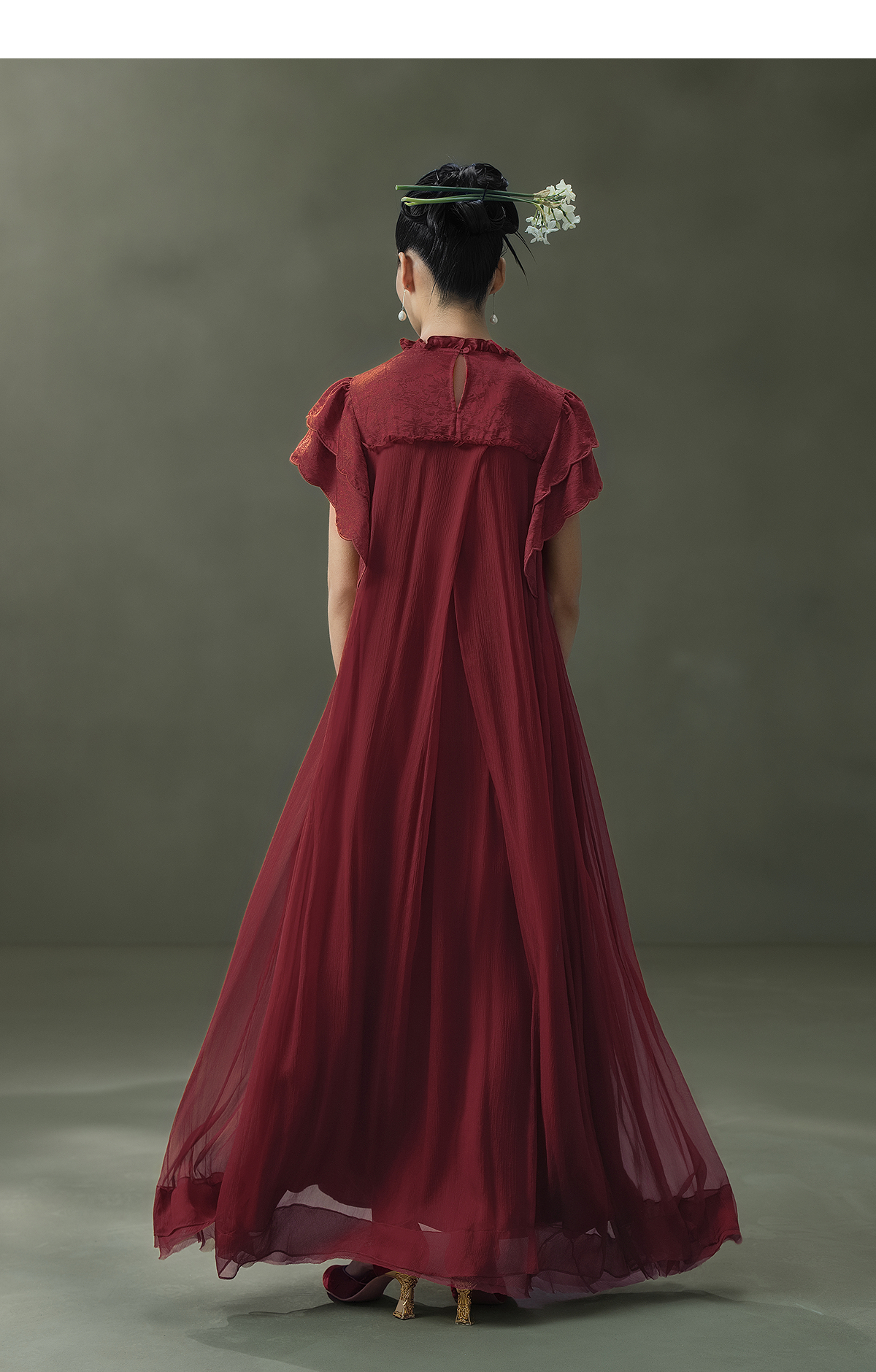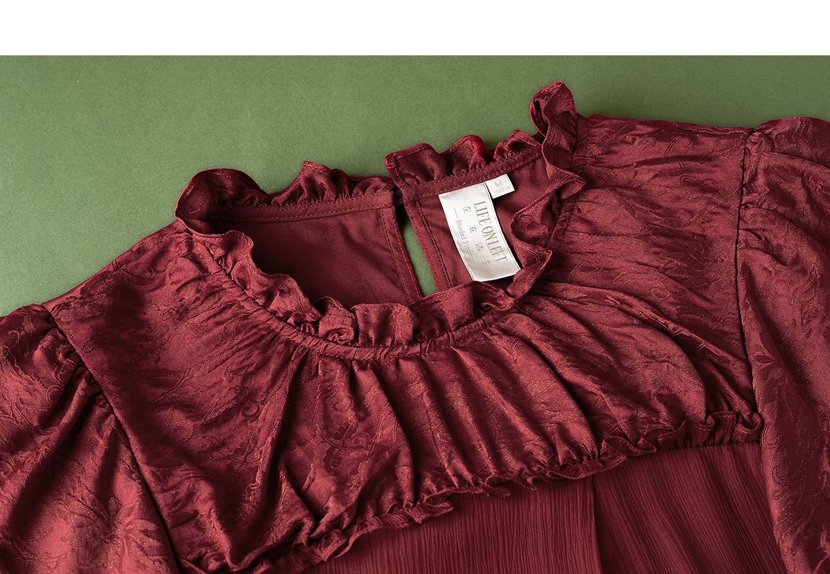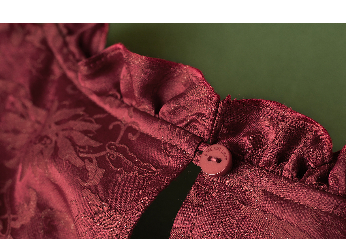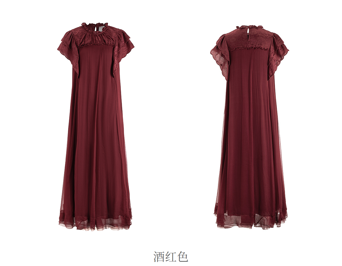 【林栖设计小店】榴花灼灼|酒红金线人丝提花拼飞片2026夏新款连衣裙