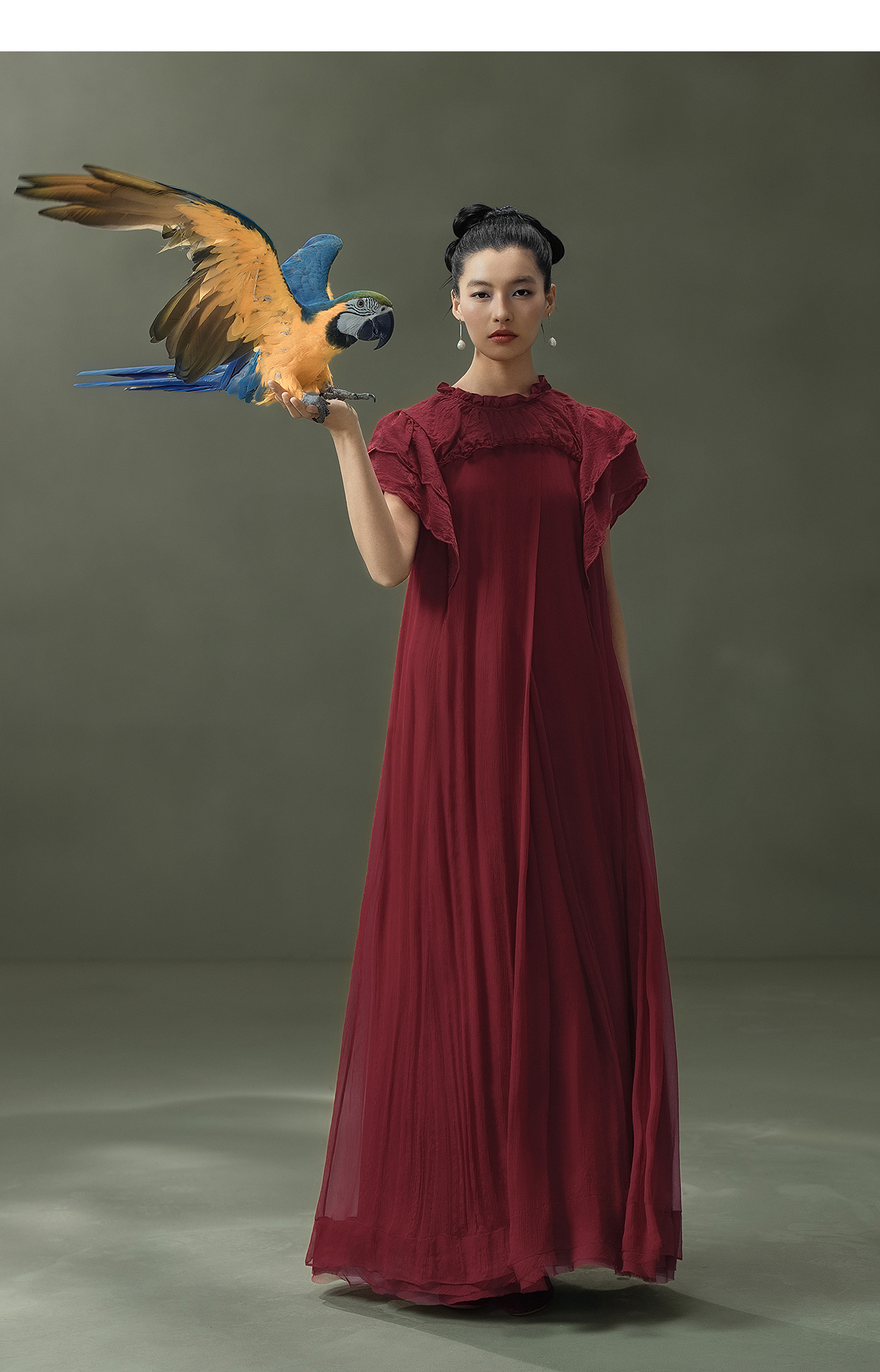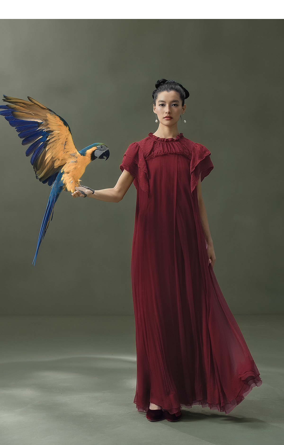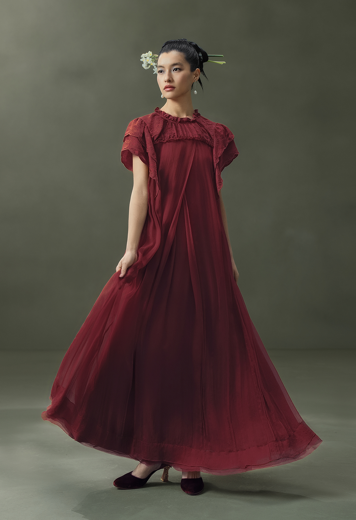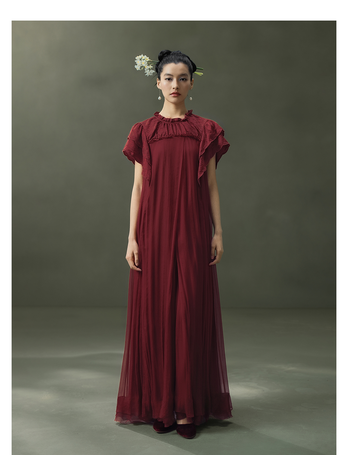 【林栖设计小店】榴花灼灼|酒红金线人丝提花拼飞片2026夏新款连衣裙