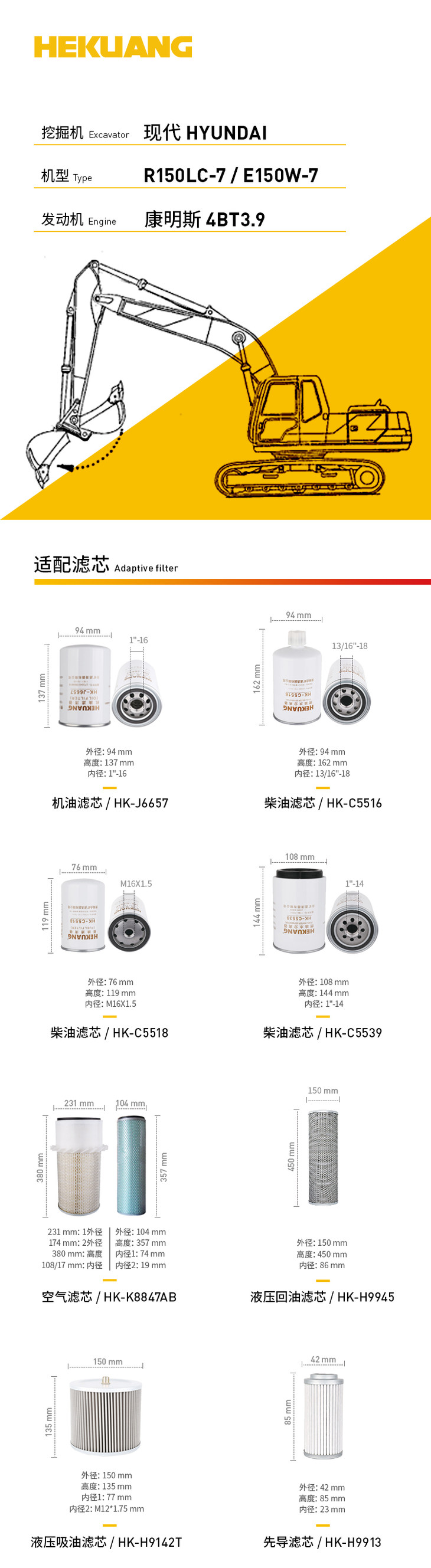 现代R150LC-7 E150W-7挖掘机滤芯 机油柴油空气滤芯 液压油先导滤芯 商品图3