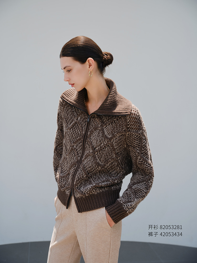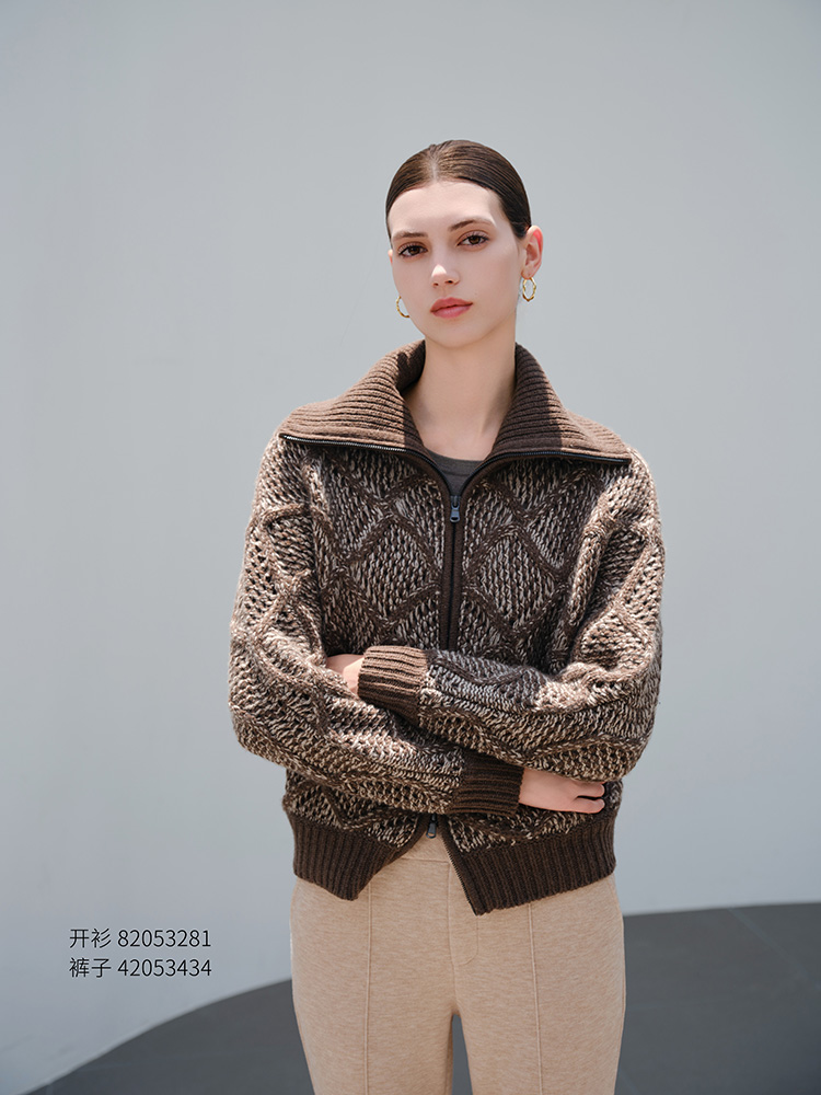 【绞花翻领开衫】羊绒世家秋冬新品女士羊绒混色开衫双拉链针织外套
