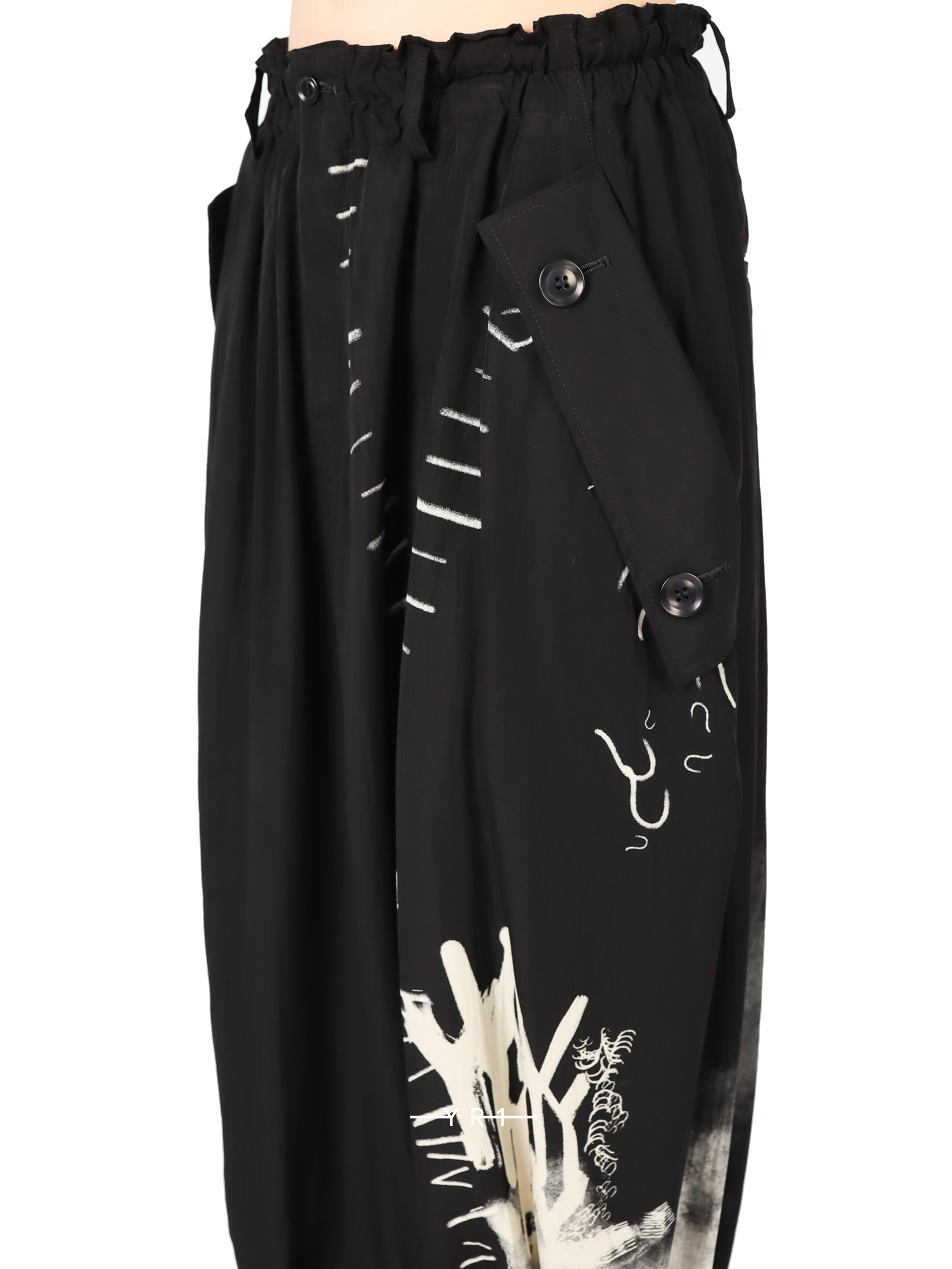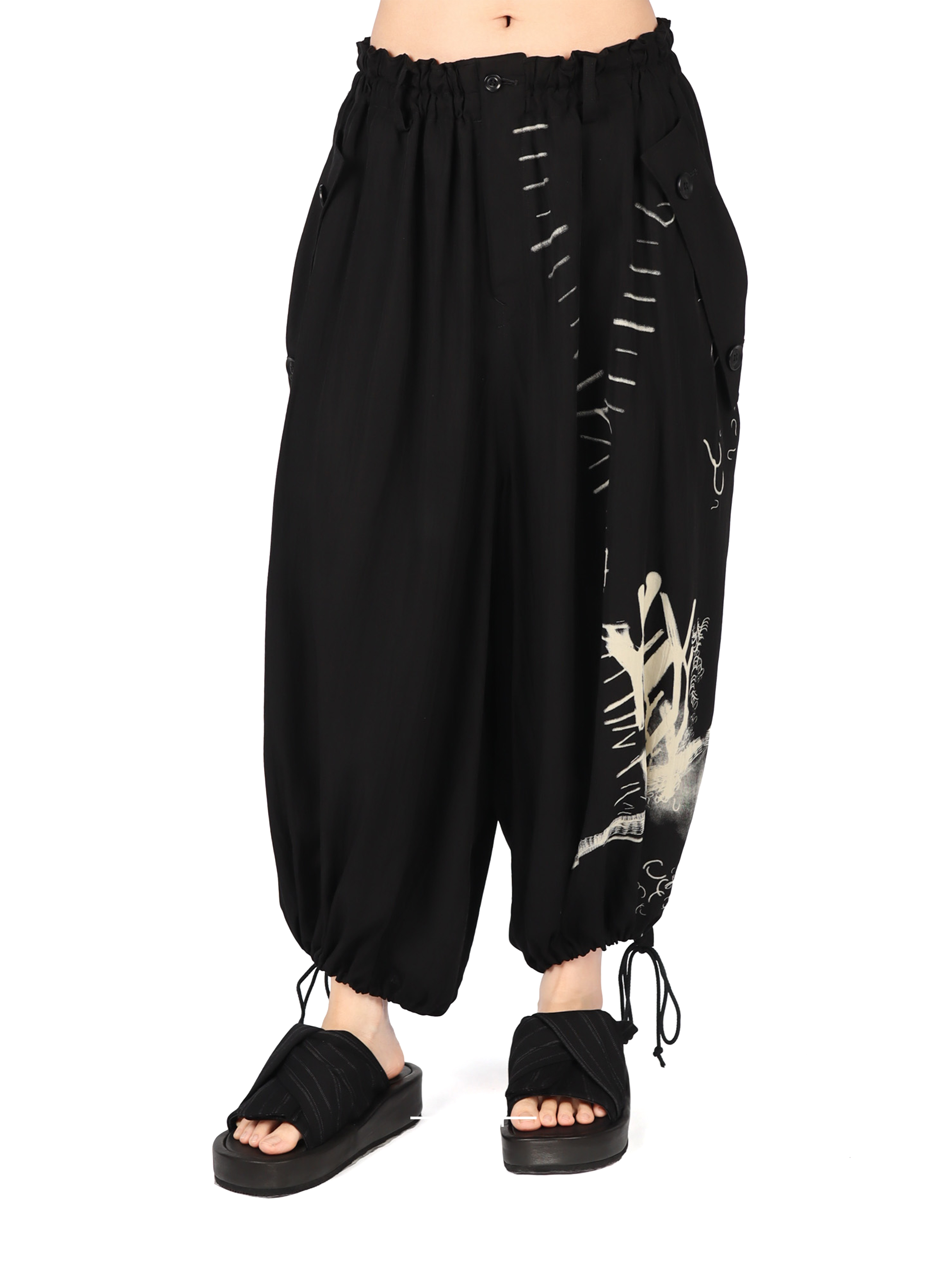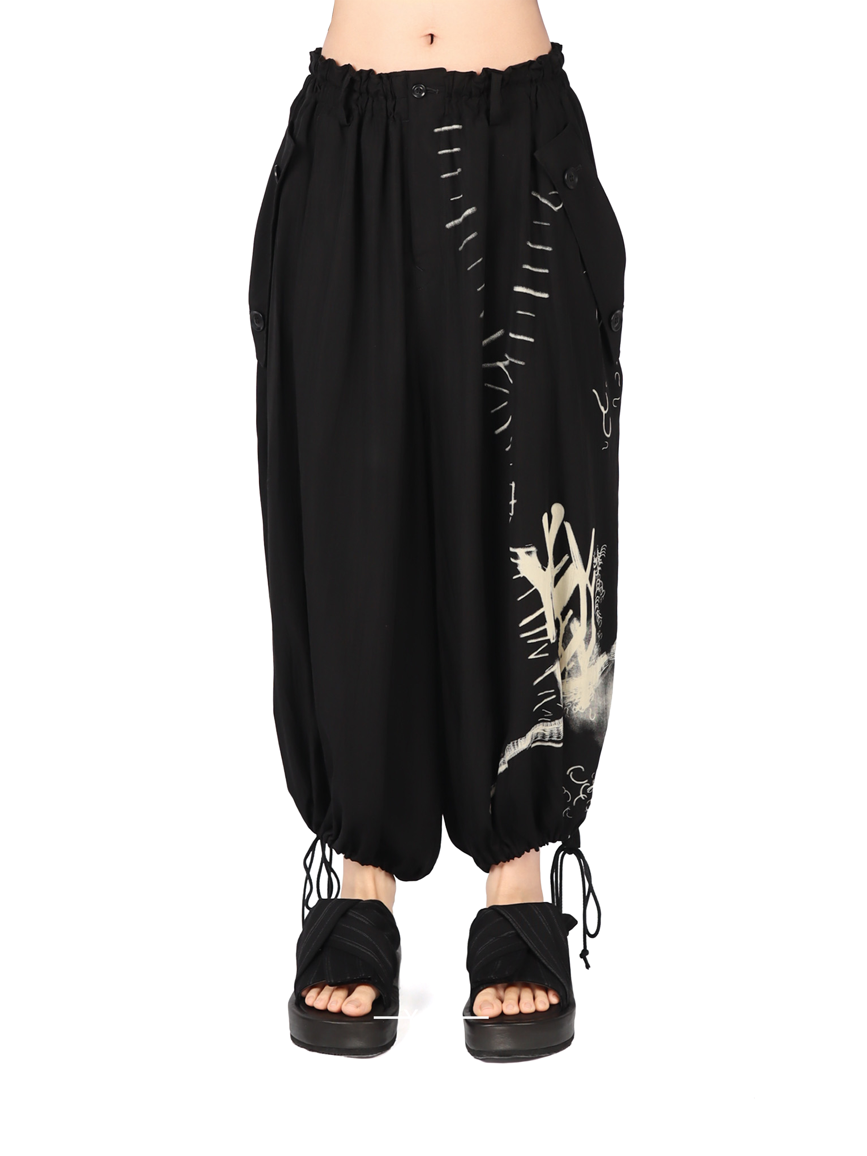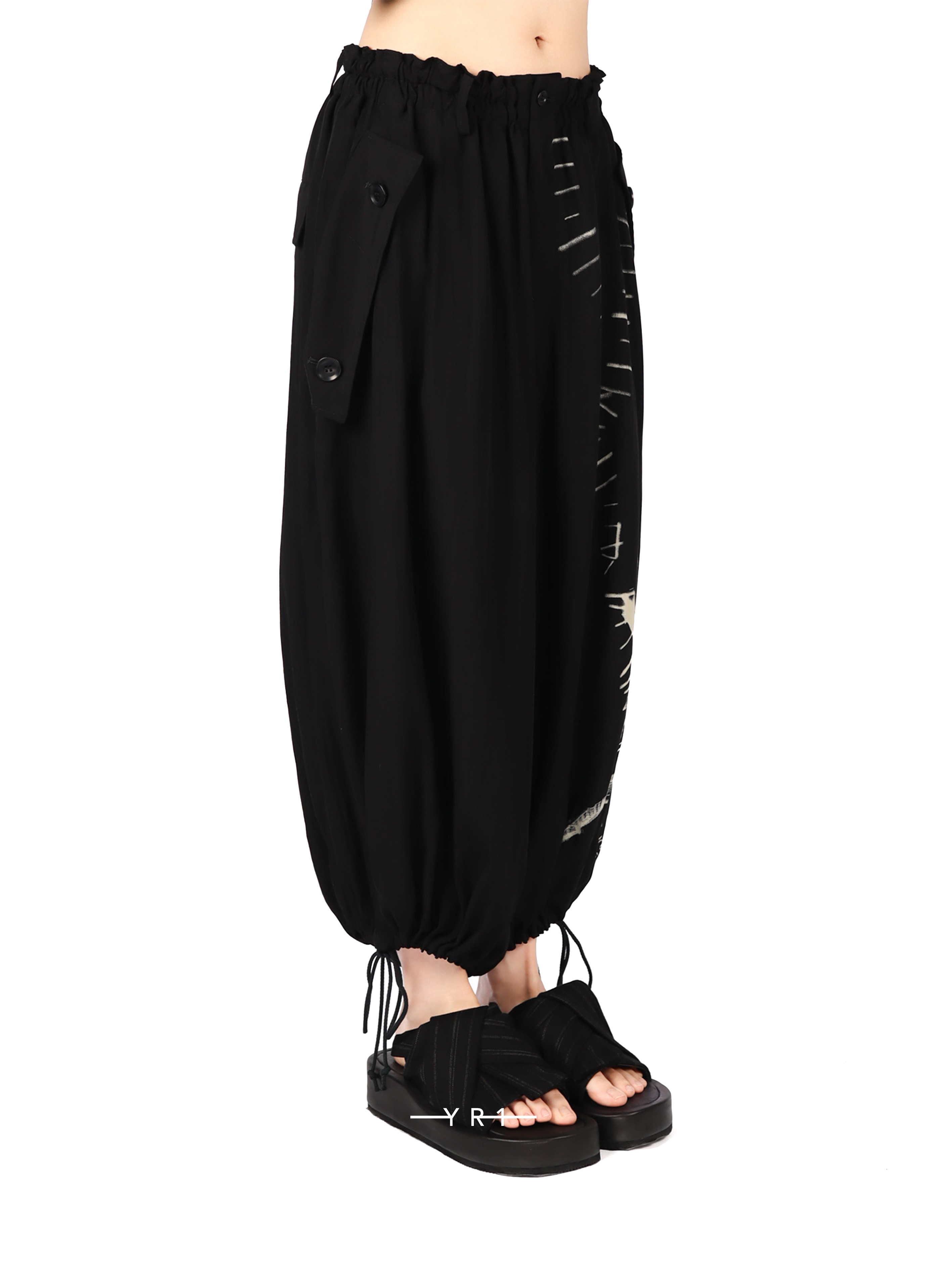 采用铜氨纤维面料,饰有以拔染工艺印制的“Y”字图案。裤子正面有大口袋,腰部配有抽绳,可调节尺寸。
