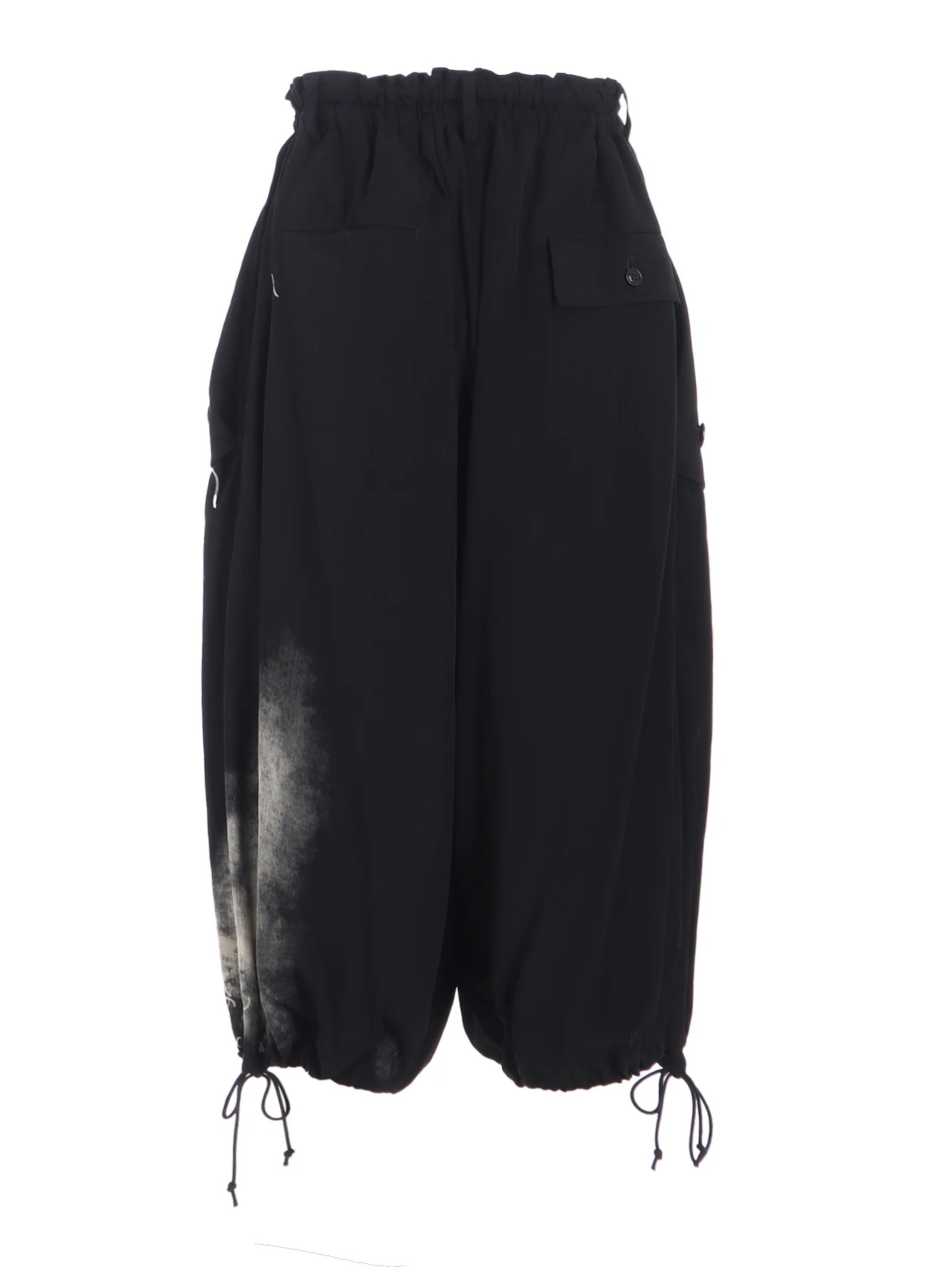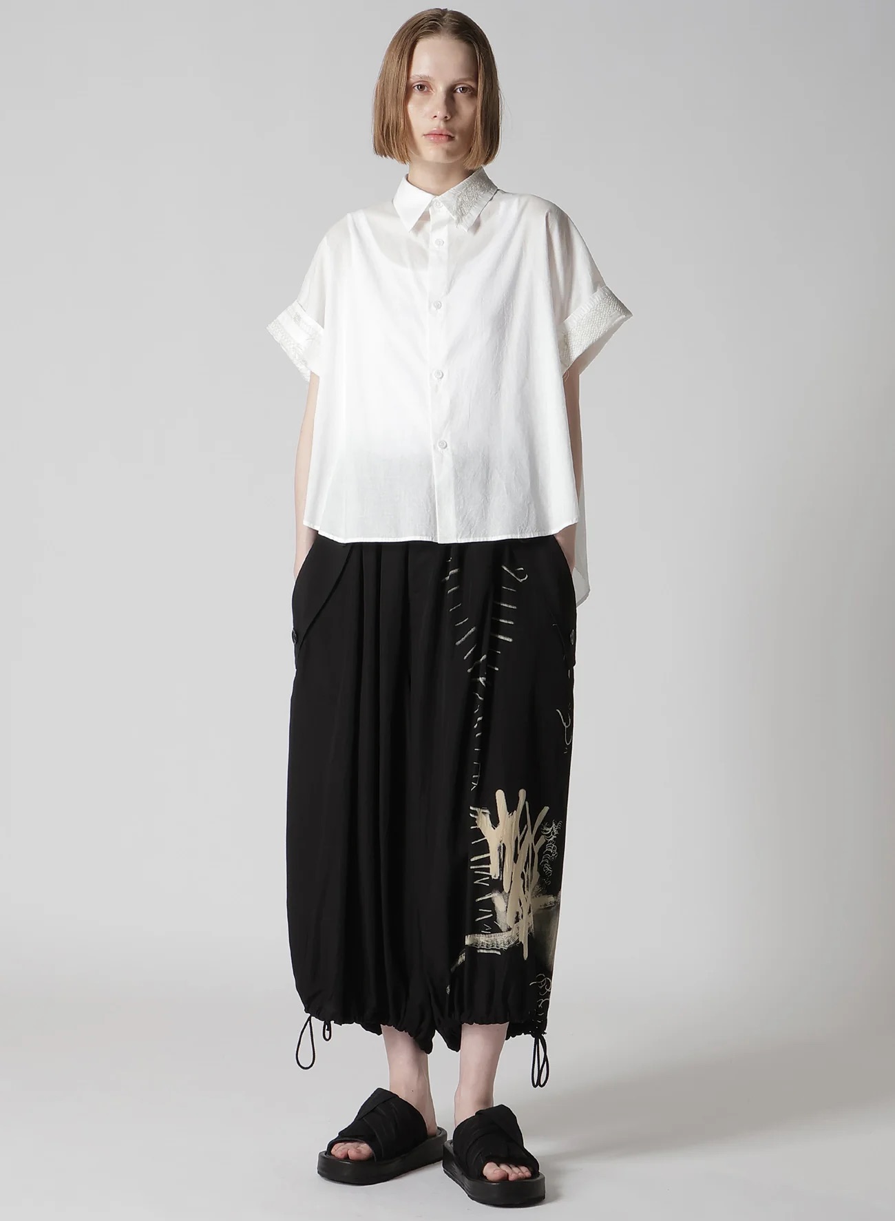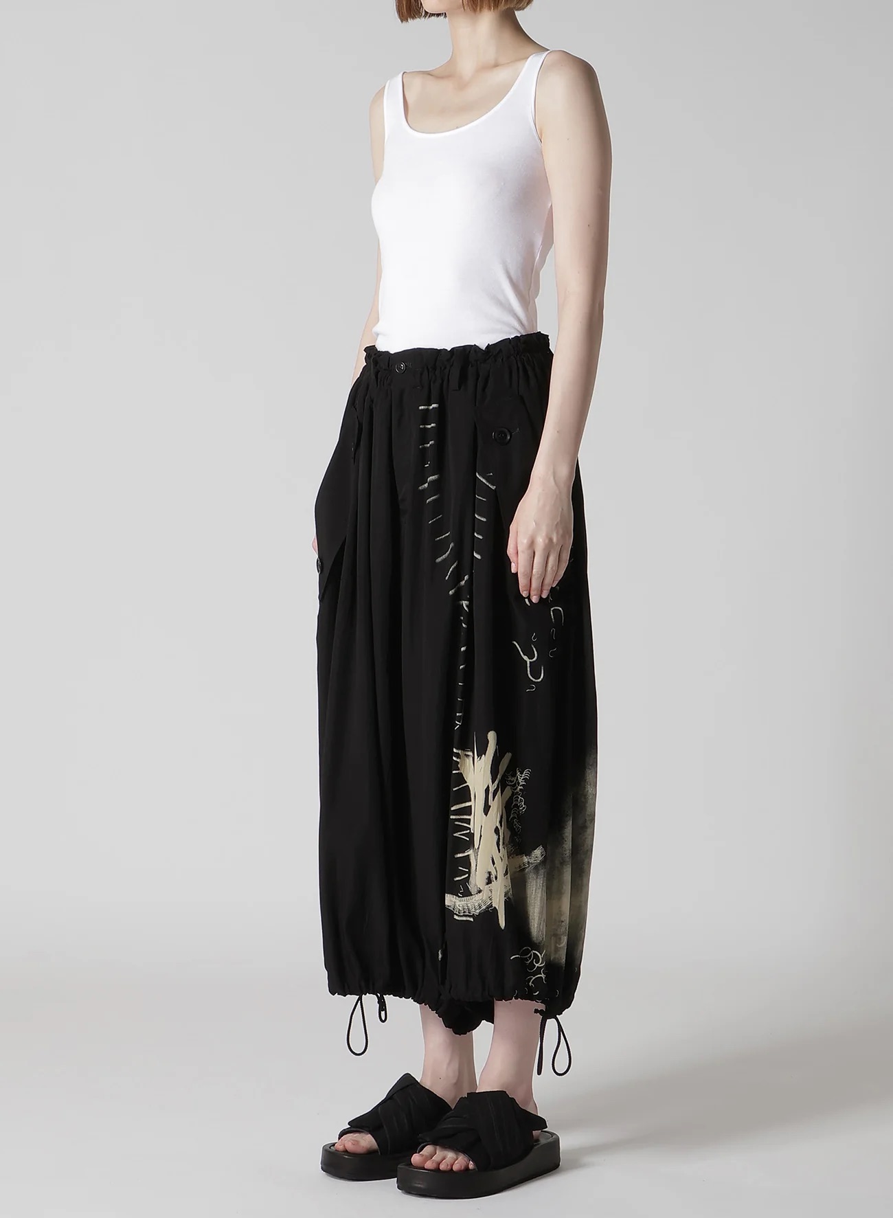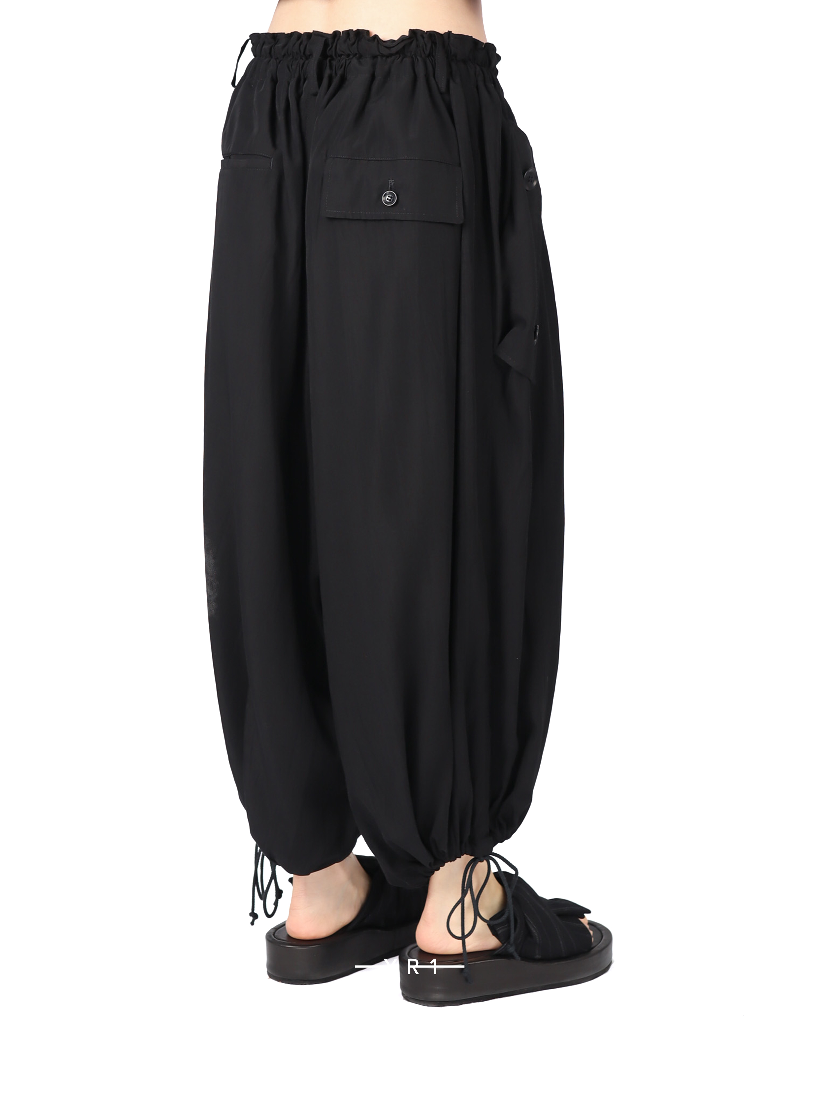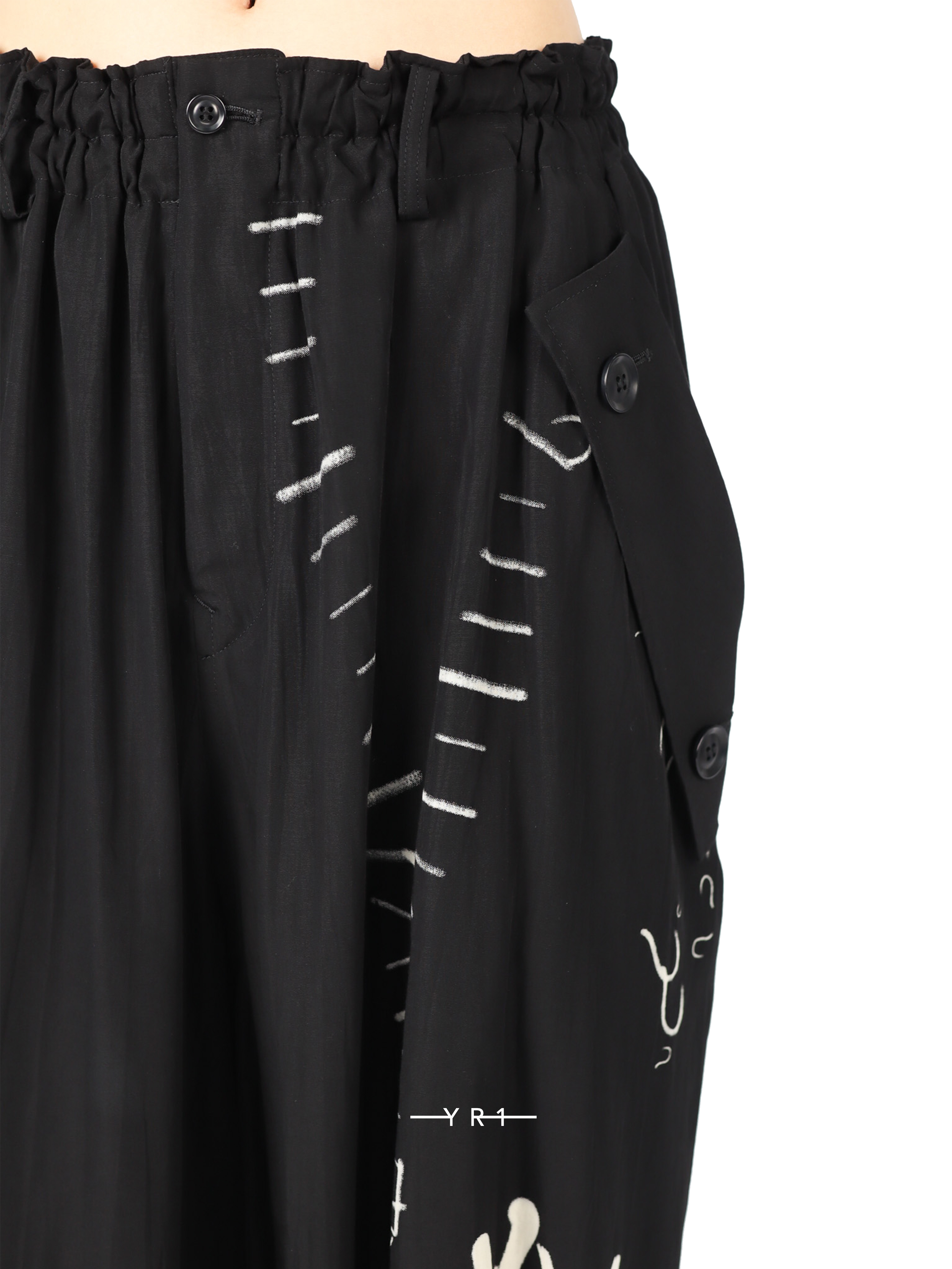 采用铜氨纤维面料,饰有以拔染工艺印制的“Y”字图案。裤子正面有大口袋,腰部配有抽绳,可调节尺寸。