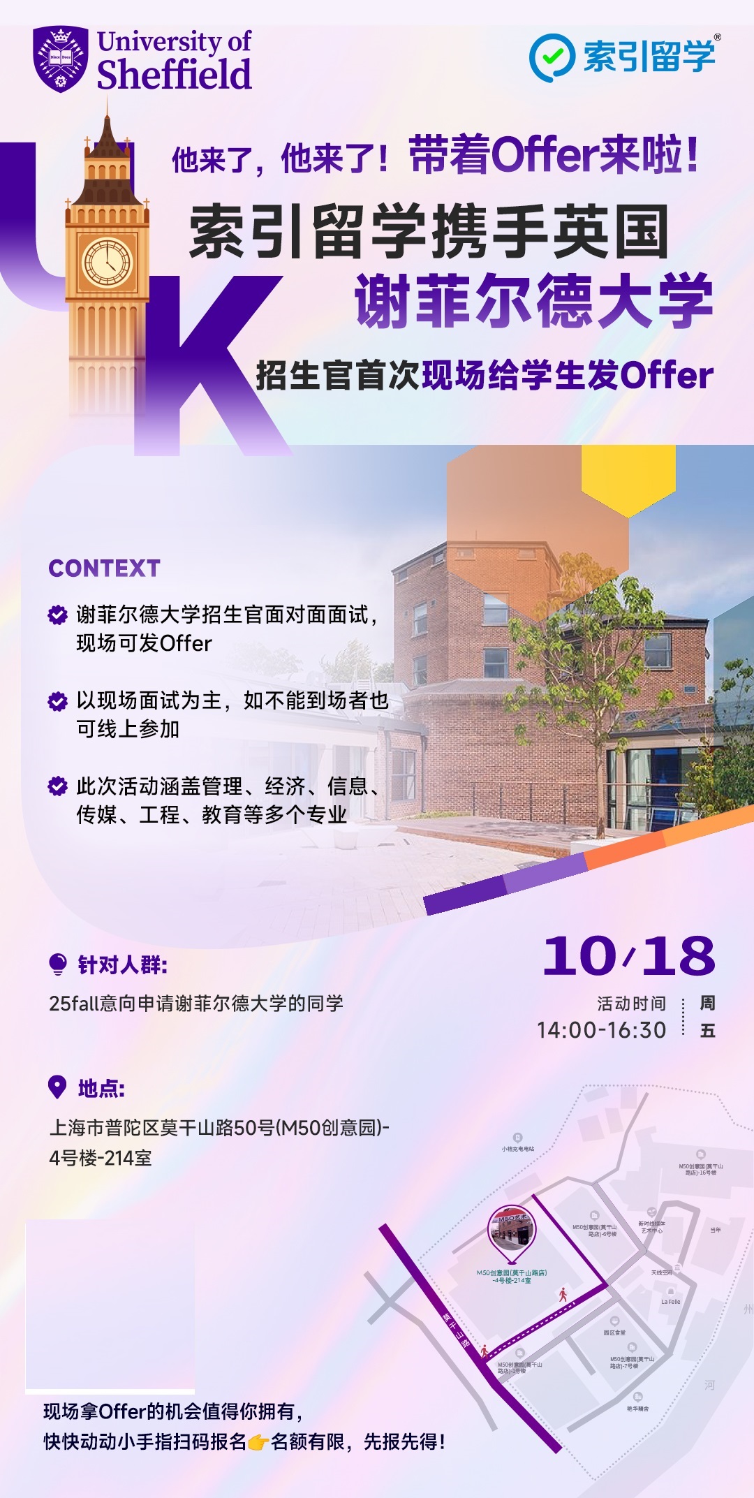 他来了,他来了!带着Offer来啦!索引留学携手英国谢菲尔德大学,招生官首次现场给学生发Offer