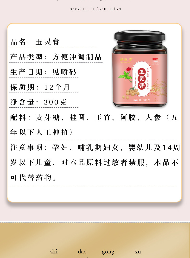 配料成分:麦芽糖、桂圆、玉竹、阿胶、人参(五年以下人工种植)