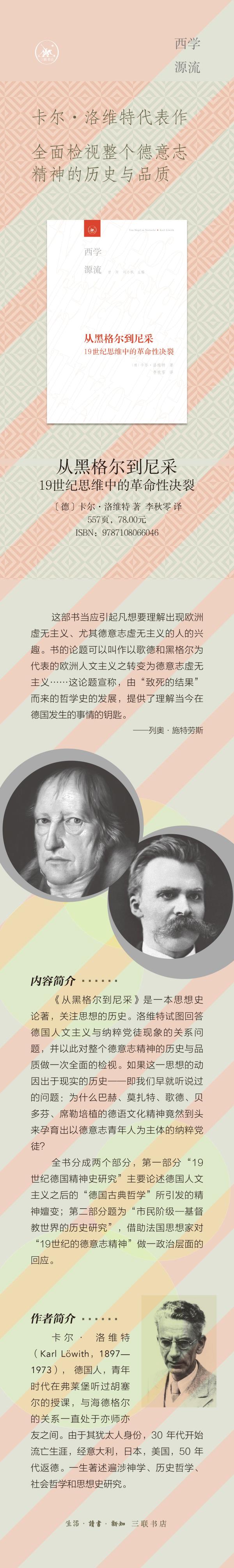 编辑推荐 《从黑格尔到尼采》是德国著名思想家卡尔·洛维特的代表作之一。卡尔·洛维特是海德格尔最早的学生,并同他一直保持着亦师亦友的身份。在发表此书之前,洛维特已经出版过一些论著,但直到此书出版才使他获得广泛的学术声誉。列奥·施特劳斯认为评价此书:“这部书当应引起凡想要理解出现欧洲虚无主义、尤其德意志虚无主义的人的兴趣。书的论题可以叫作以歌德和黑格尔为代表的欧洲人文主义之转变为德意志虚无主义……这论题宣称,由“致死的结果”而来的哲学史的发展,提供了理解当今在德国发生的事情的钥匙。”