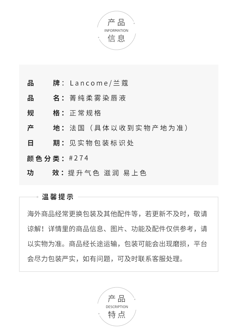 兰蔻菁纯柔雾小蛮腰水唇釉 水润雾面持久显白 #274 #275 #279 #291 #312 #313 #196 #188【CDF】