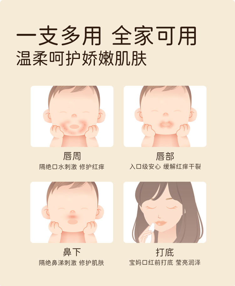 适用于儿童口水疹、口周湿疹等红痒发作期的止痒隔离唇膏,也可用于日常的预防口水疹和口周湿疹的唇膏。