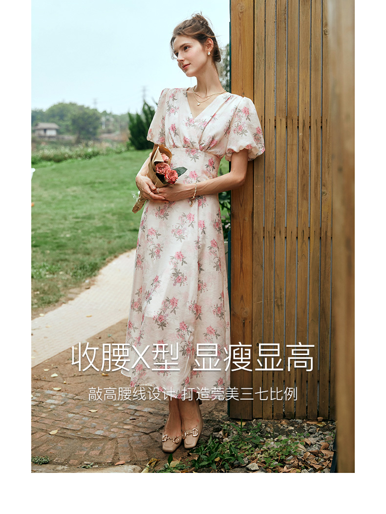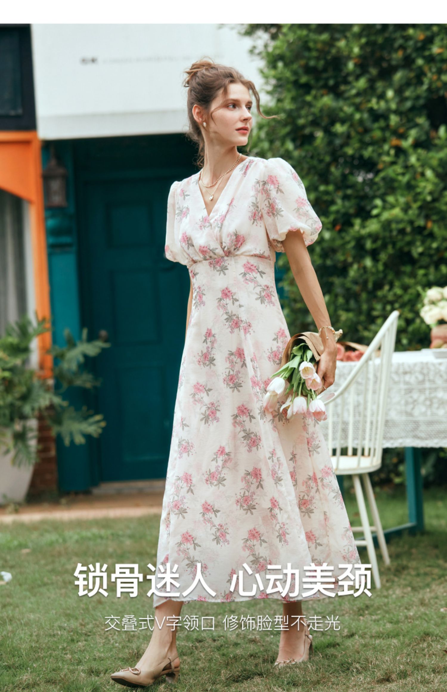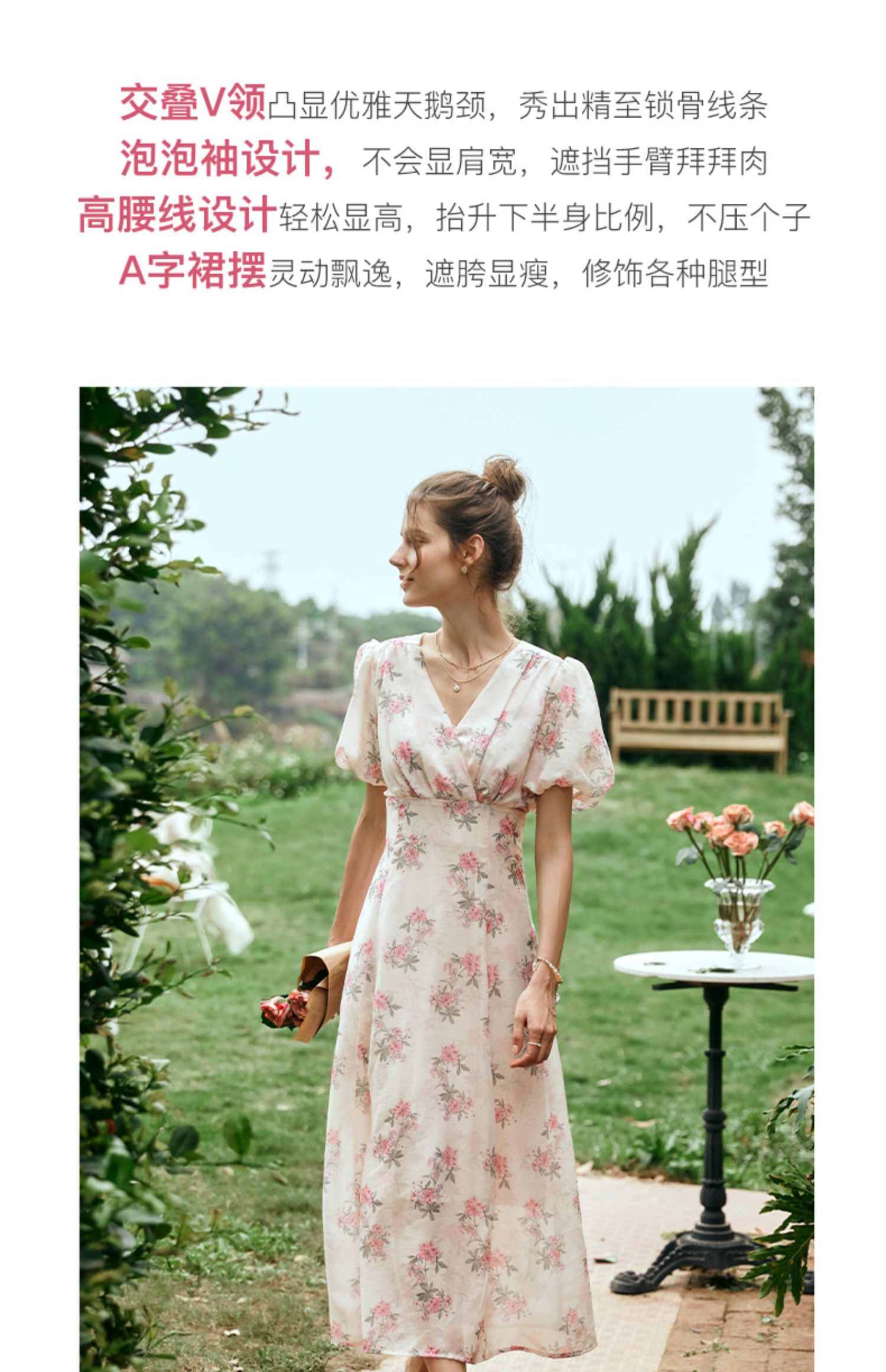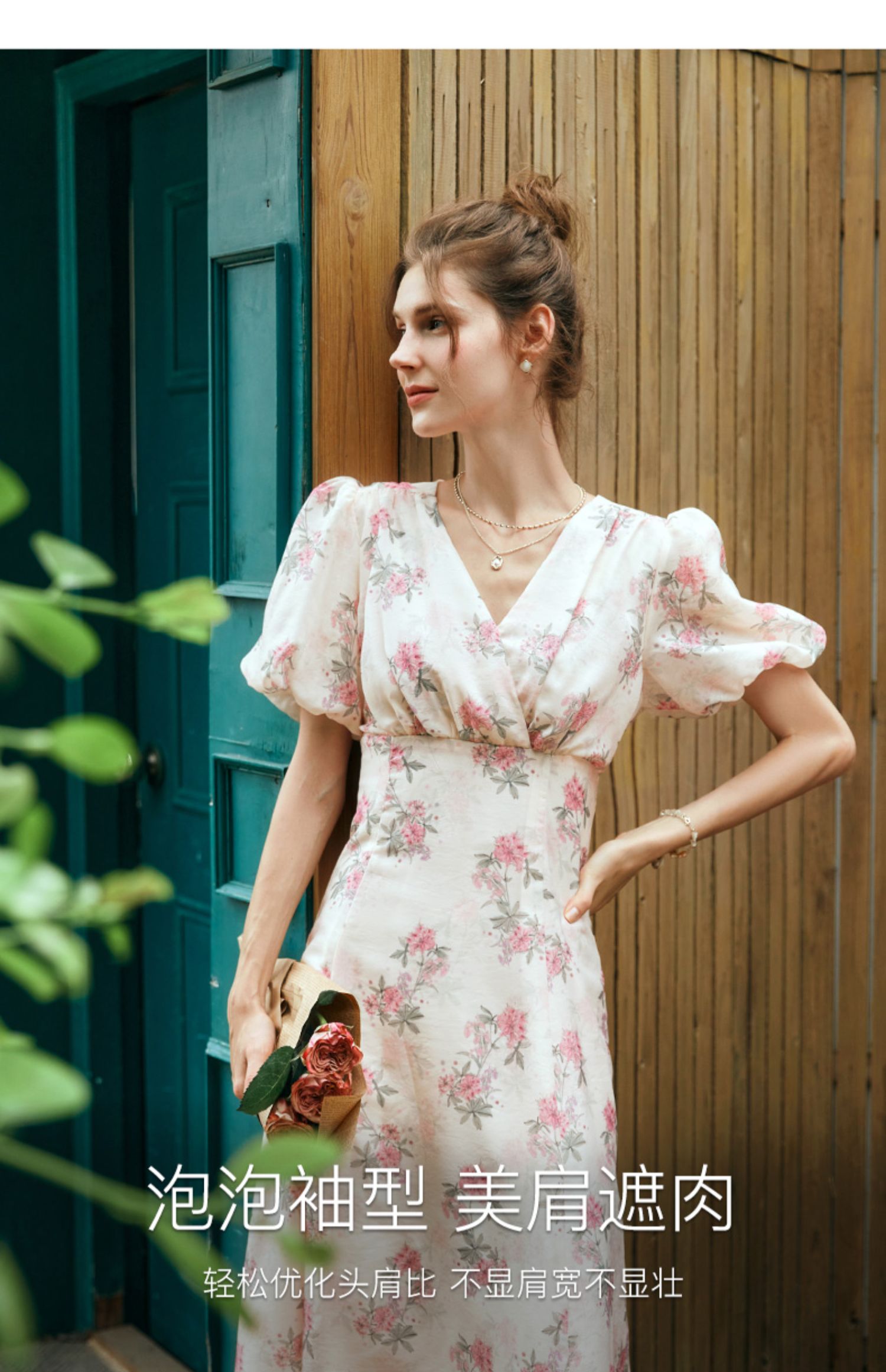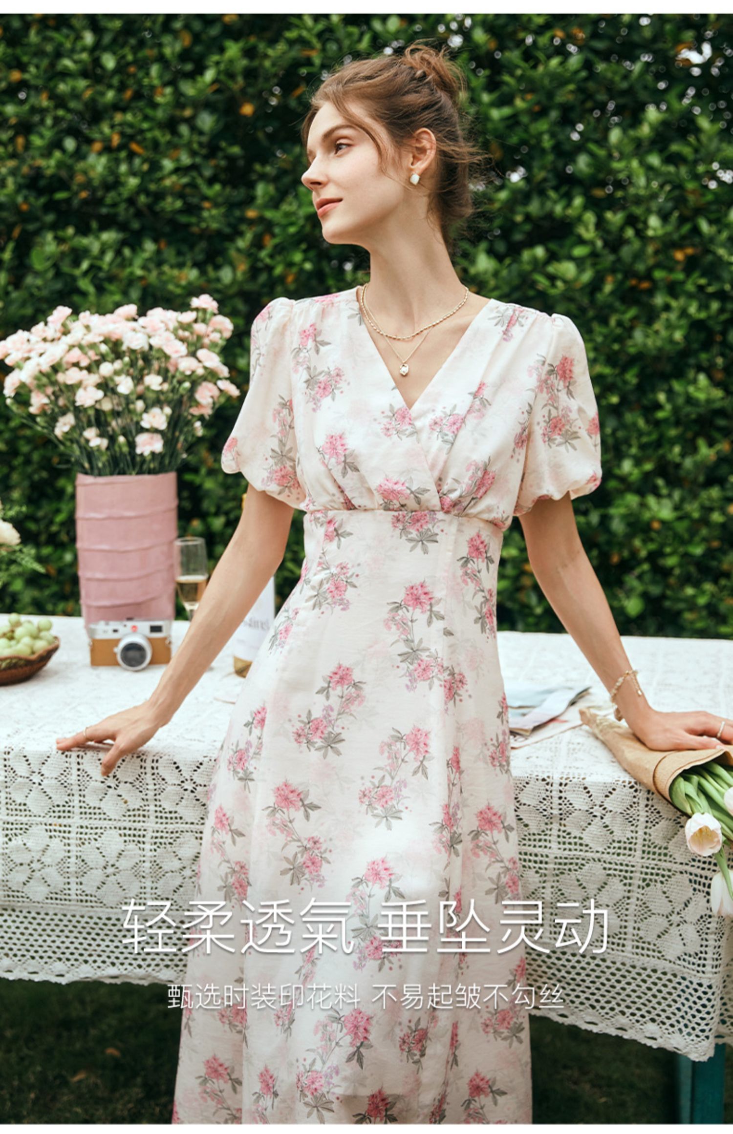 OLrain欧芮儿法式V领连衣裙女夏季2024年新款茶歇泡泡袖碎花长裙