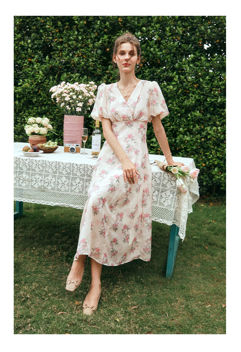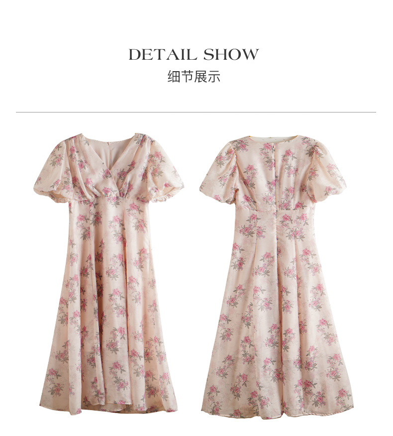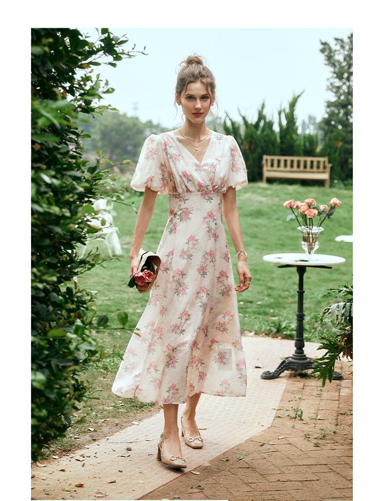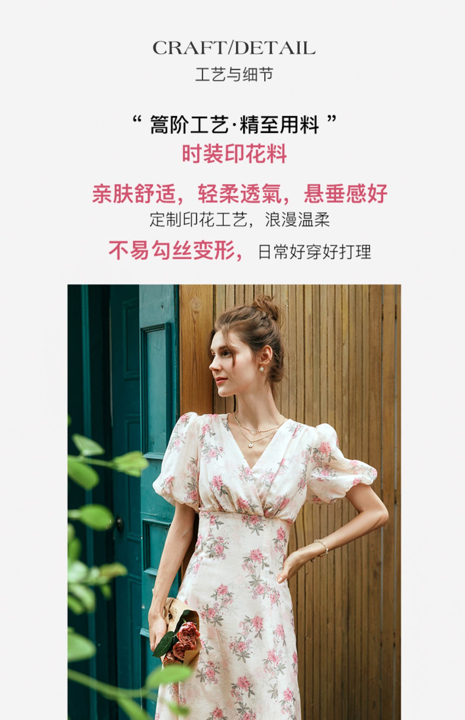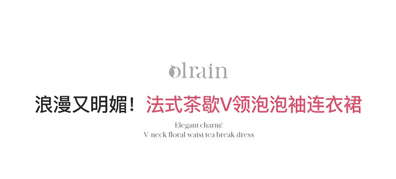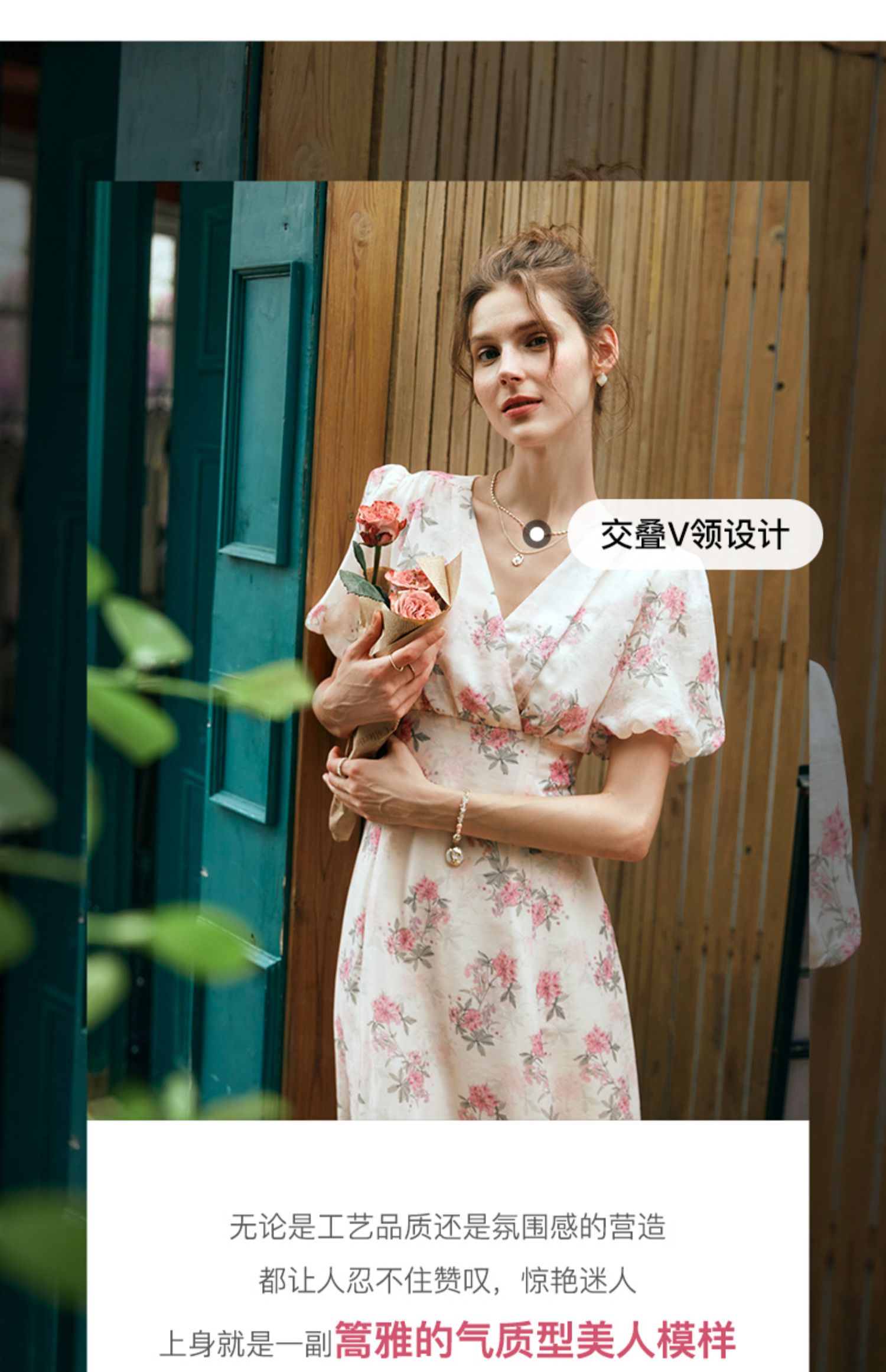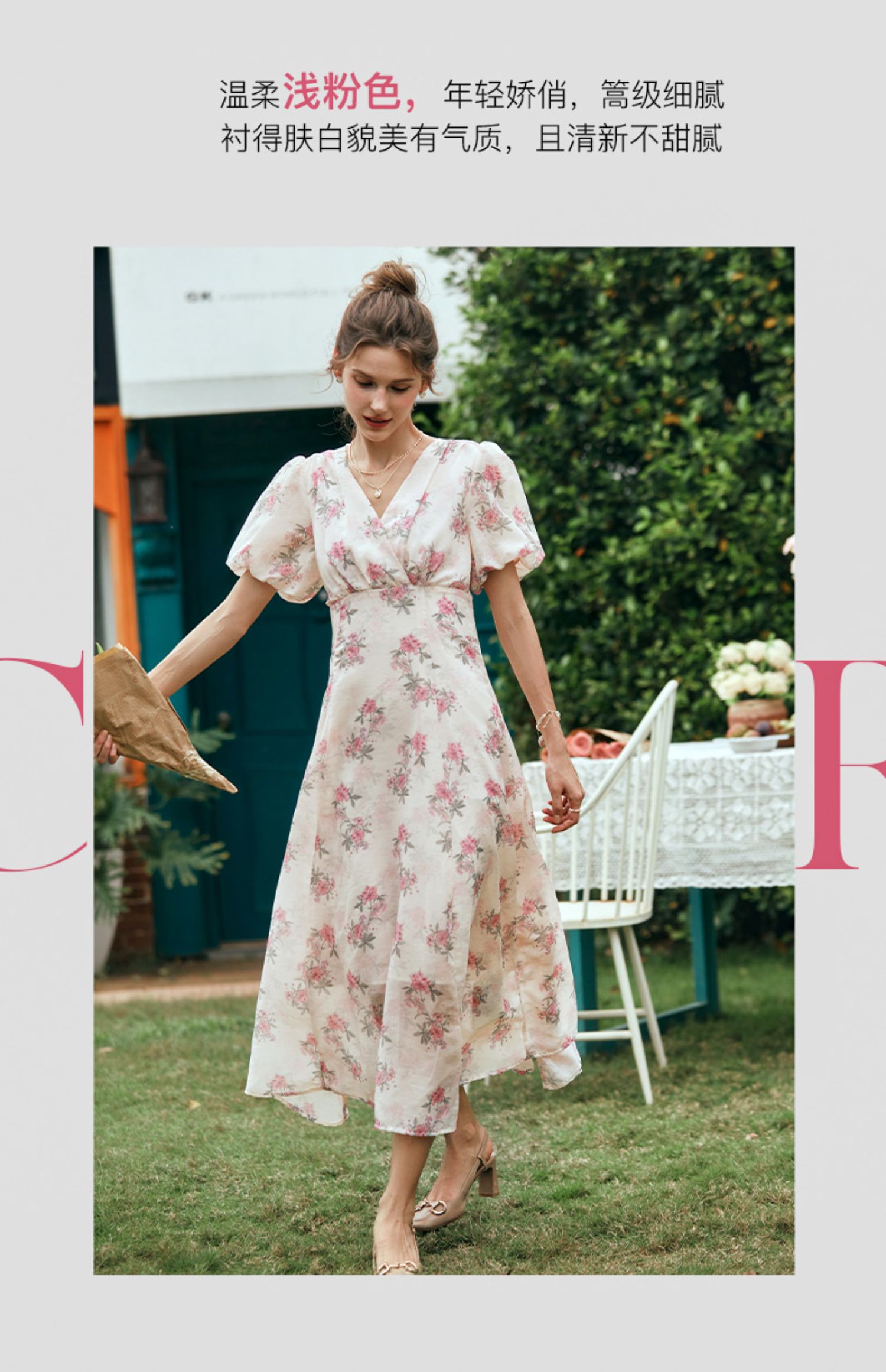 OLrain欧芮儿法式V领连衣裙女夏季2024年新款茶歇泡泡袖碎花长裙