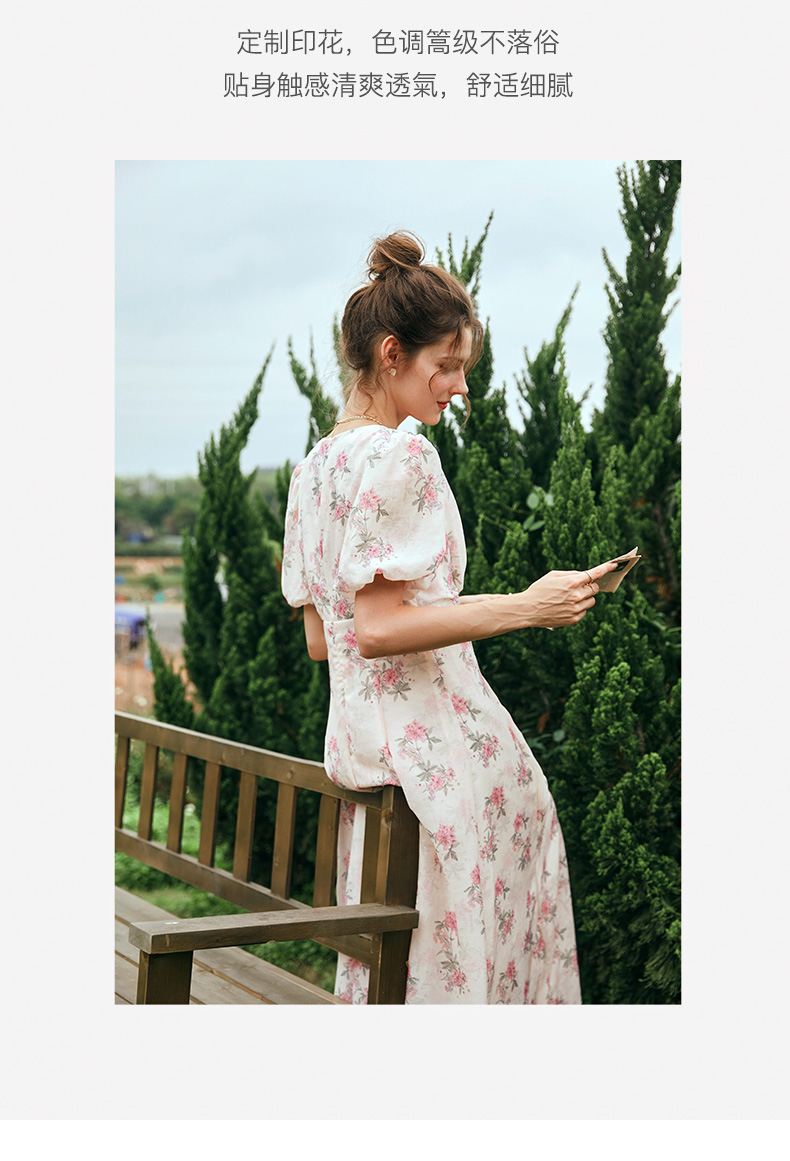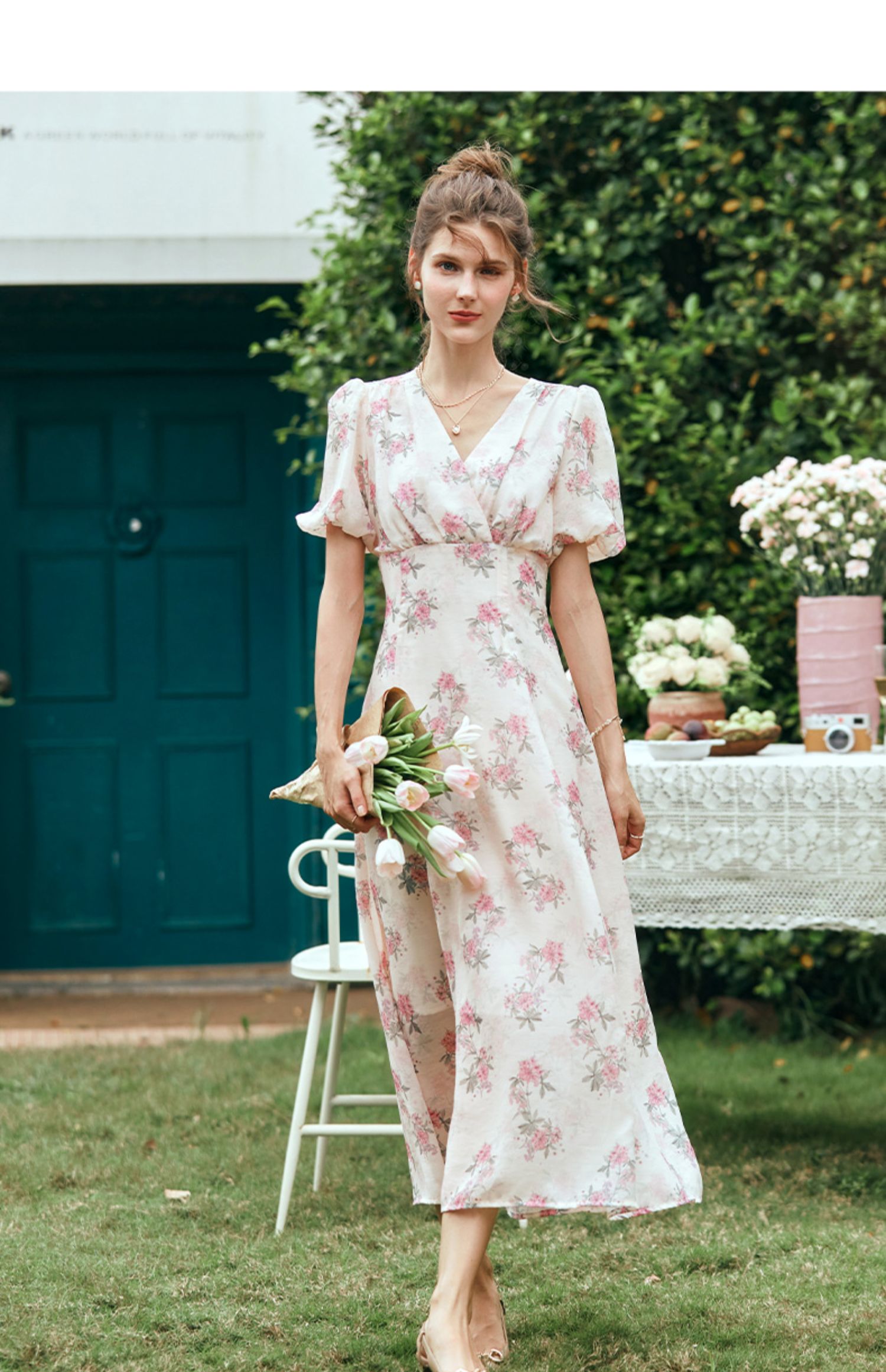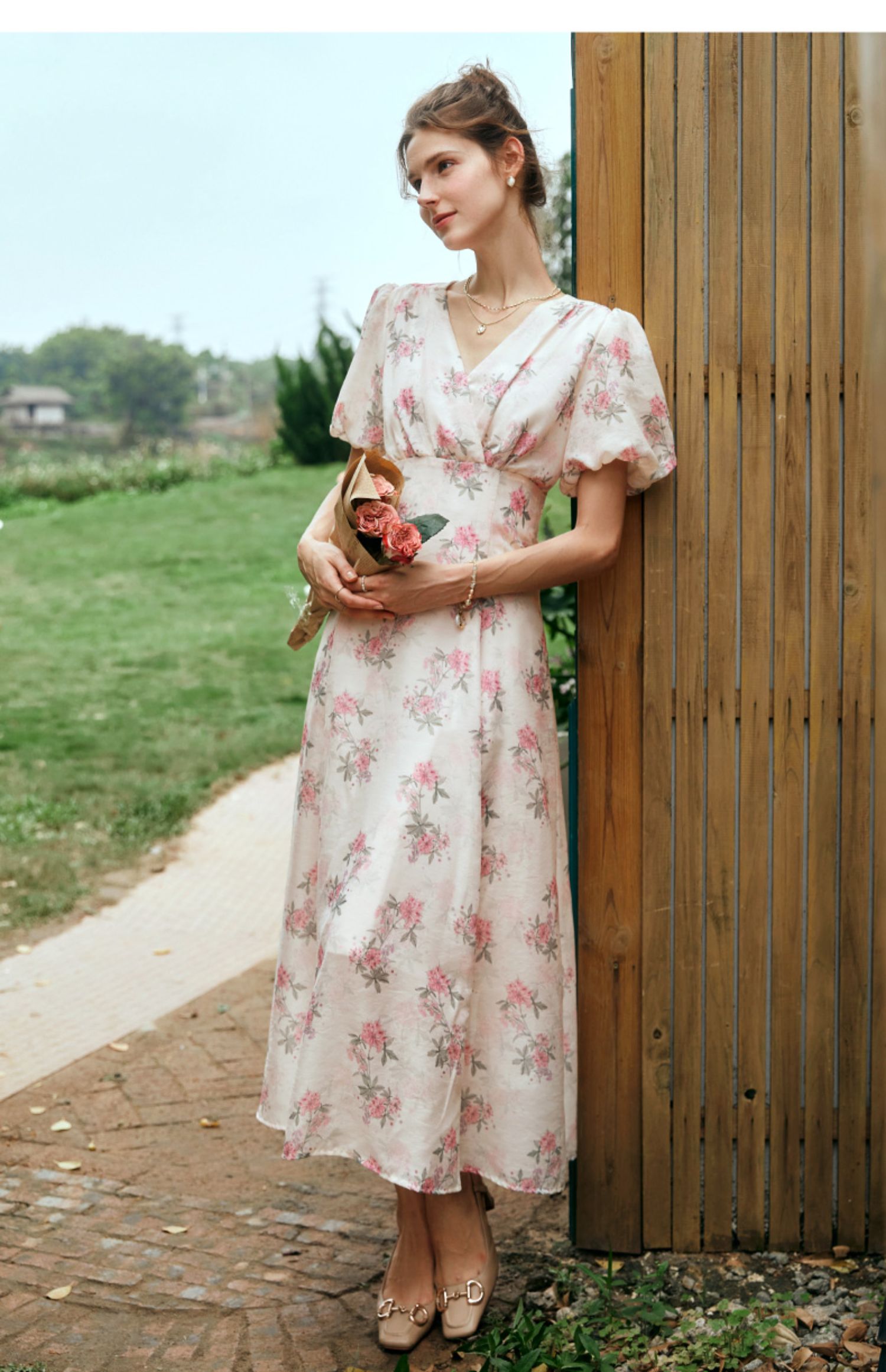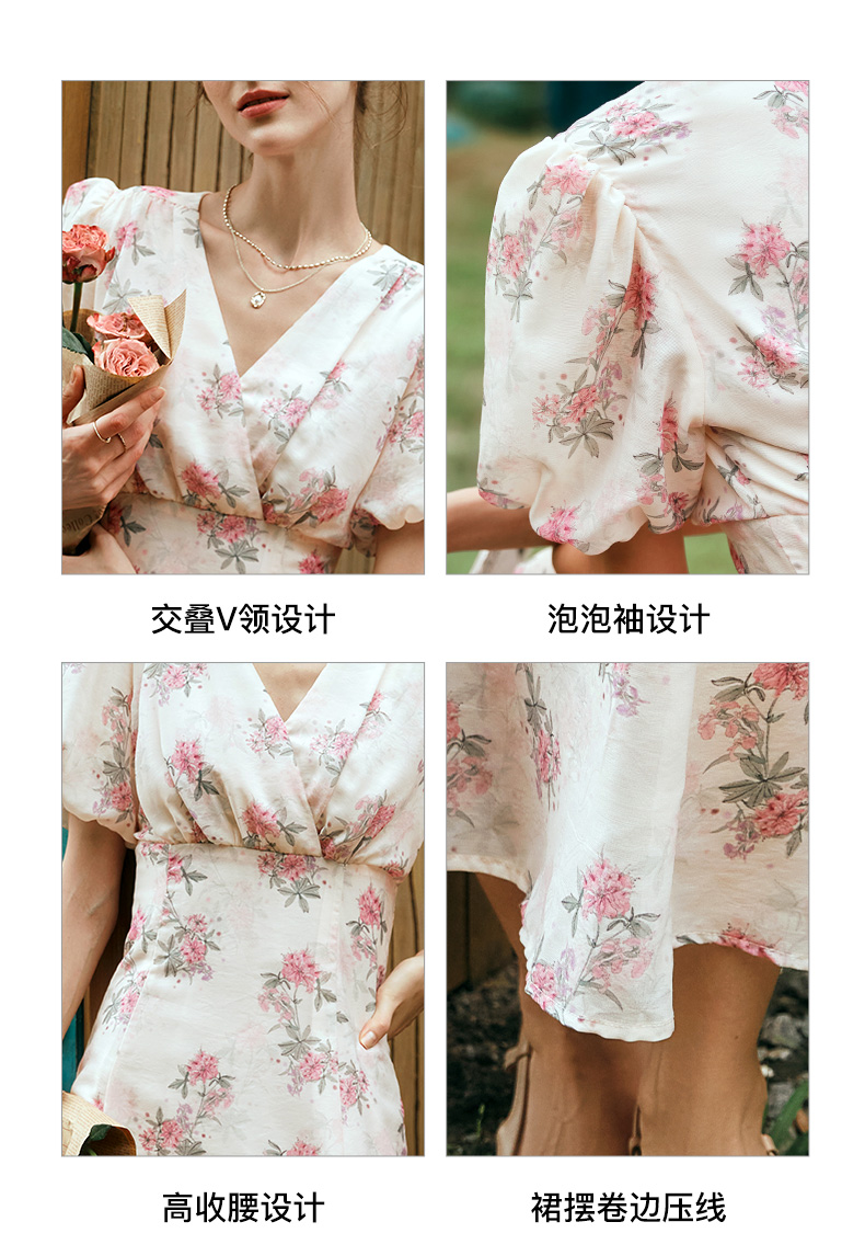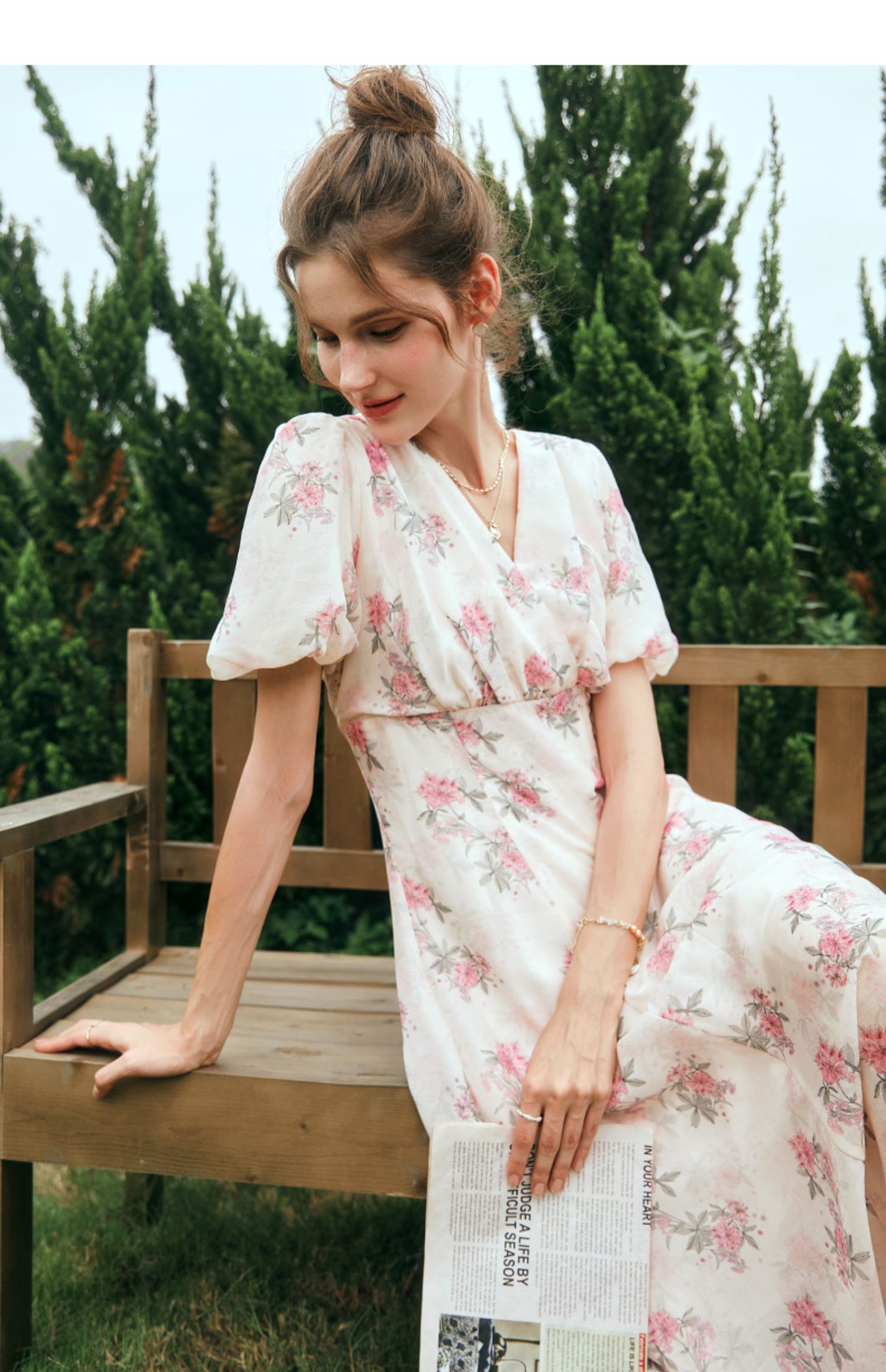 OLrain欧芮儿法式V领连衣裙女夏季2024年新款茶歇泡泡袖碎花长裙