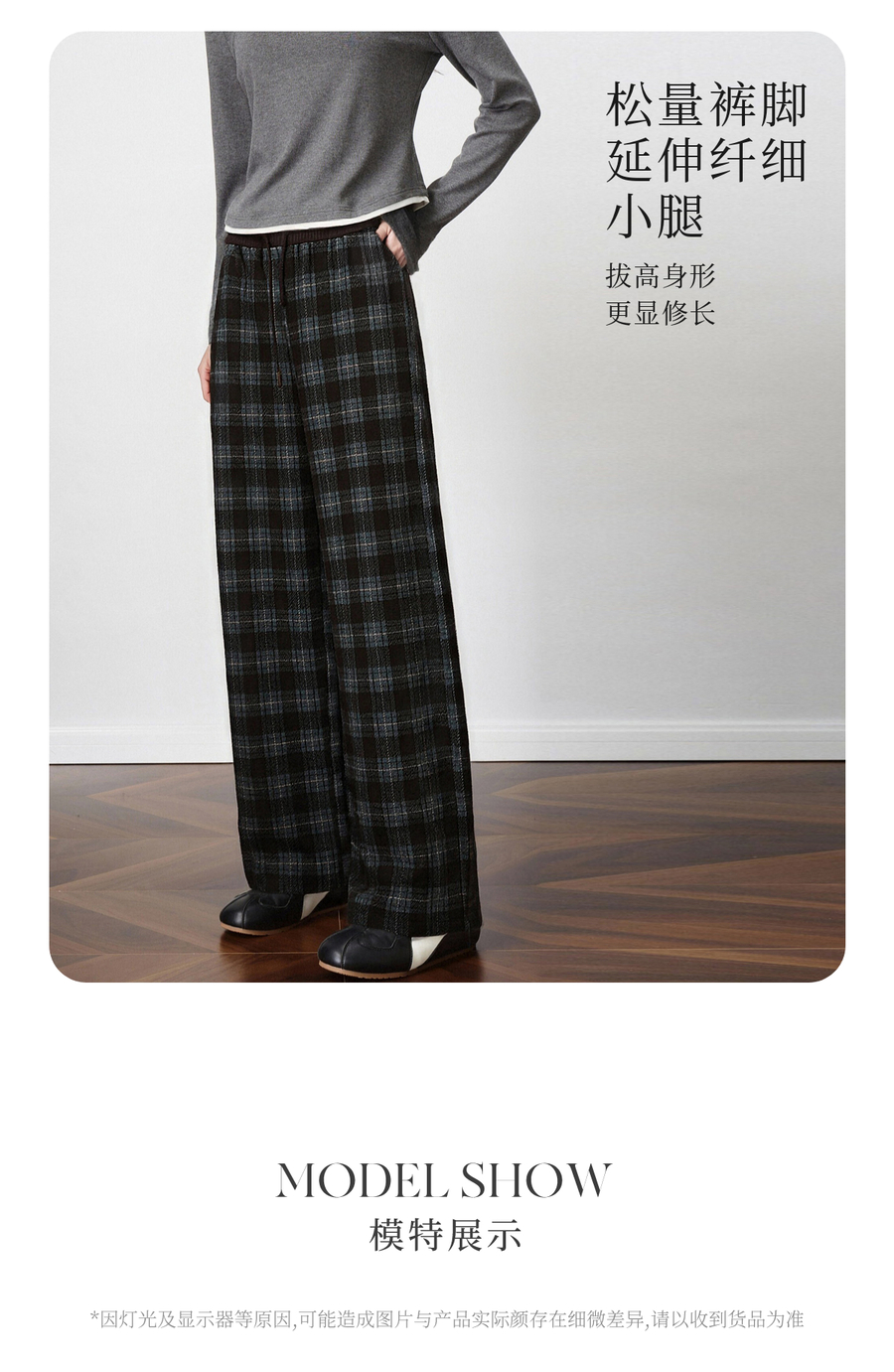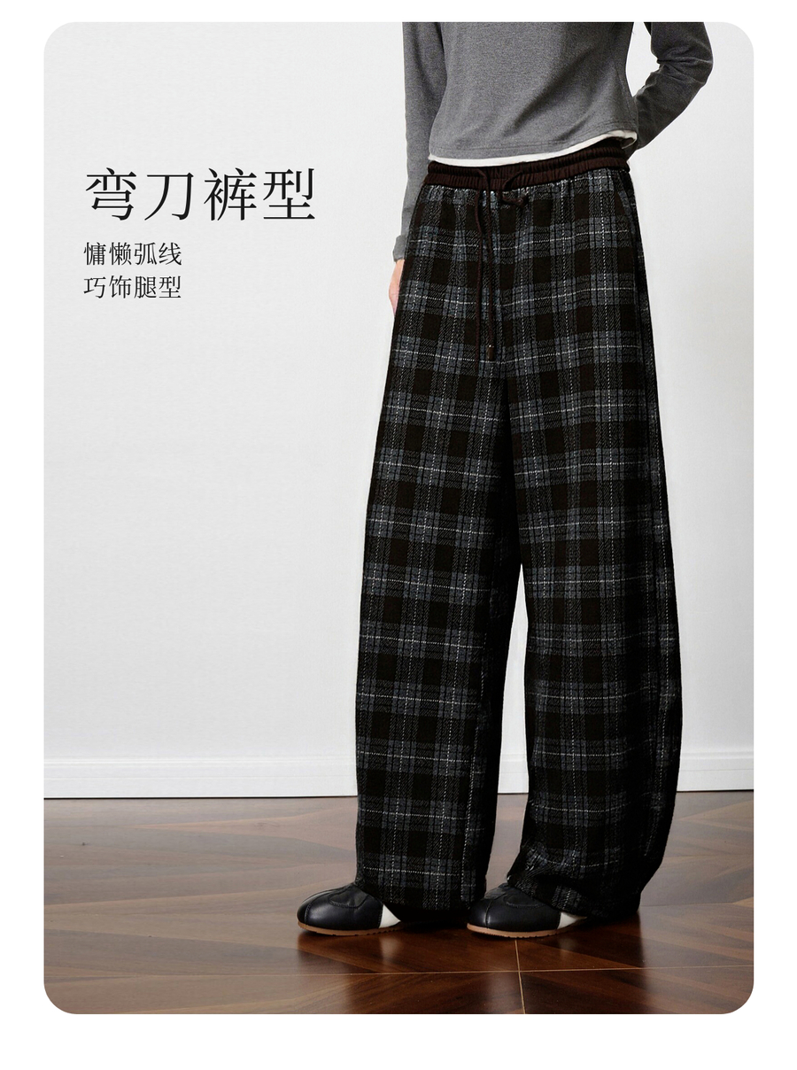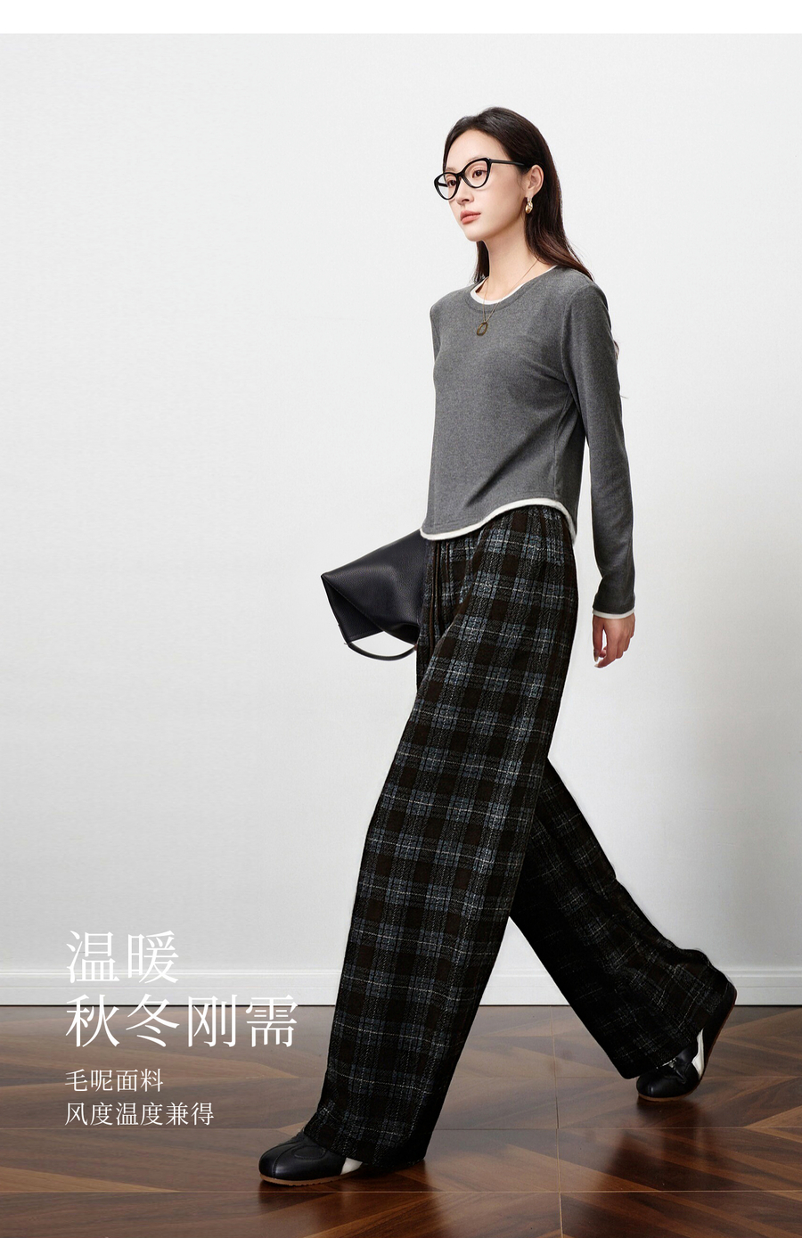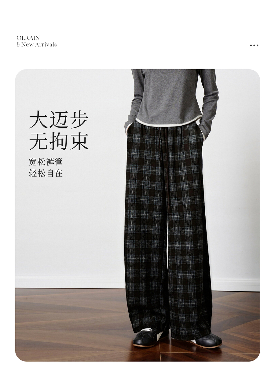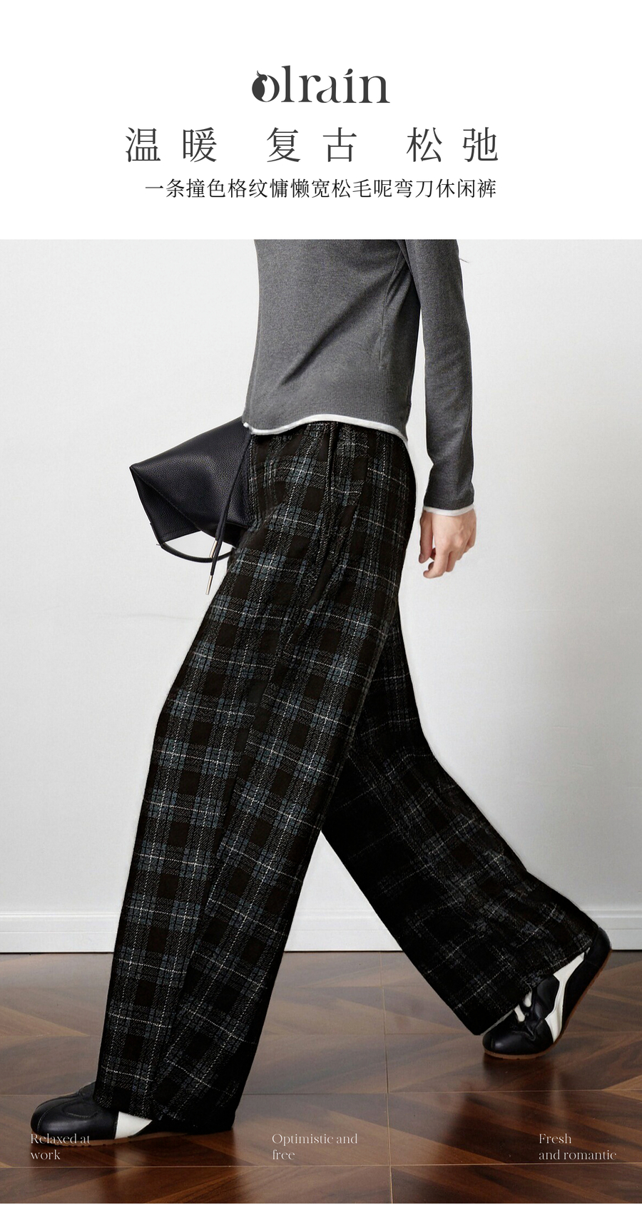 OLrain欧芮儿2025新款女冬季撞色格子慵懒宽松毛呢弯刀休闲裤长裤