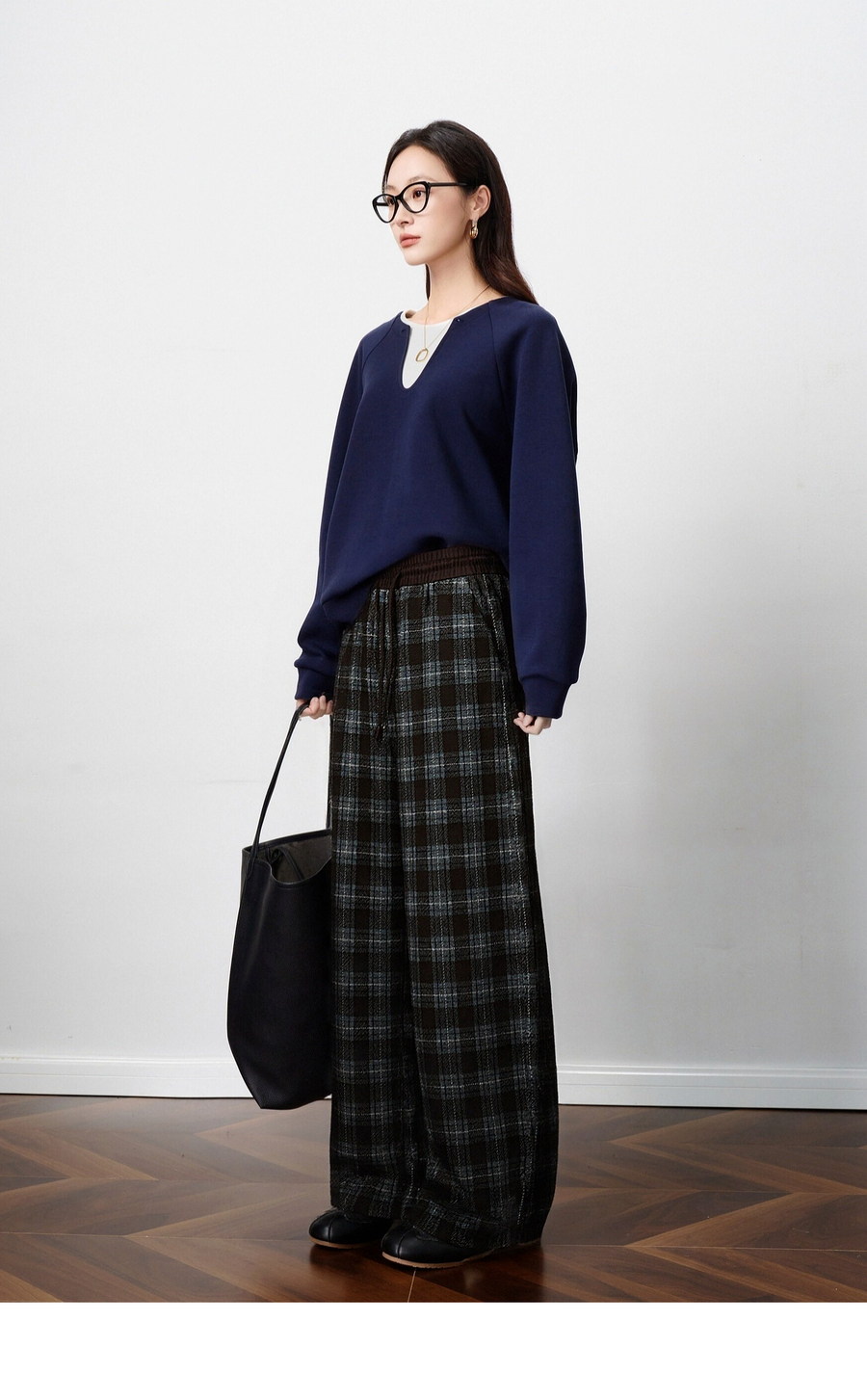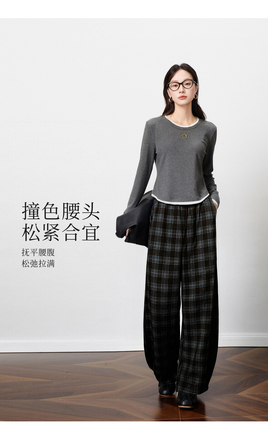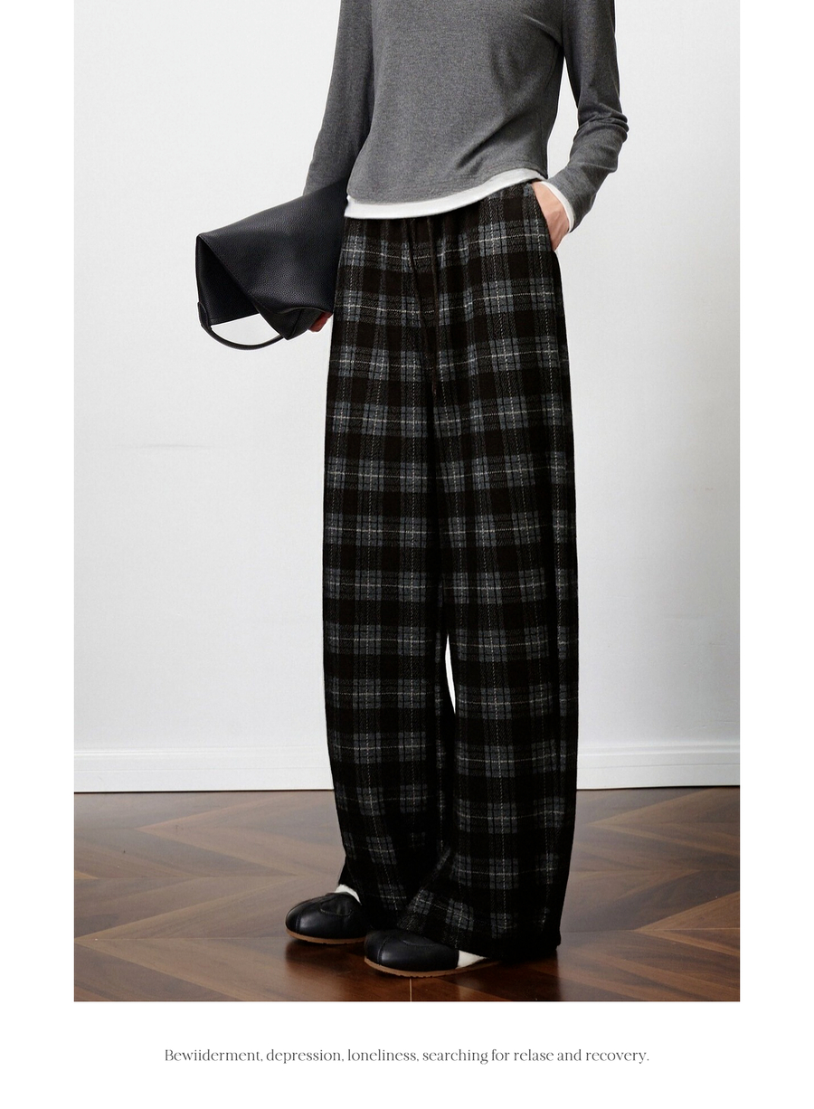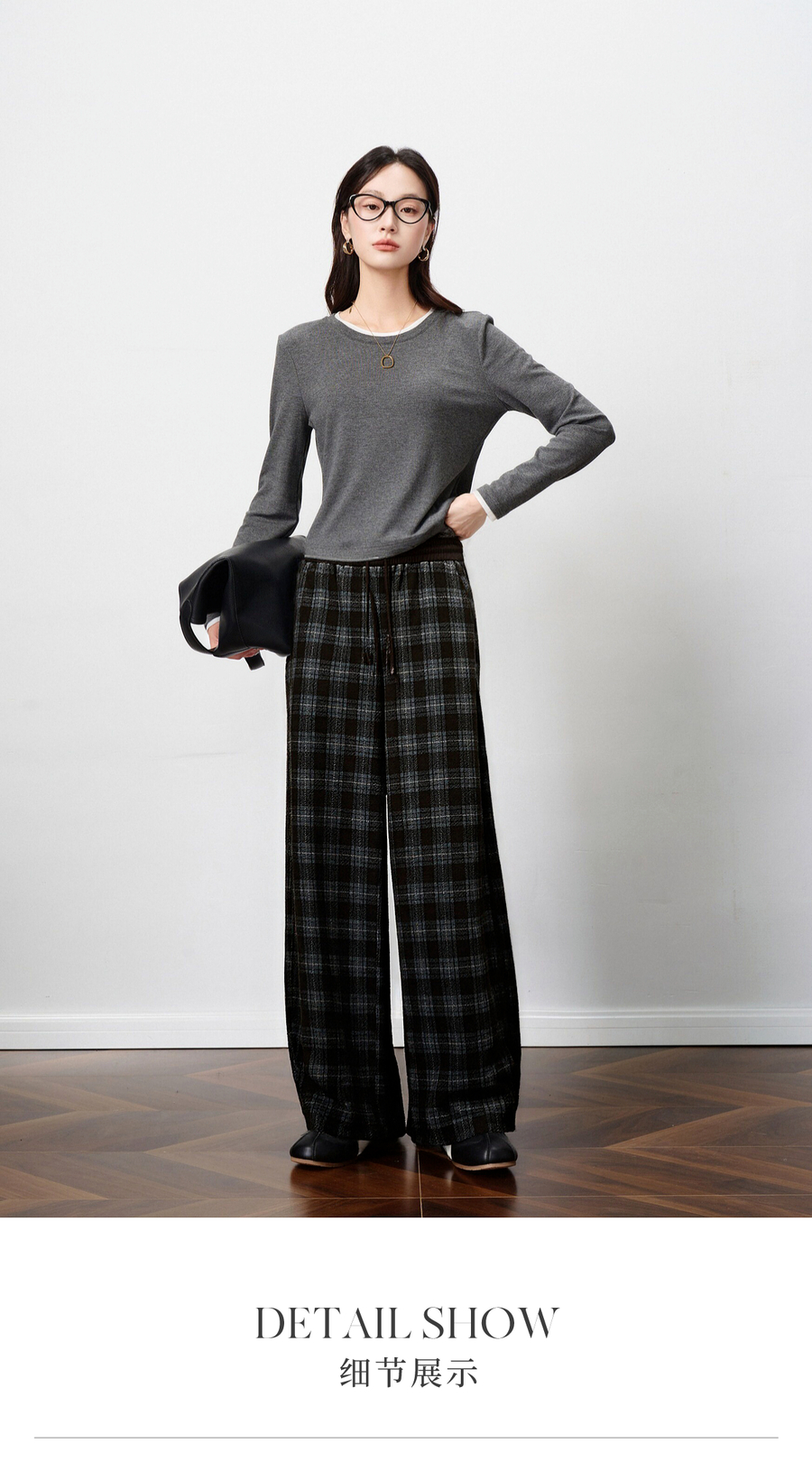 OLrain欧芮儿2025新款女冬季撞色格子慵懒宽松毛呢弯刀休闲裤长裤