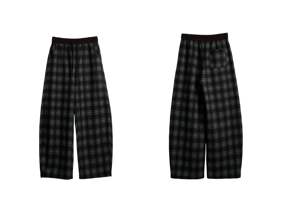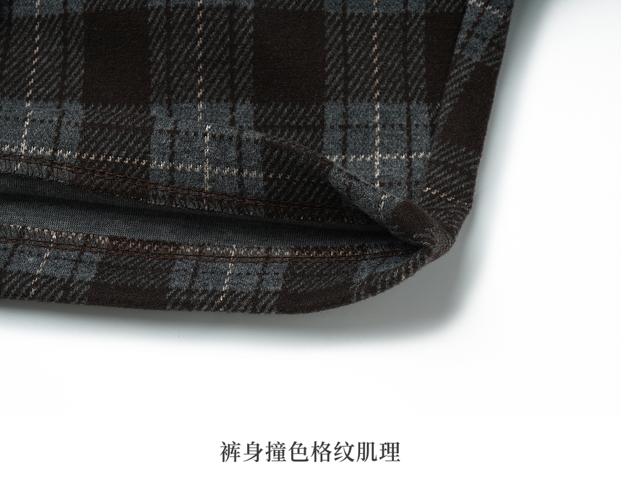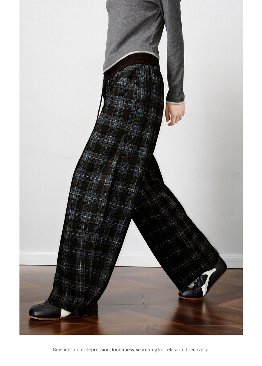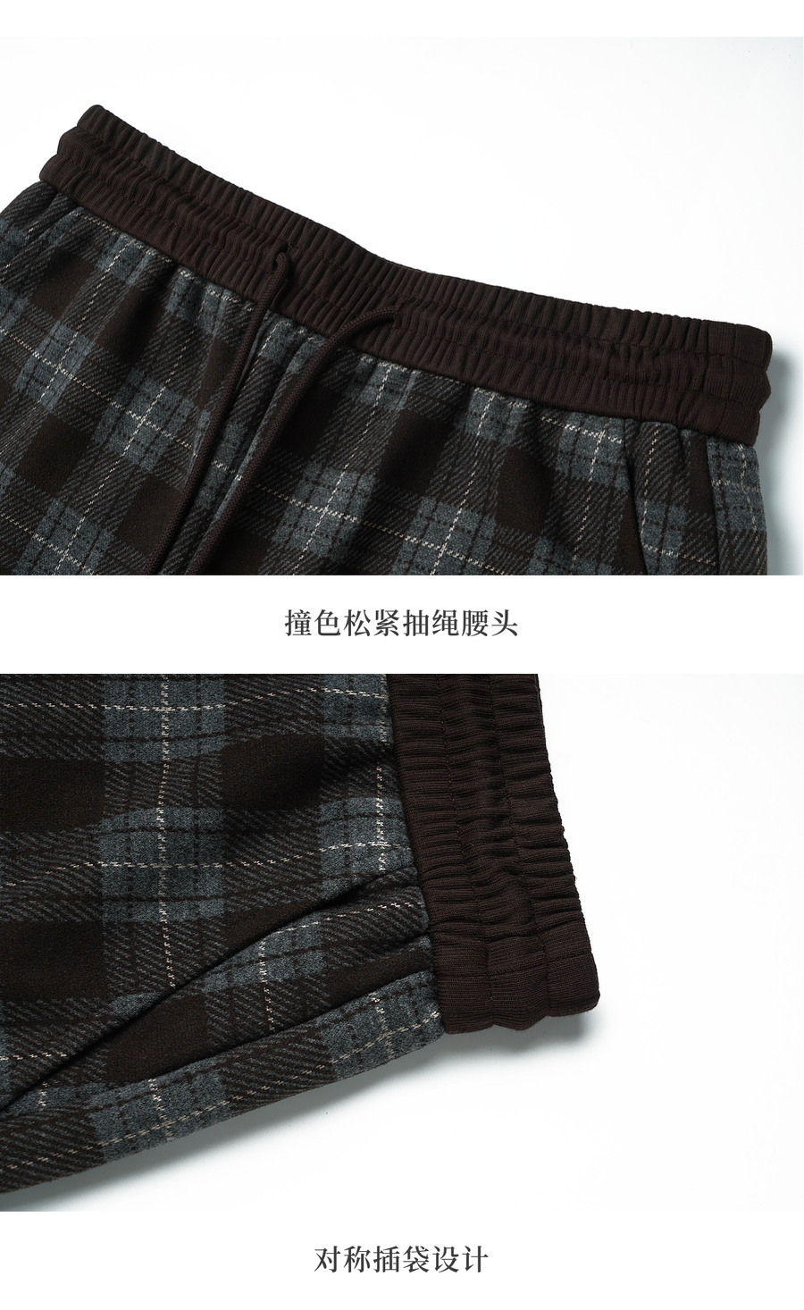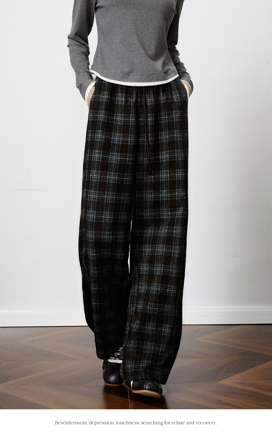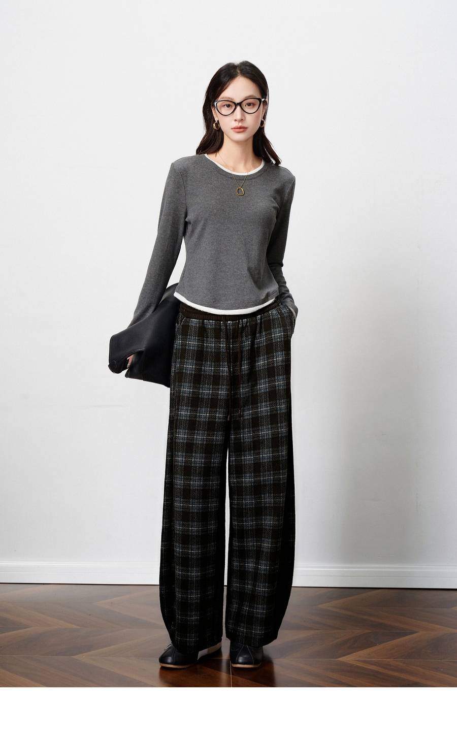OLrain欧芮儿2025新款女冬季撞色格子慵懒宽松毛呢弯刀休闲裤长裤