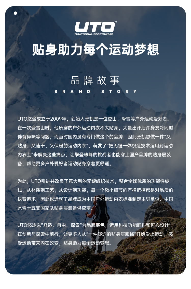 UTO悠途潜心于贴身运动装备的研发、设计和生产。从纤维到组织,从设计到工艺,在无缝贴身运动装备领域,树立国内标杆。 UTO着力于品牌互联网化,不断采集大量运动数据,为跑步、健身、滑雪等不同类型的运动爱