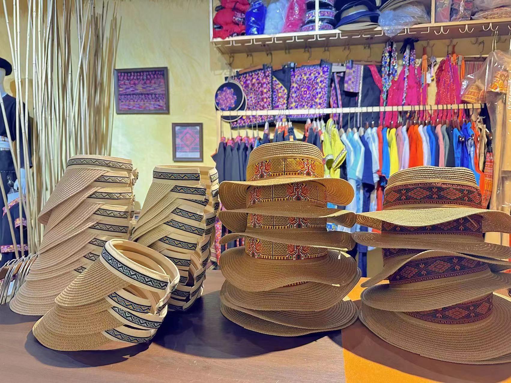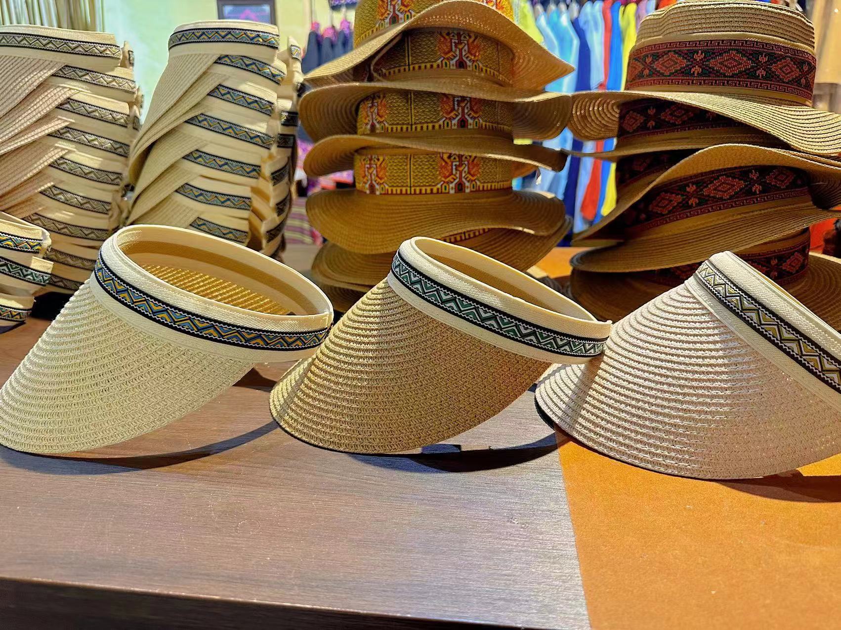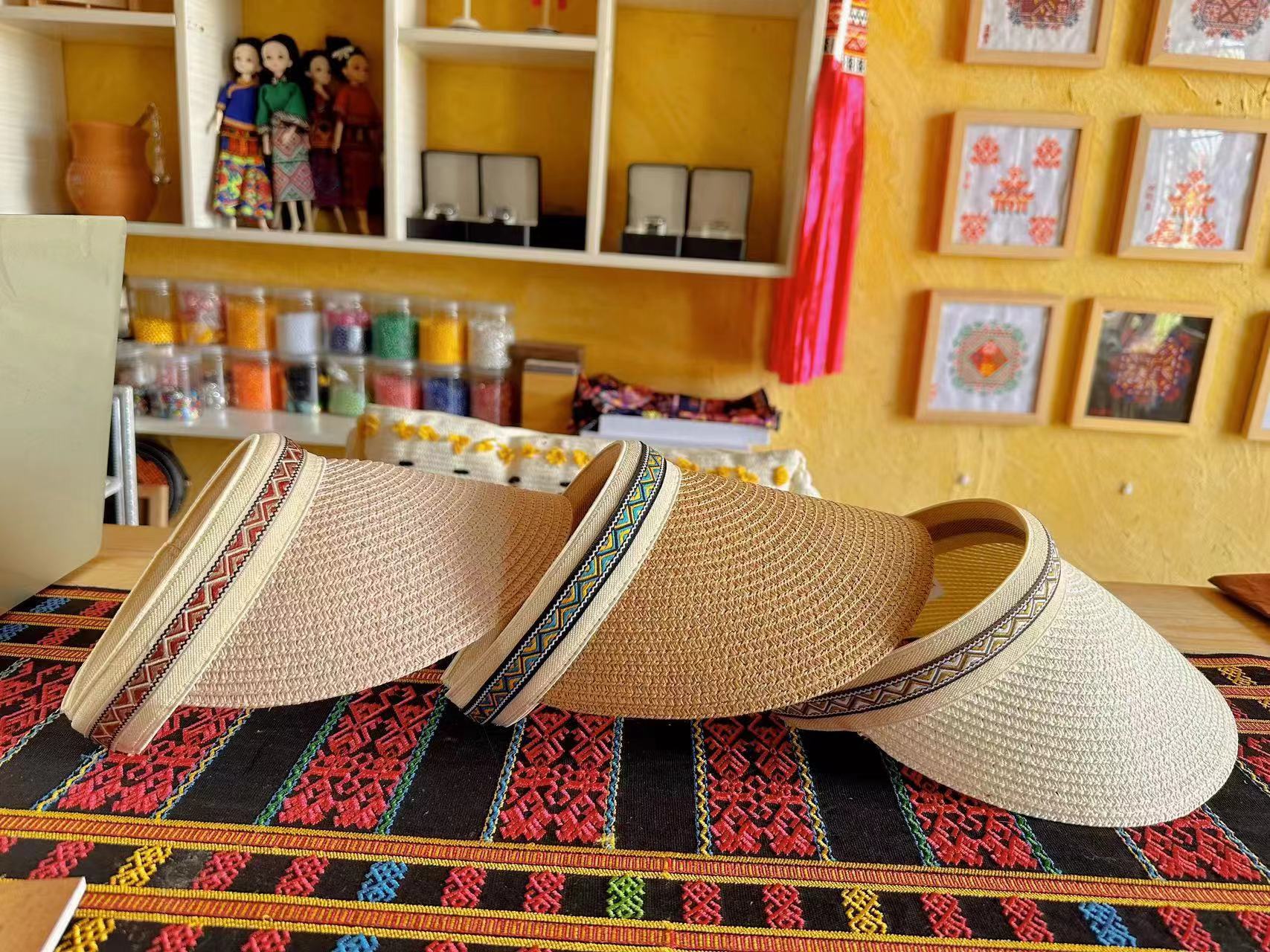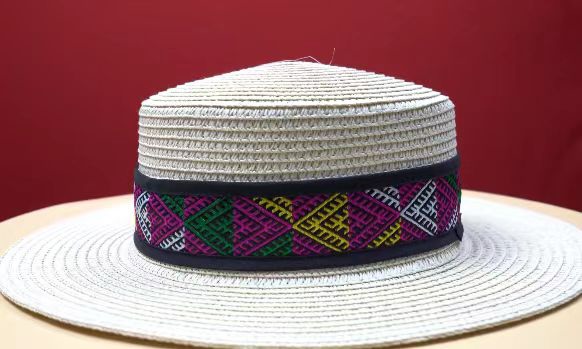黎锦花边帽子使用的是现代化机械生产的黎锦作为边框镶嵌于帽子之上,黎锦纹样色彩鲜艳、价格实惠、佩戴时尚。